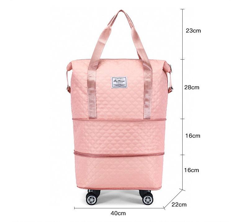 الشنطة دي تعتبر حل ذكي للسفر الخفيف والمصايف من غير ما تشيلي شنط كتير. تصميمها بيتوسع على كذا مستوى بسوستة في النص فتقدري تتحكمي في سعتها حسب كمية اللبس، ومع العجل اللي تحت هتقدري تجرّيها بسهولة في أي مكان بدل ما تشيليها على كتفك طول الوقت.