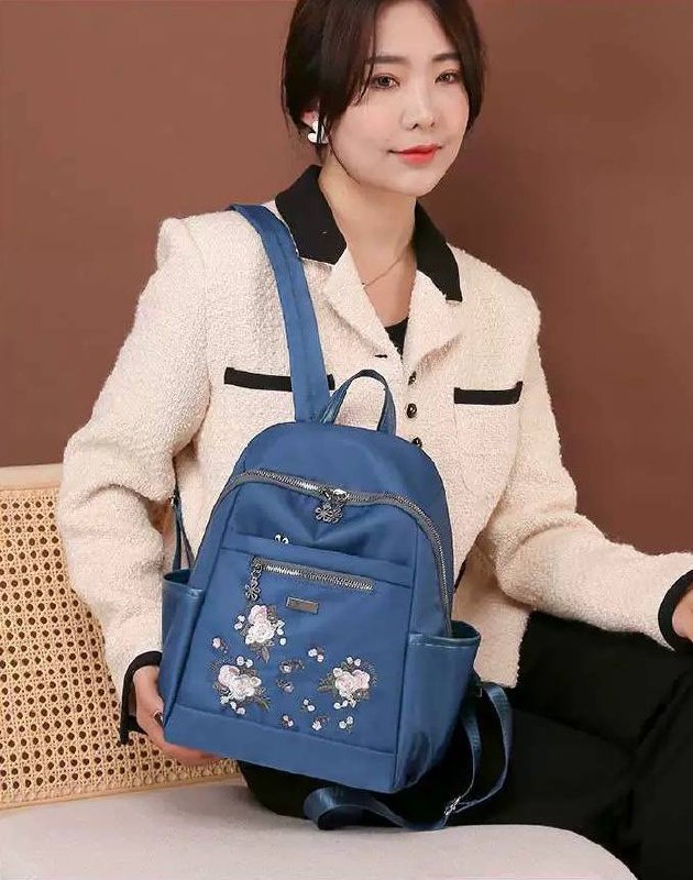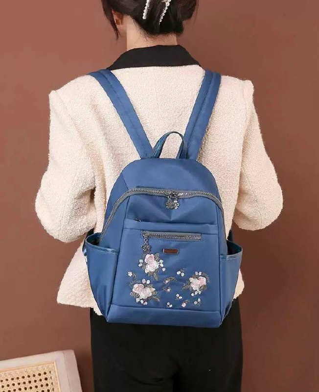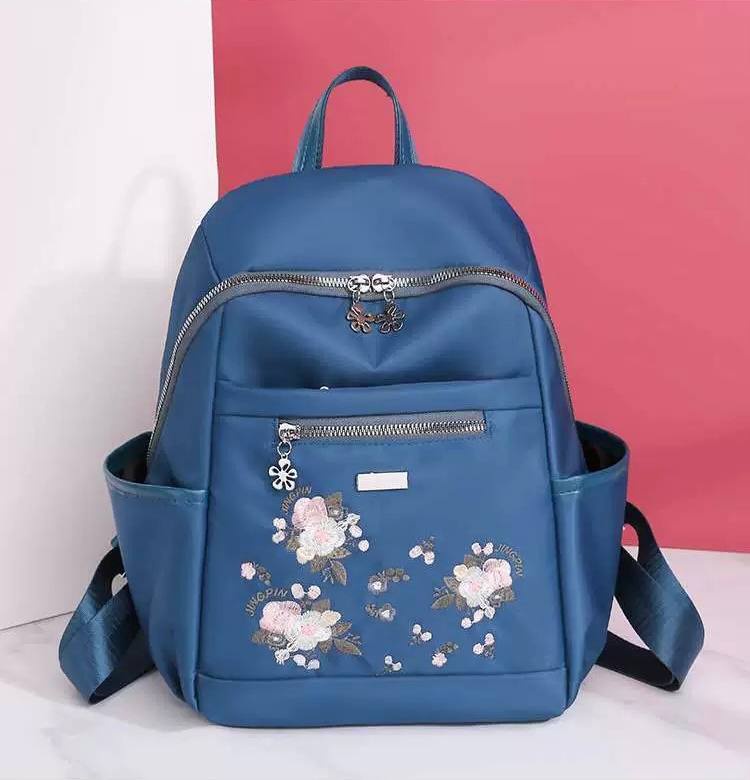 شنطة ظهر ماركة Jingpin، خامة ووتر بروف ناعمة وعملية، مزينة بتطريز ورد (Floral Embroidery) ودلايات معدنية شيك. صغيرة وخفيفة، مثالية للدروس والمشاوير اليومية