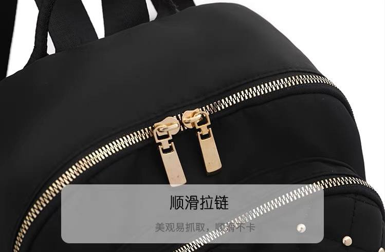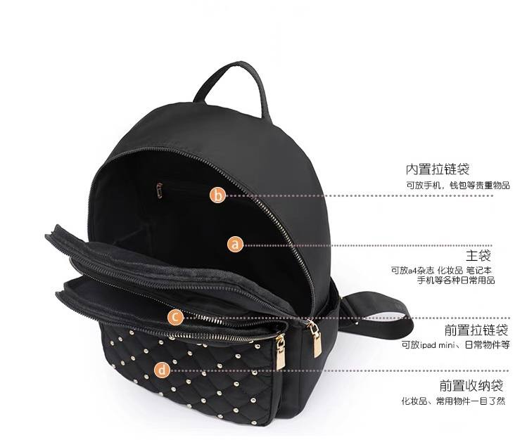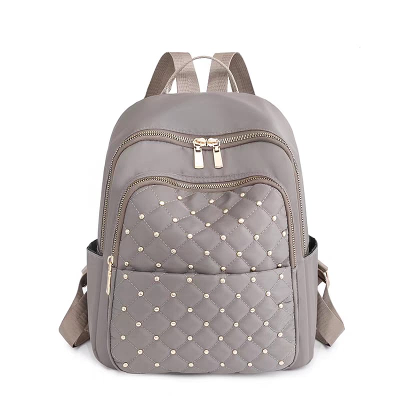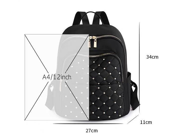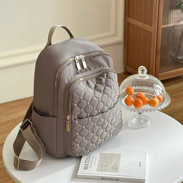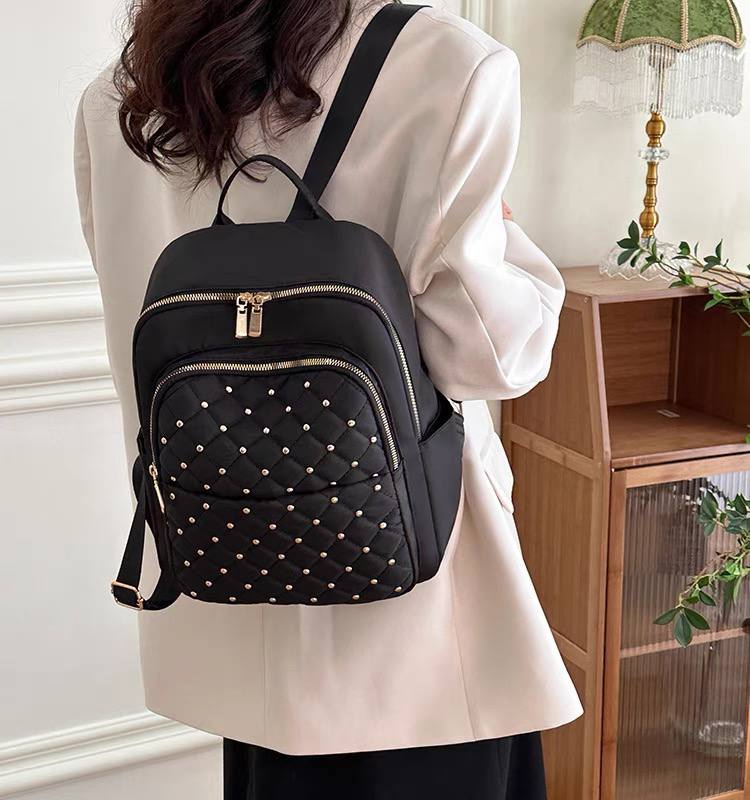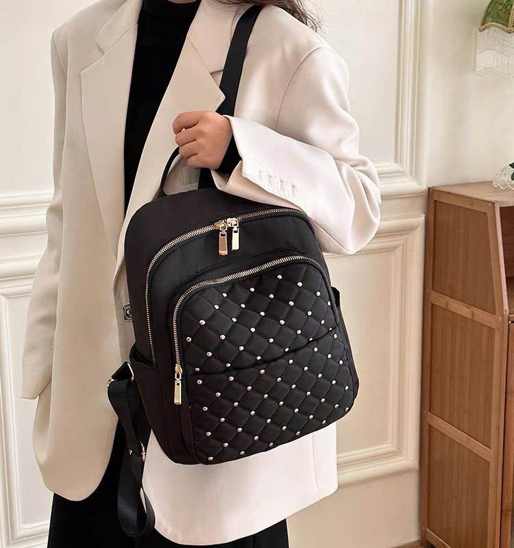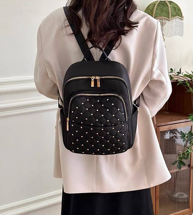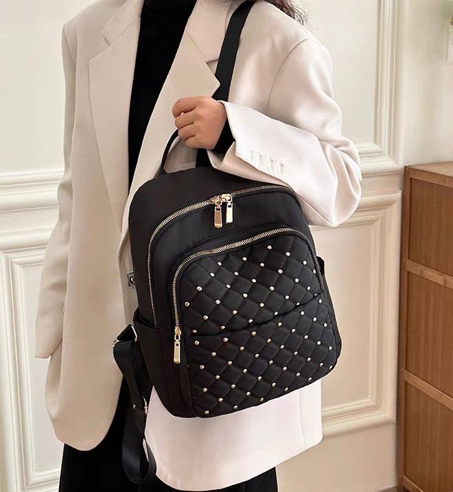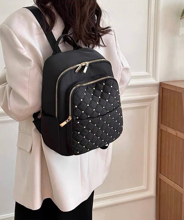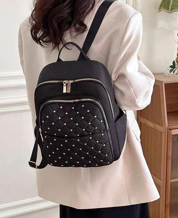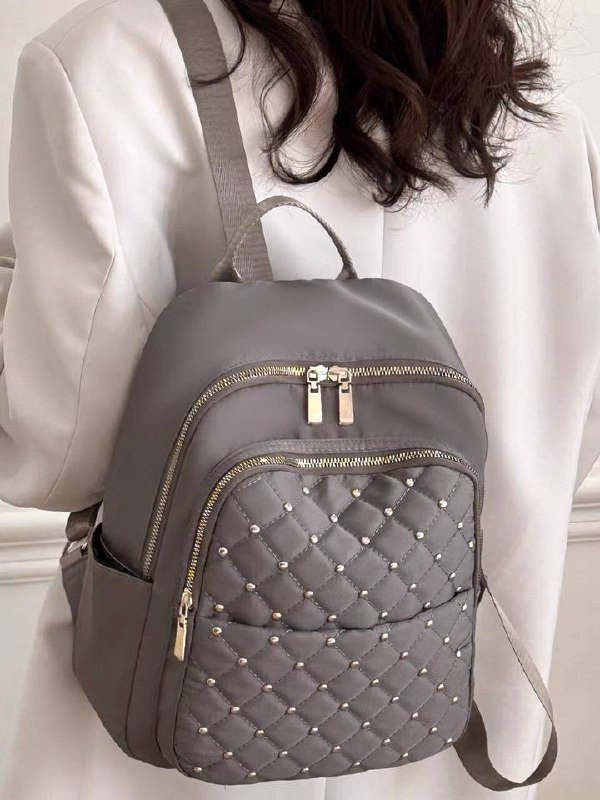 شنطة ظهر صغيرة (Mini Backpack) حريمي بتصميم مبطن (Quilted) وكباسين معدنية ذهبية (Studs)، عملية وشيك للخروجات والكاجوال، خفيفة الوزن وتناسب كل الأعمار