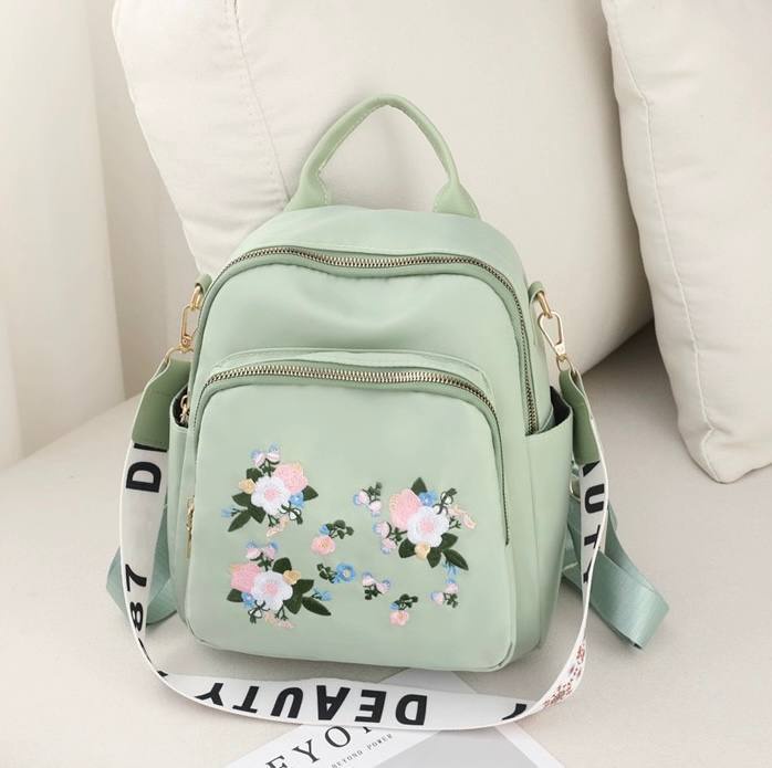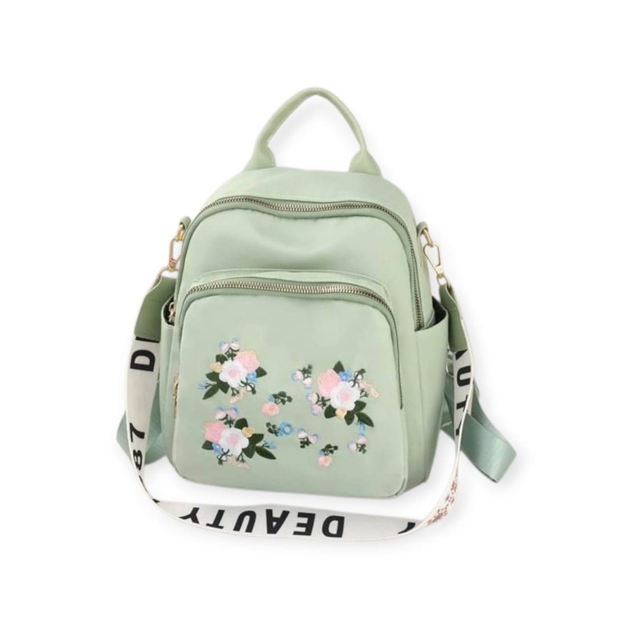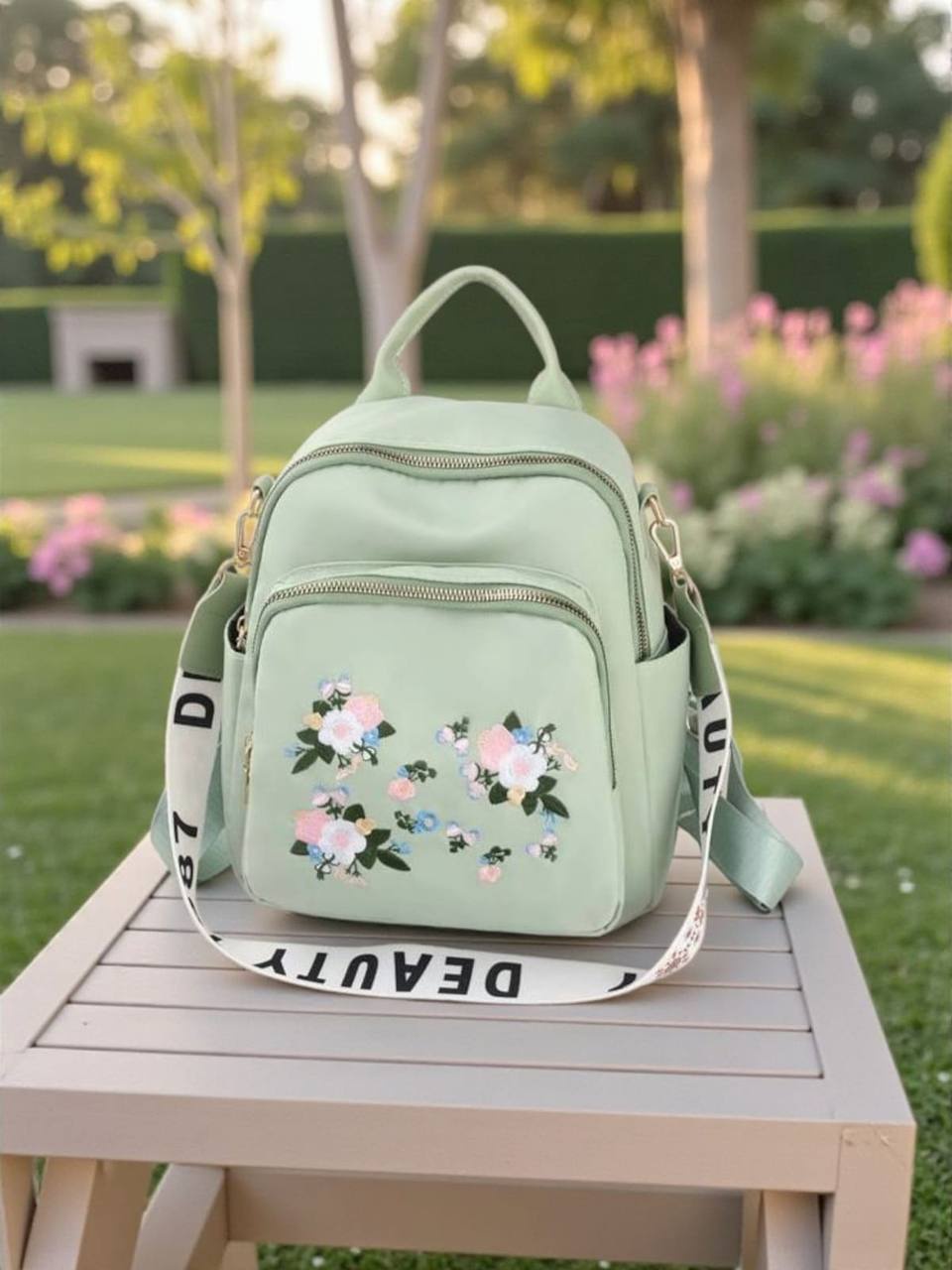 شنطة 2 في 1 (Backpack & Crossbody) بتطريز ورد وألوان باستيل، حزام عريض قابل للفصل، خامة ناعمة وسوست ذهبية، مثالية للخروجات اليومية والكاجوال، عملية وشيك.