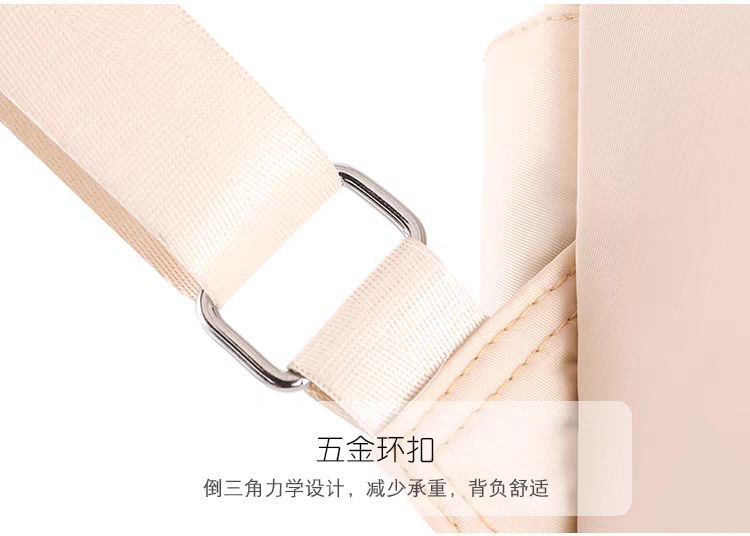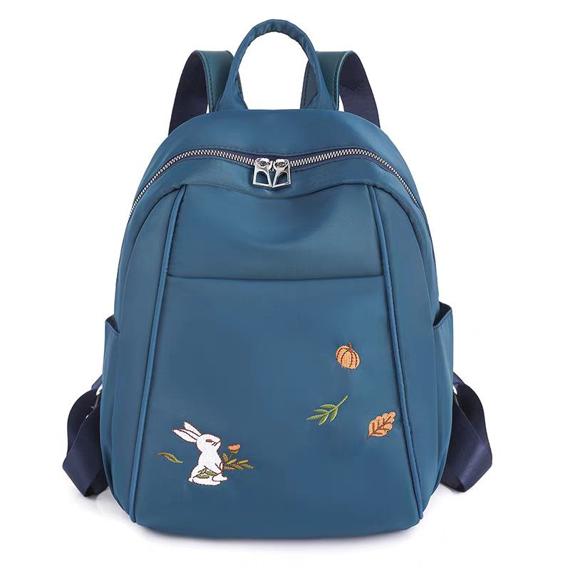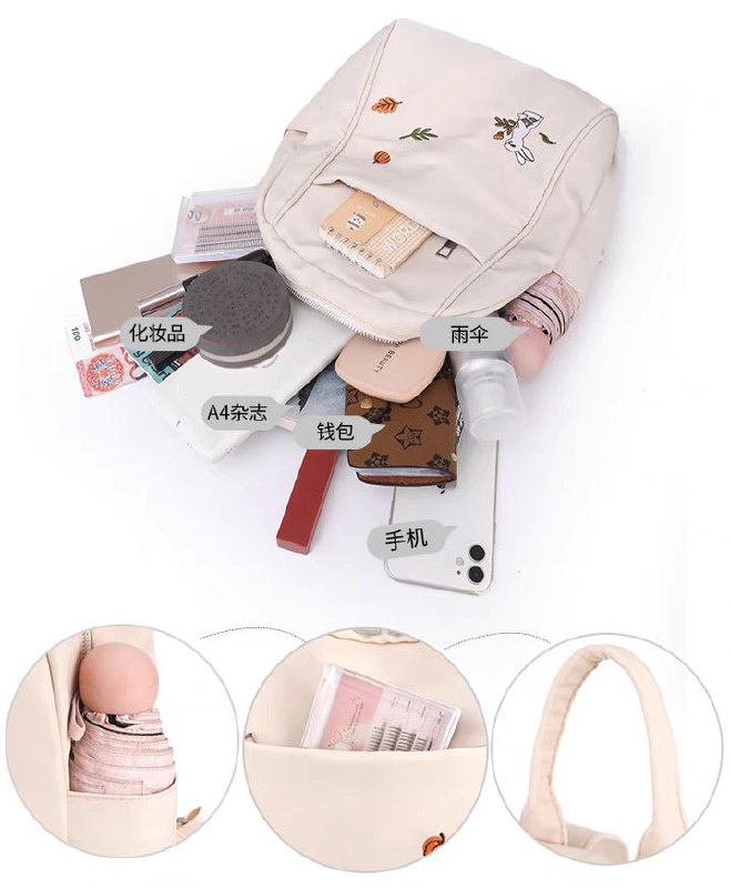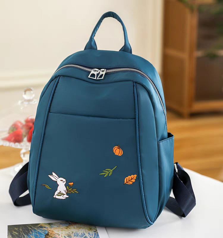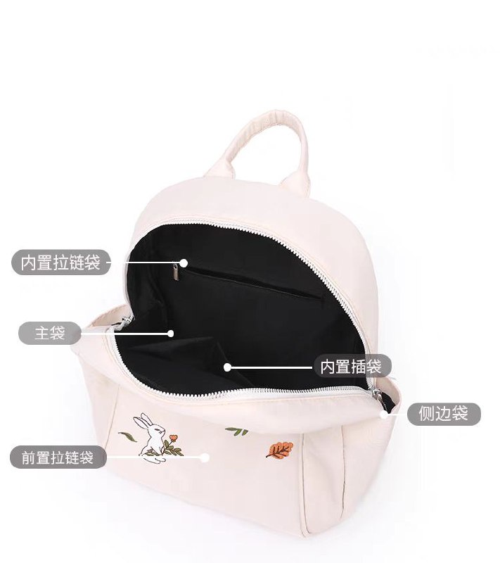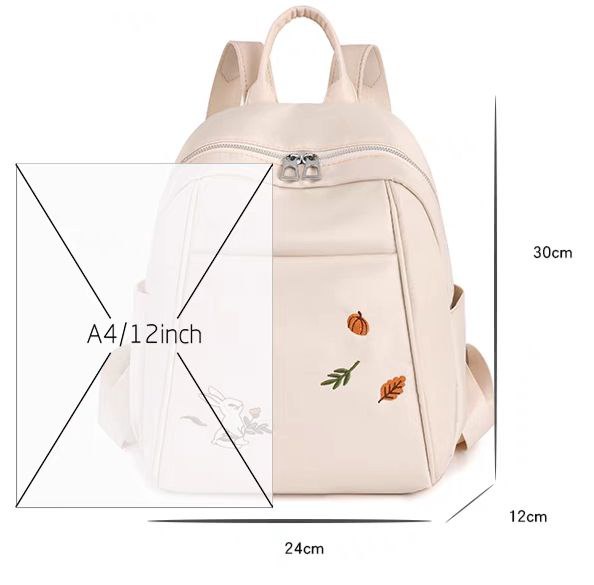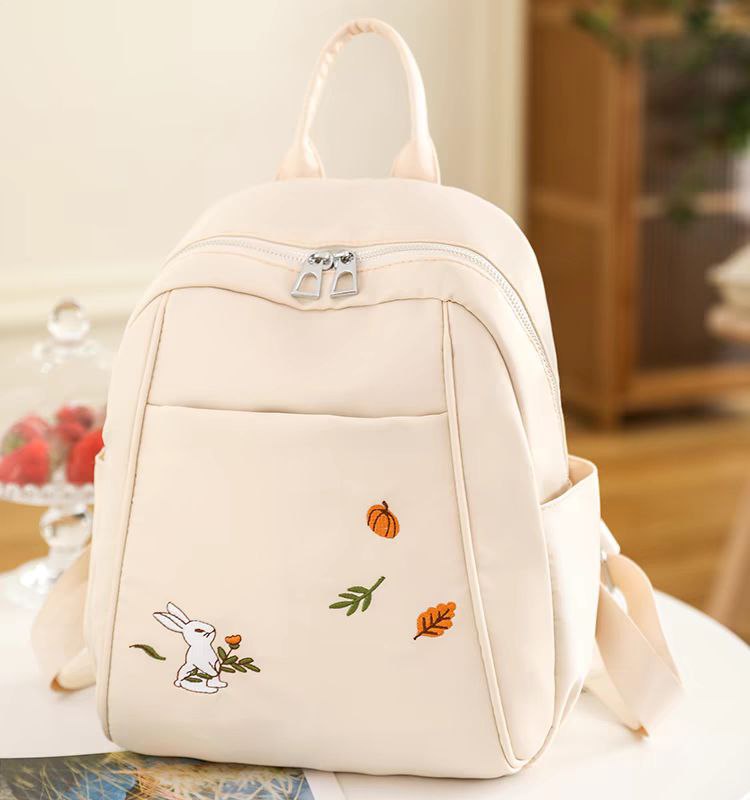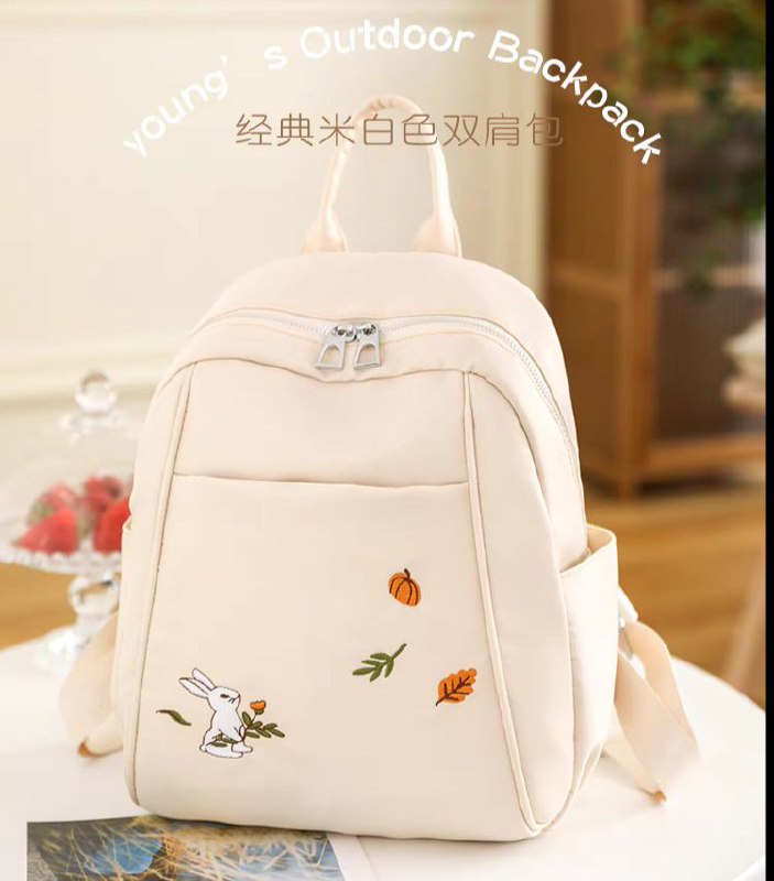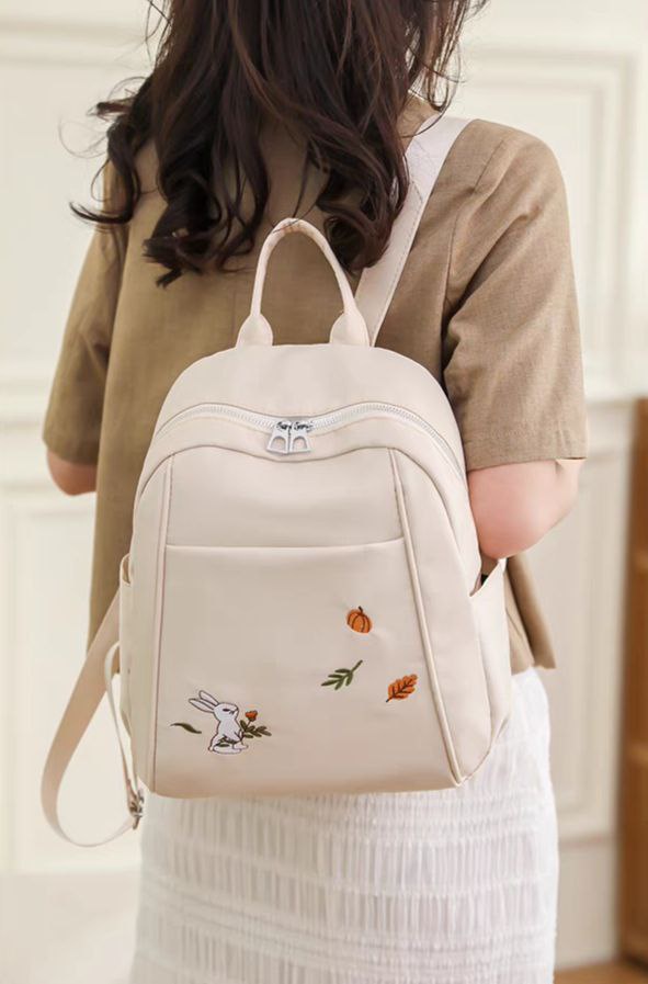 لو بتدوري على شنطة خفيفة وشكلها كيوت للخروجات السريعة، الشنطة دي ليكي! حجمها ميني (صغير) بس بتشيل كل أساسياتك (موبايل، محفظة، نوت بوك صغير، وزجاجة مية). الخامة بتاعتها ناعمة جداً ووتر بروف (Waterproof) عشان تحافظي على حاجتك، ومطرزة برسمة أرنب وأوراق شجر رقيقة بتديها لمسة أنثوية جميلة.