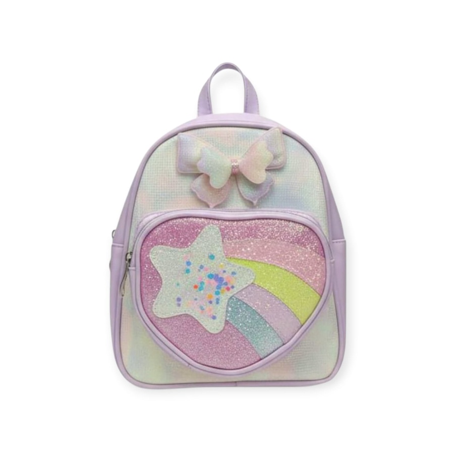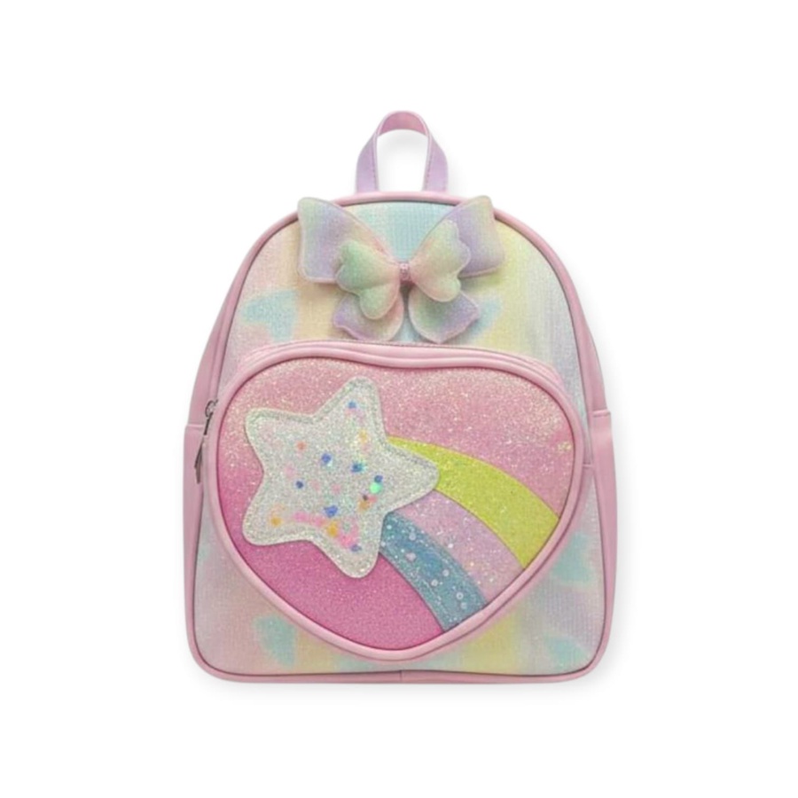 شنطة ظهر بناتي باستيل مع جيب أمامي على شكل قلب مزين بنجمة وقوس قزح جليتر وفيونكة رقيقة، حجم مناسب للخروجات والمدرسة.