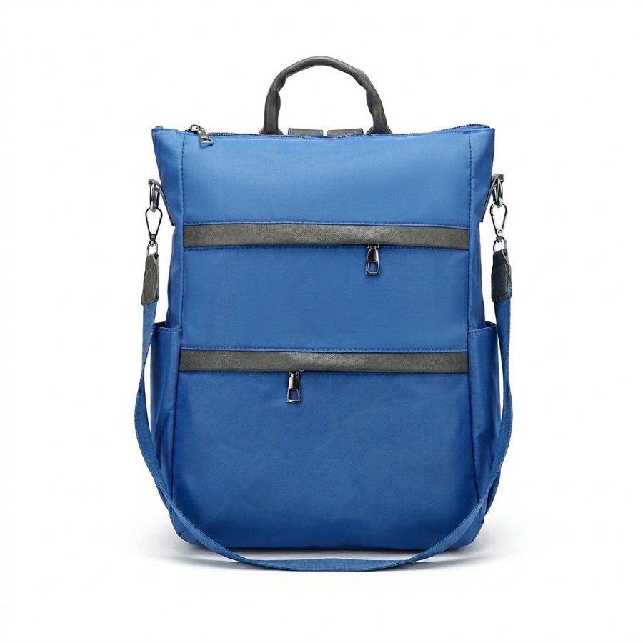 شنطة ظهر حريمي عملية جدًا، تصميم سادة بسيط بس شيك، متاحة بألوان أسود، بيج وأزرق علشان تمشي مع أي لبس كاجوال. شكلها مستطيل وحجمها كبير يدي إحساس شنطة شغل أو جامعة مرتبة.