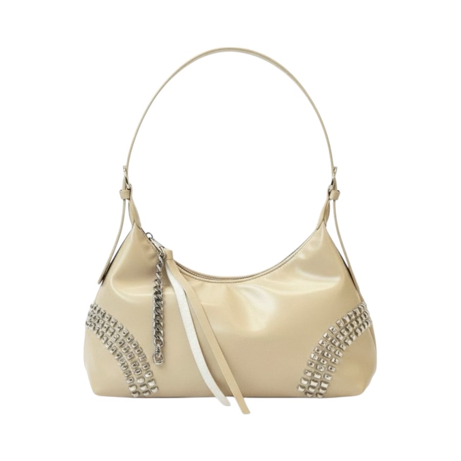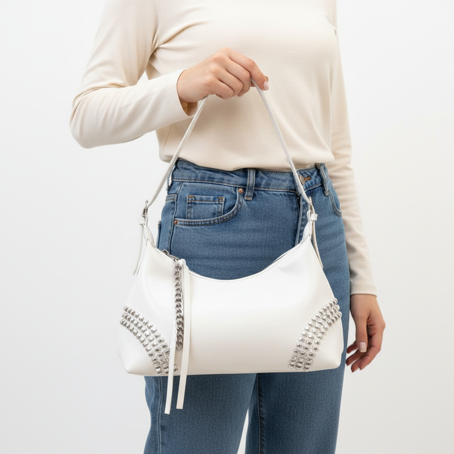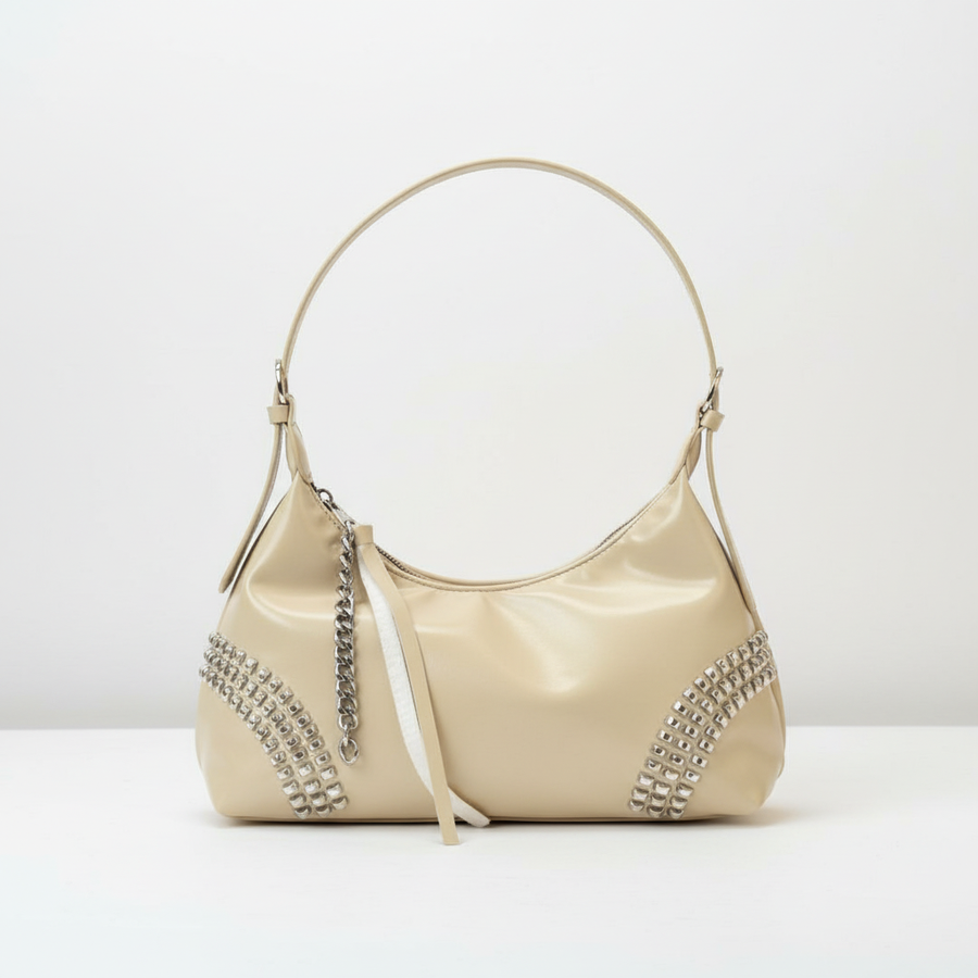 شنطة كتف حريمي جلد بتصميم انسيابي (Hobo Bag) مستوحى من ستايل Prada Cleo. مزينة بتطريز معدني وكريستال على الجوانب، وسلسلة فضية شيك. متوفرة بألوان: أسود، بيج، وأبيض. مثالية للسهرات والمناسبات.