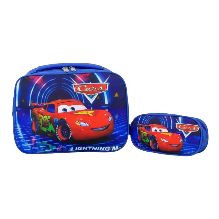 لانش بوكس أولادي بتصميم شخصيات ديزنى شنطة غداء مع حافظة جانبية بنفس الرسمة، مثالية للمدرسة والرحلات للأولاد عشاق السباقات.