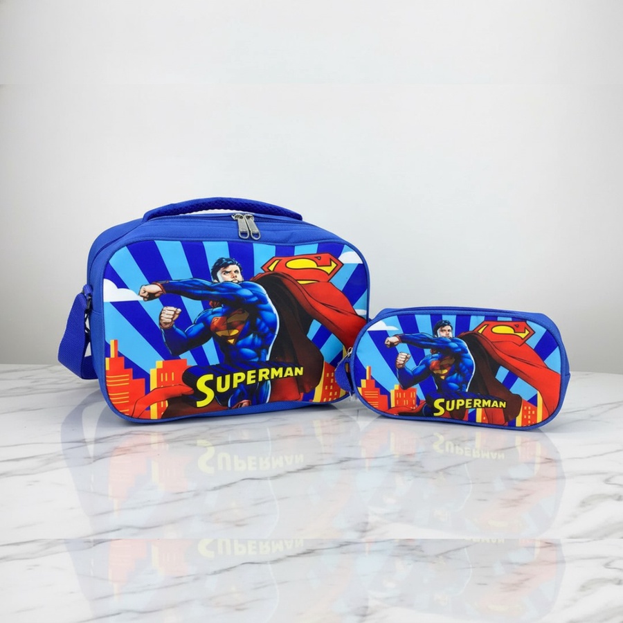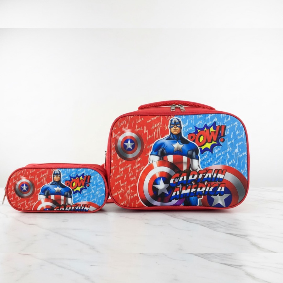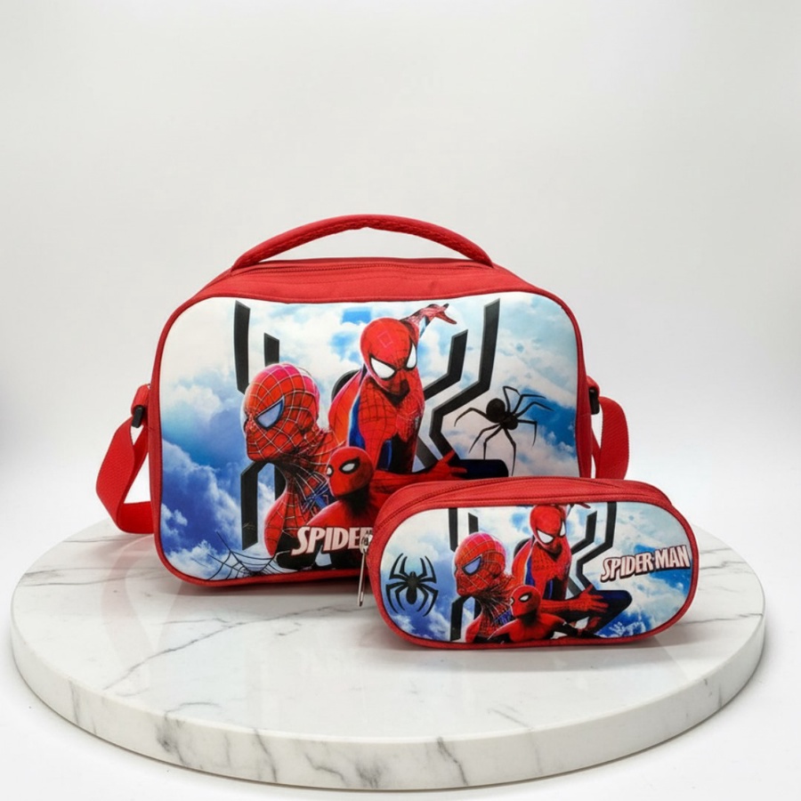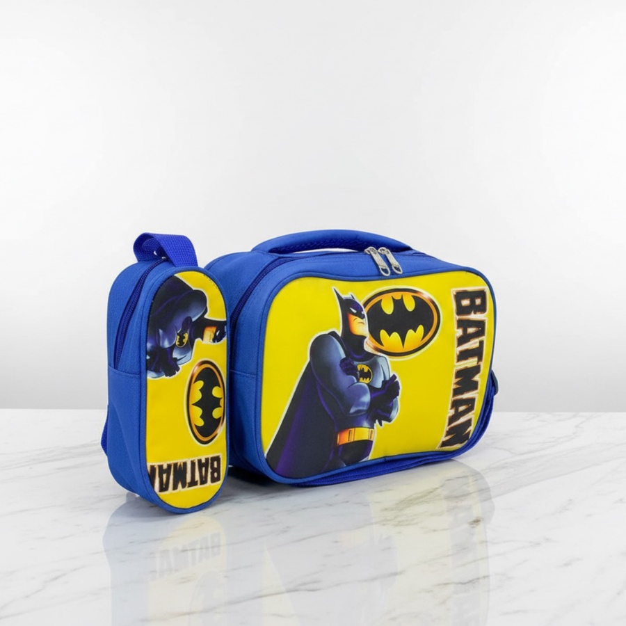 التصميم: لانش باج بتفاصيل لطيفةوخلفية كرتونية ، مع حافظة جانبية أصغر بنفس التصميم متوصلة في الجنب.