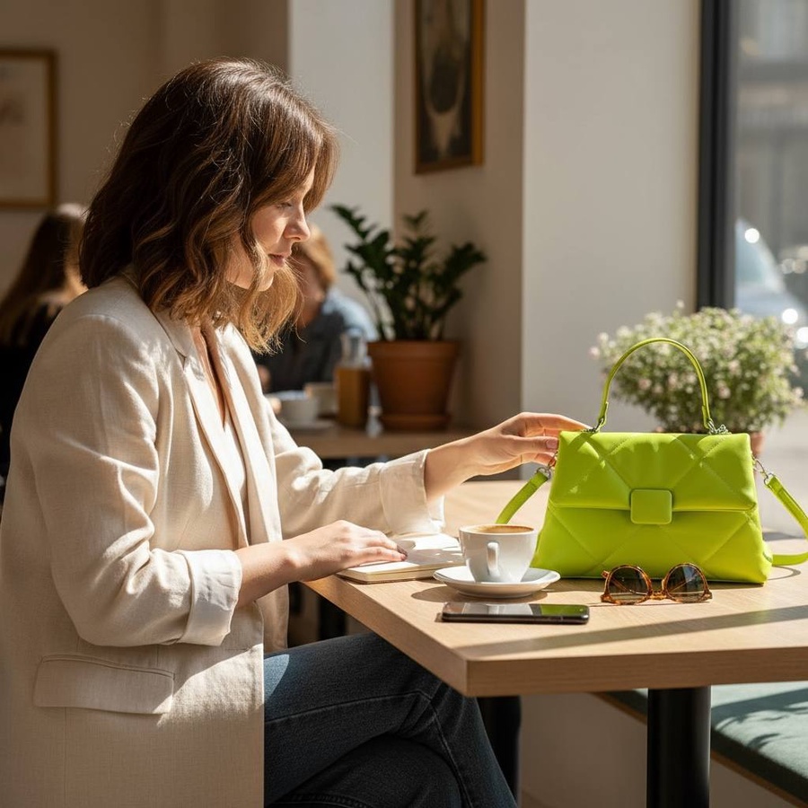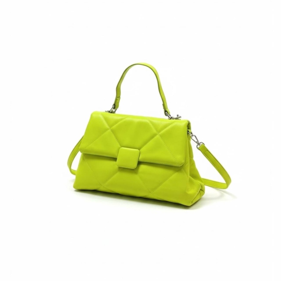 شنطة كروس بلون اخضر نيون اختيار ممتاز لو عايزة شنطة شكلها شيك وفي نفس الوقت تنفع استخدام يومي، تصميمها المبطّن المربعات مع القفل الأمامي المخفي يديها لوك مرتب وناعم يمشي مع لبس شغل أو خروجات كاجوال. المسكة العلوية تخليها أنيقة في الإيد، وكمان معاها حزام كروس تقدري تركبيه أو تفكيه على حسب راحتك وطريقة لبسك.