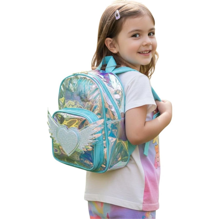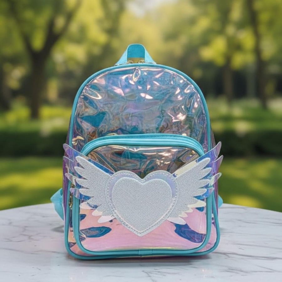 شنطة Angel Heart Hologram Kids Backpack مصممة خصيصًا للبنات اللي بيحبوا اللمعة والألوان الهادية. الخامة هولوجرام شفافة (Transparent Hologram Material) بتعكس ألوان جميلة مع الضوء، مع تصميم قلب بأجنحة في الجيب الأمامي يدي شكل أنيق وكيوت جدًا.