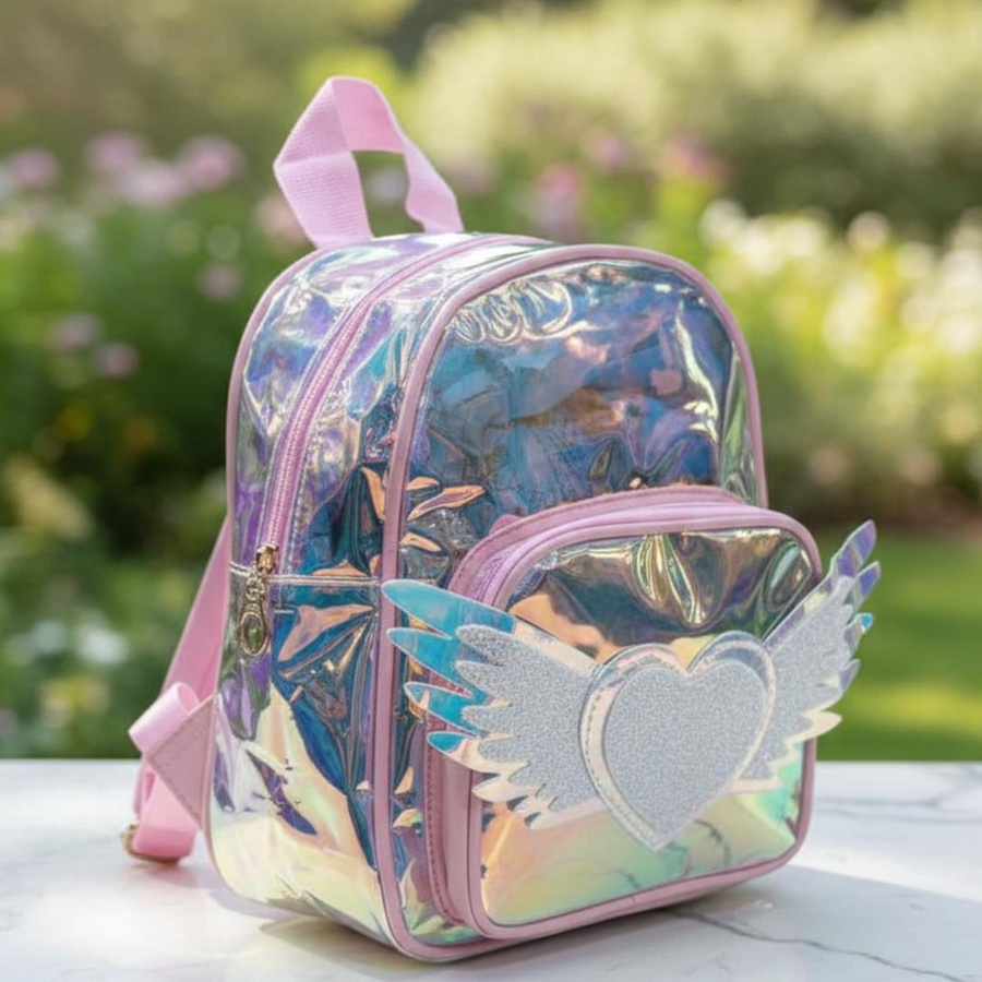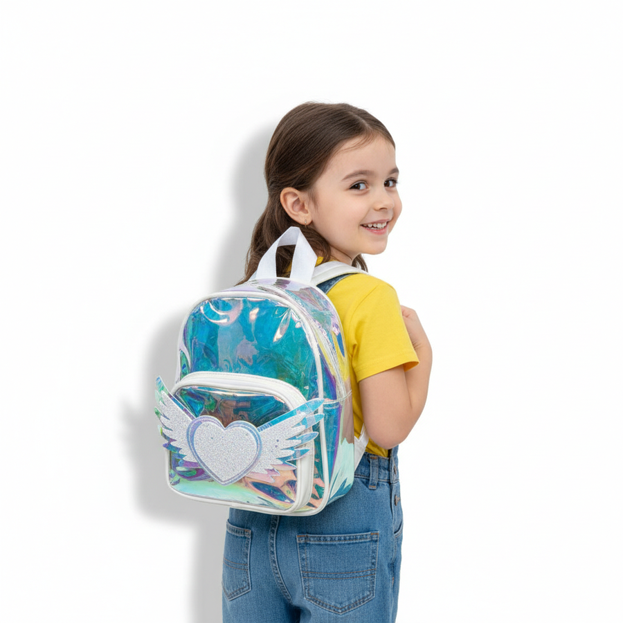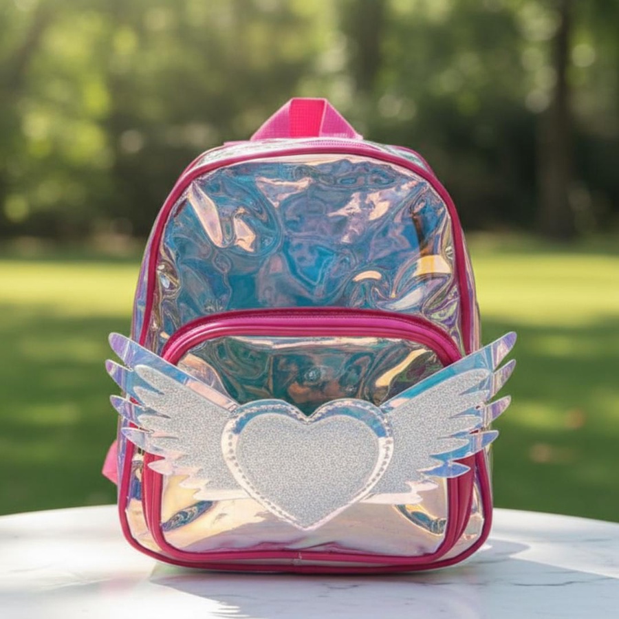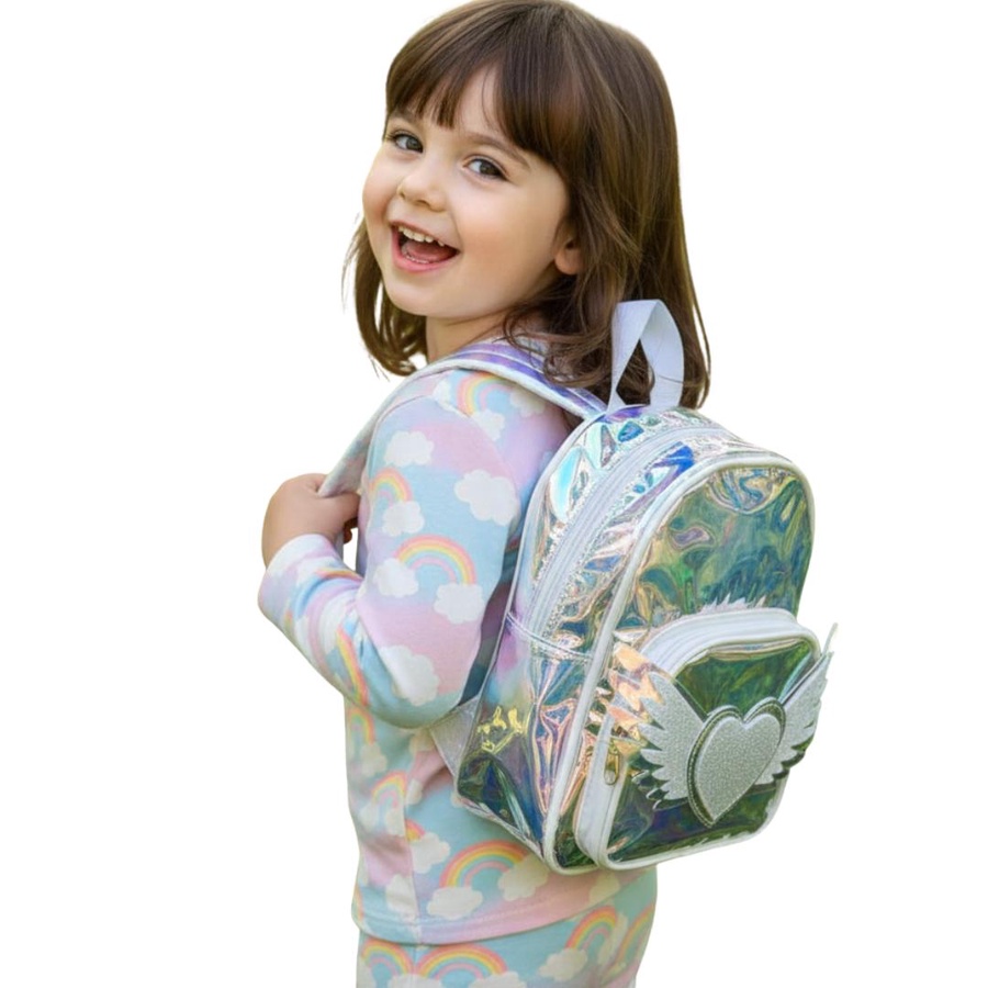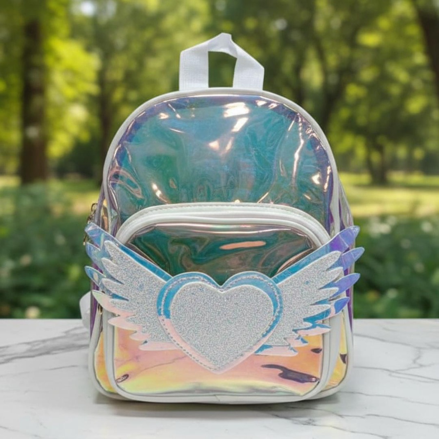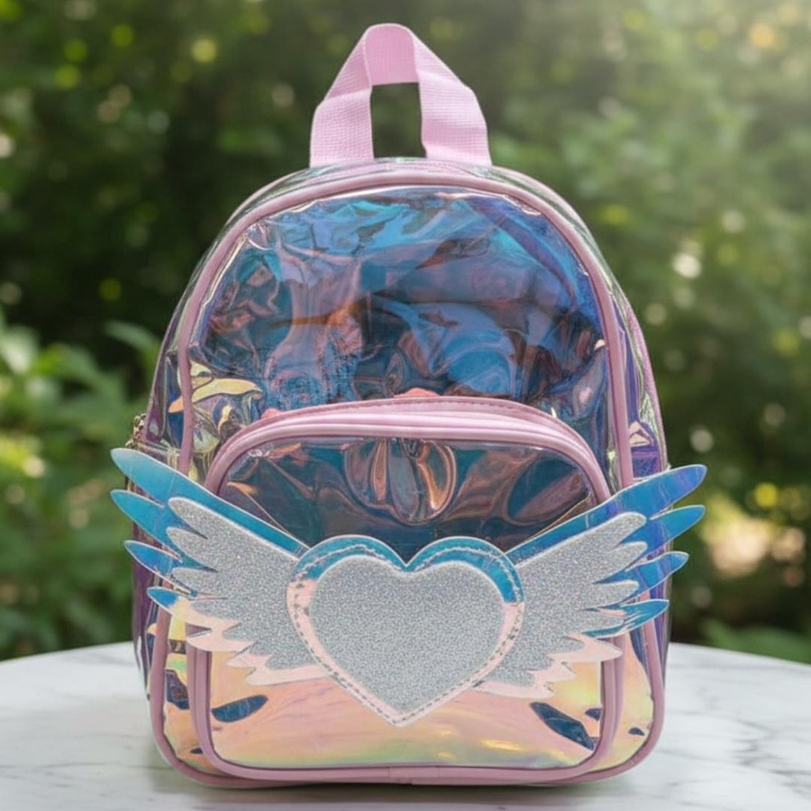 A cute hologram kids backpack with angel heart wings design, lightweight and stylish for little girls.