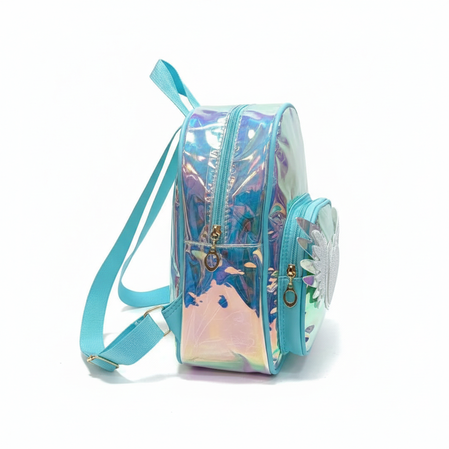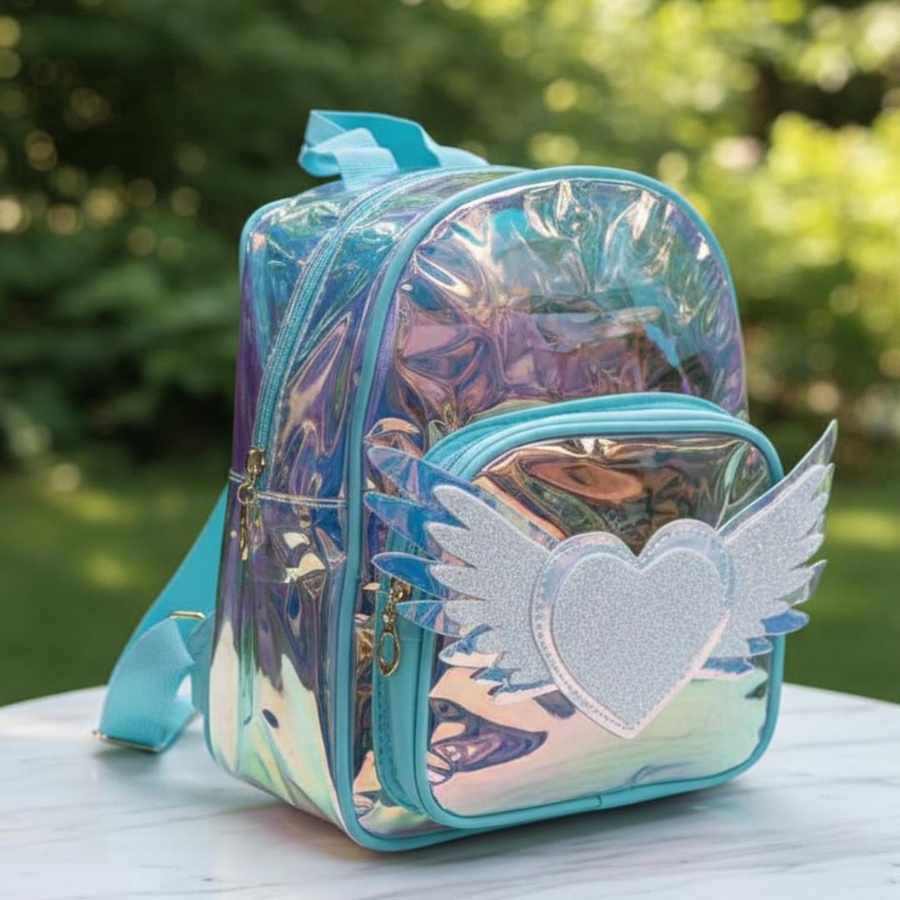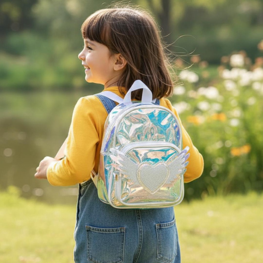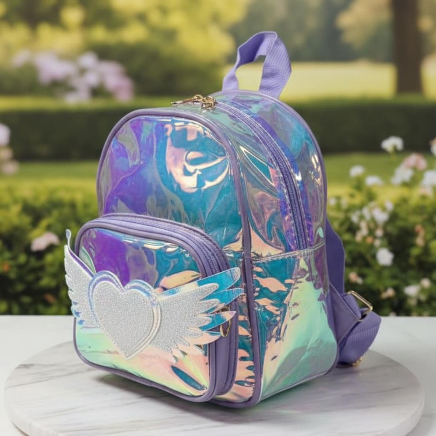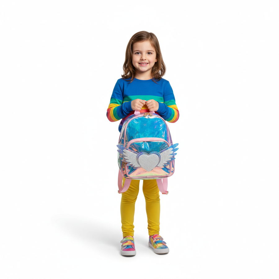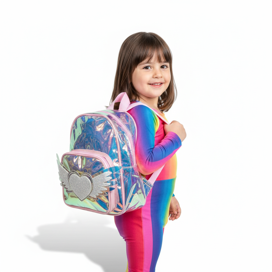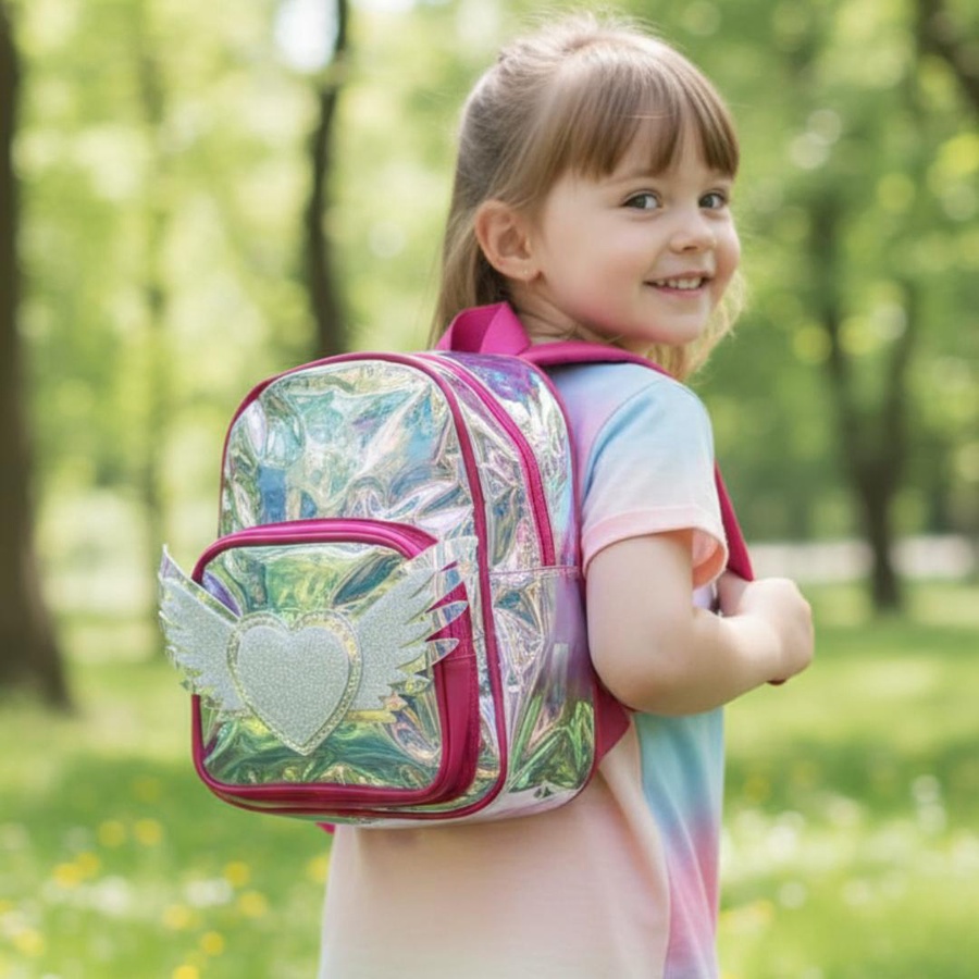 A cute hologram kids backpack with angel heart wings design, lightweight and stylish for little girls.