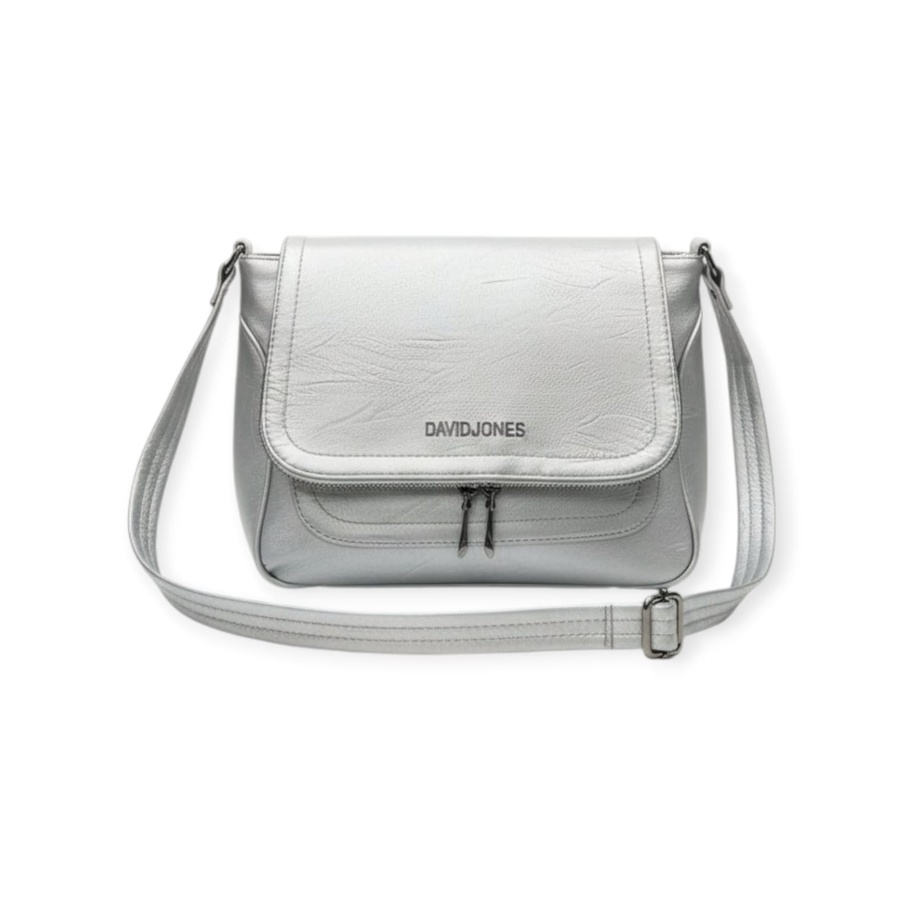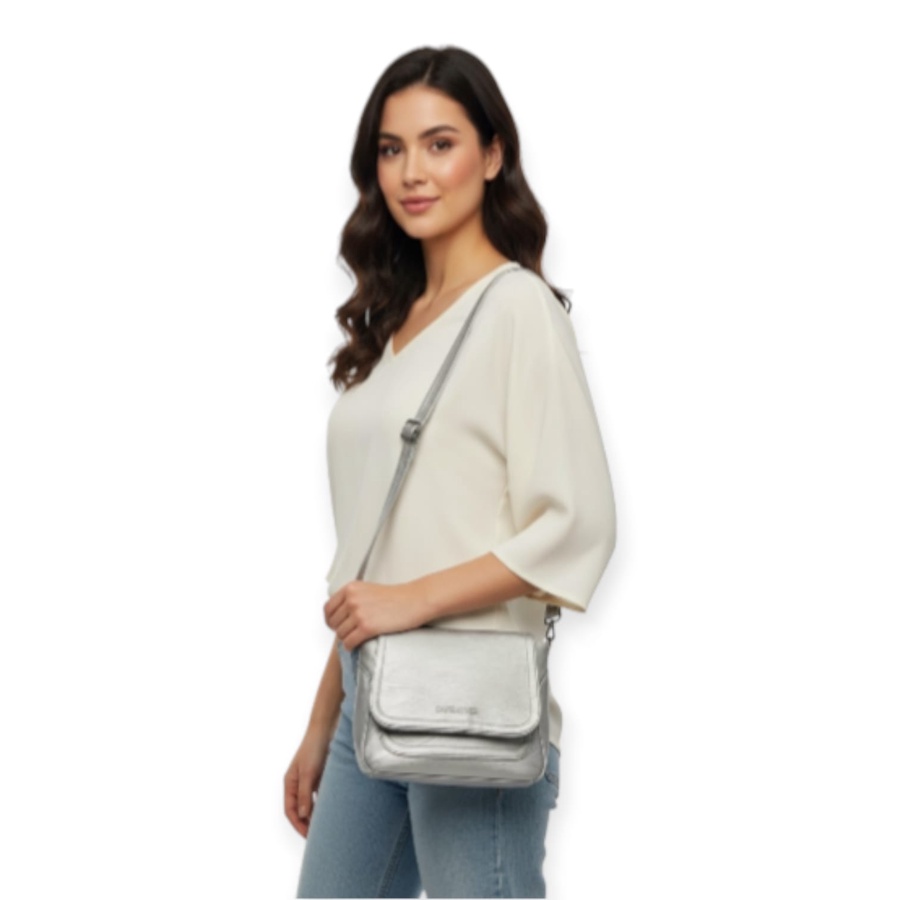 شنطة كروس حريمي من David Jones بتصميم بسيط بغطاء أمامي واسع وجيب سفلي بسوستة مزدوجة، حزام كتف قابل للتعديل، حجم عملي للموبايل والمحفظة والأغراض اليومية