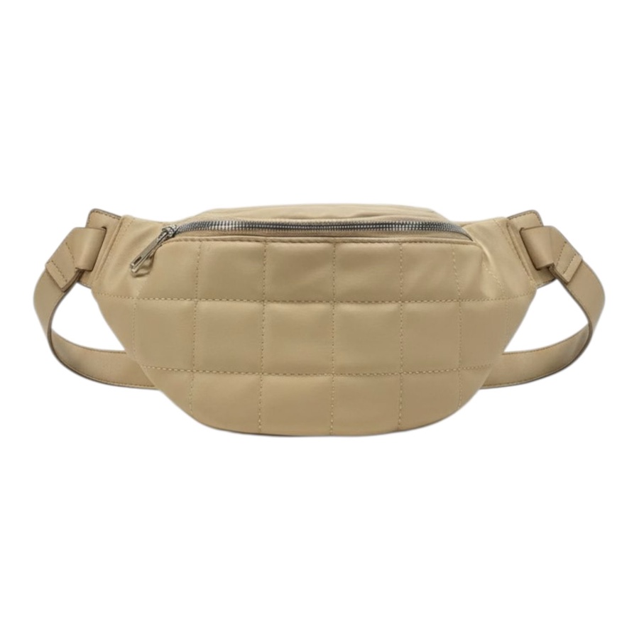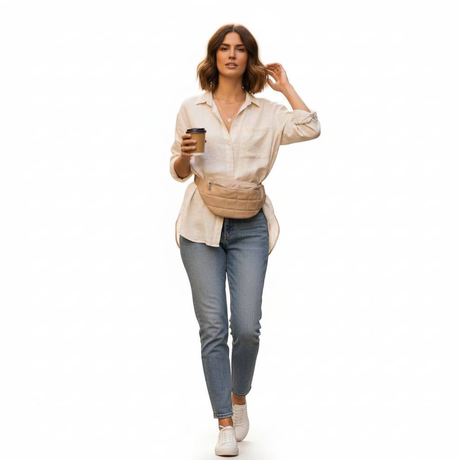 شنطة ويست باللون البيج مناسبة للبنات اللي تحب الاستايل البسيط من غير تفاصيل كتير، تصميمها المبطّن بخياطة مربعات يعطيها شكل كاجوال شيك يمشي مع الجينز، التيشيرت والقمصان الواسعة زي اللي في الصورة. تقدري تلبسيها حوالين الوسط والحزام القابل للتعديل يخليها مريحة وثابتة وإنتِ ماشية أو راكبة مواصلات.