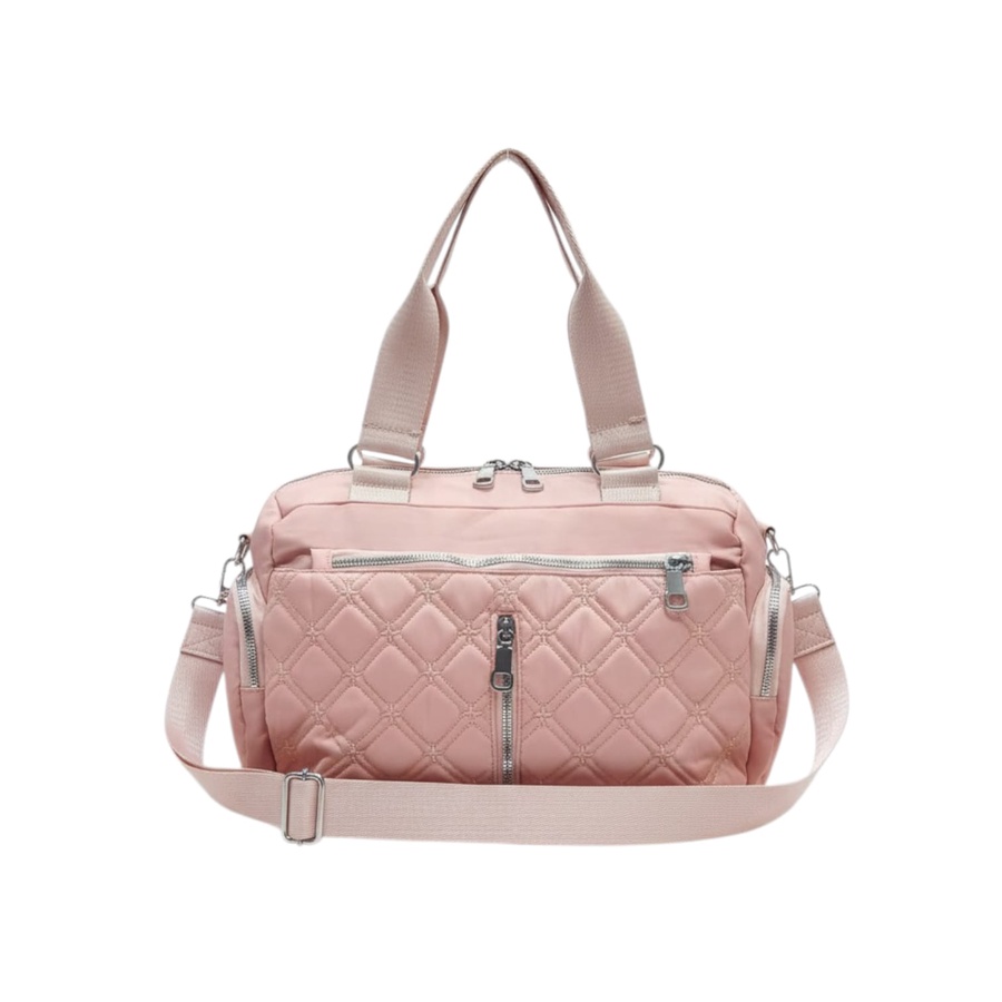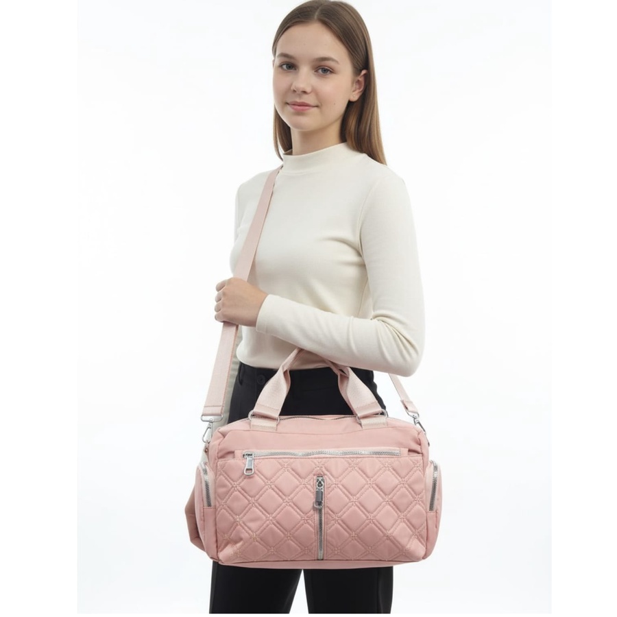 شنطةكروس عملية جدًا للبنات اللي بتحب لون البينك وحابة تشيل كل حاجتها في شنطة واحدة مرتبة، مساحتها تكفي طقم لبس كامل، فوطة، زجاجة مية، شنطة ميكب صغيرة ومحفظة وموبايل من غير ما تبقى مزنوقة. الجزء الأمامي المبطّن بنقشة مربعات مع جيب عمودي وأفقي بسوستة يخلي ترتيب الحاجات الصغيرة زي المفاتيح، السماعات والماسكات أسهل.