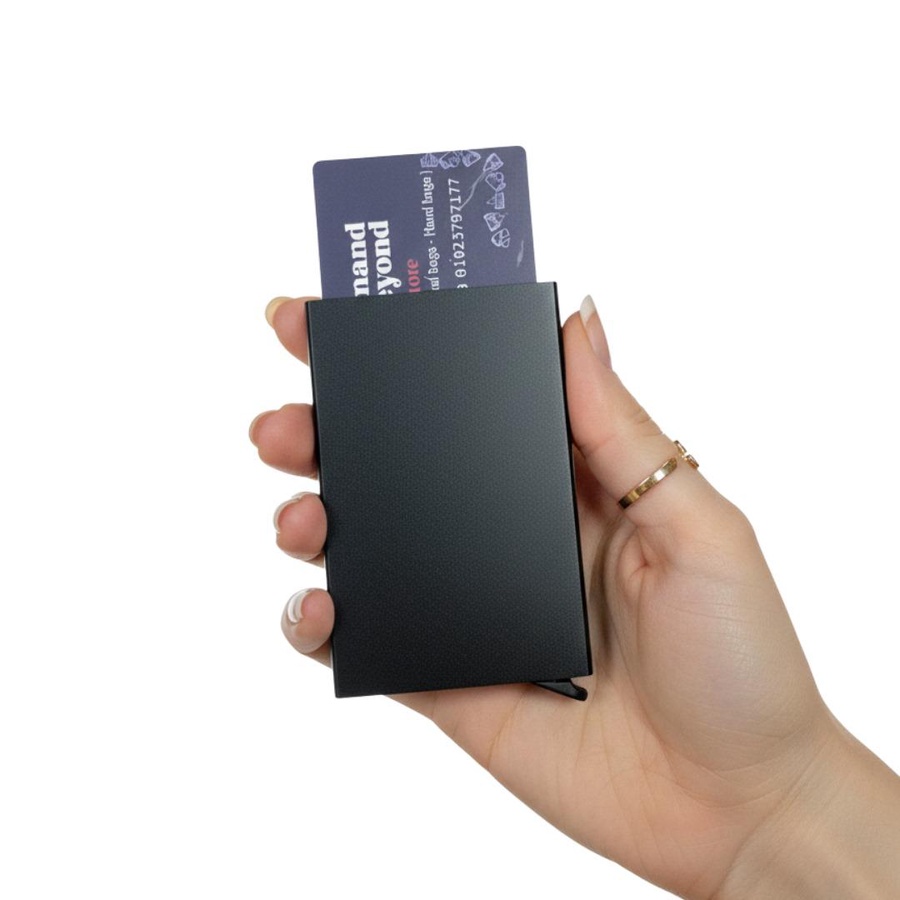 محفظة بطاقات معدنية تتميز بألية الدفع للوصول للبطاقة بلمسة زر توفر حماية ضد الانثناء