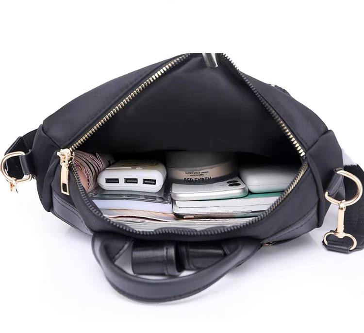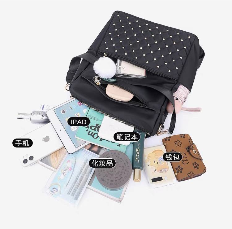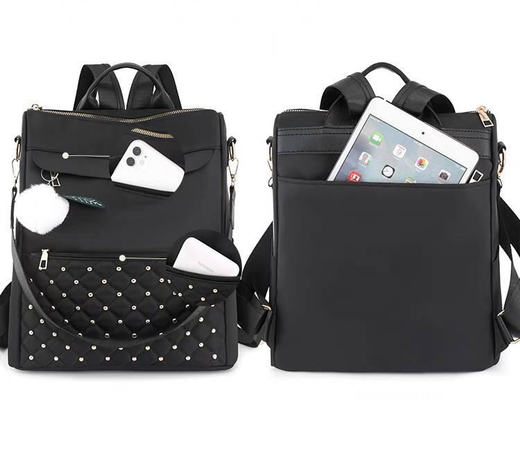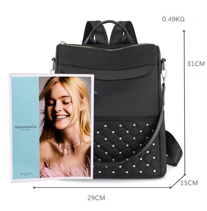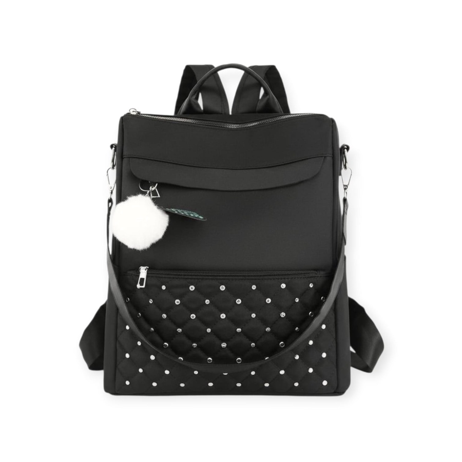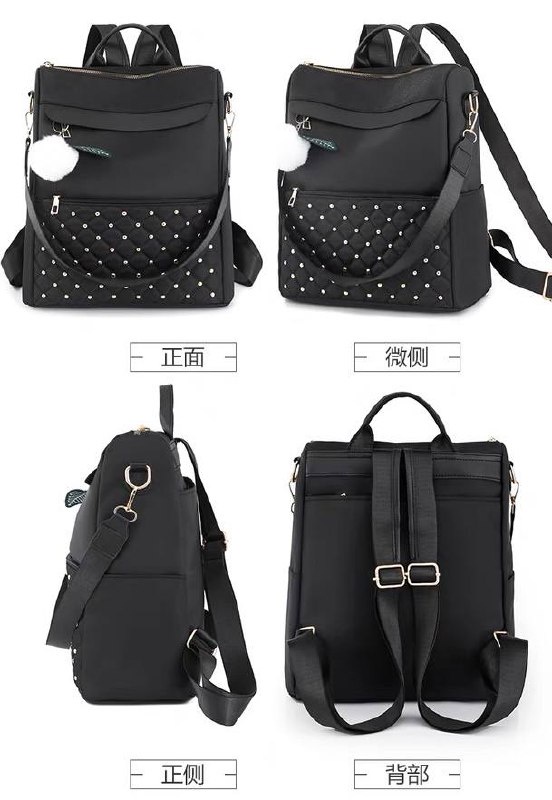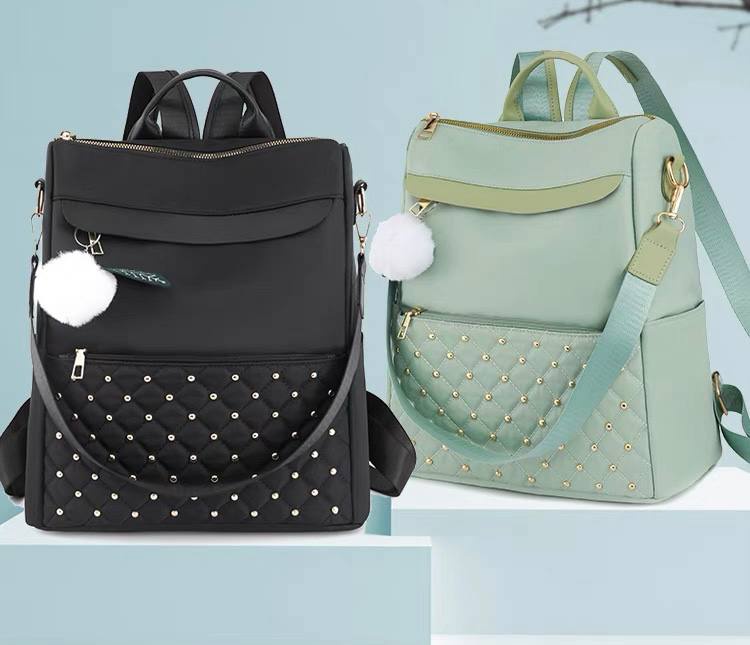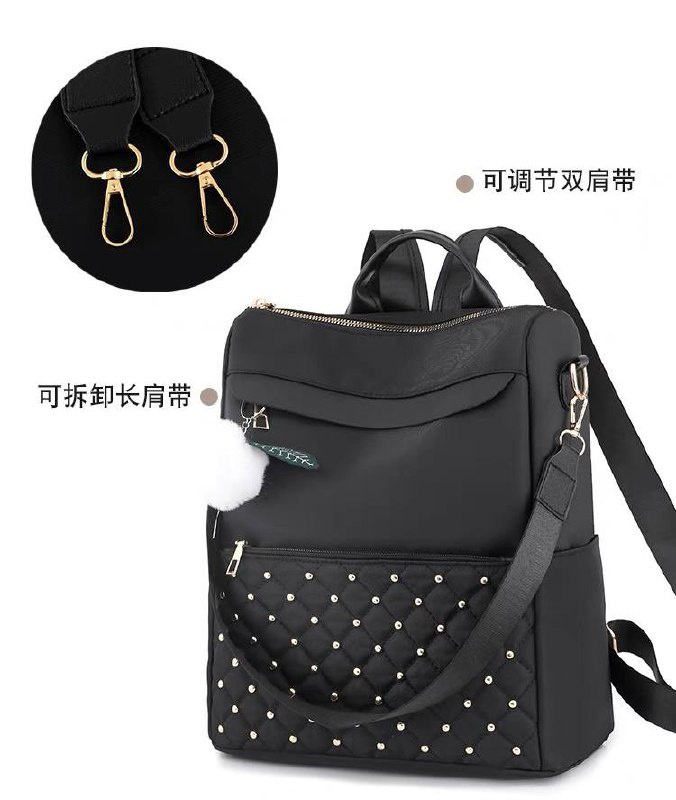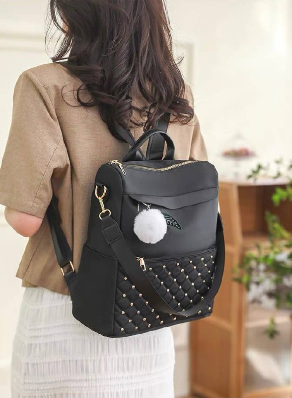 شنطة ظهر حريمى كاجوال مبطنة مزينة بحبيبات ذهبية وبدلاية فرو، خامة متينة متعددة الجيوب، تنفع شنطة ظهر أو كروس، مناسبة للسهرات والخروجات اليومية.