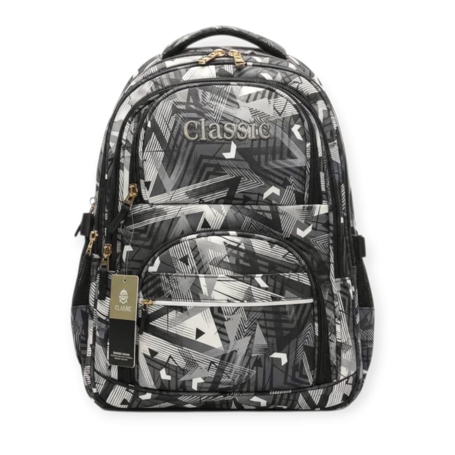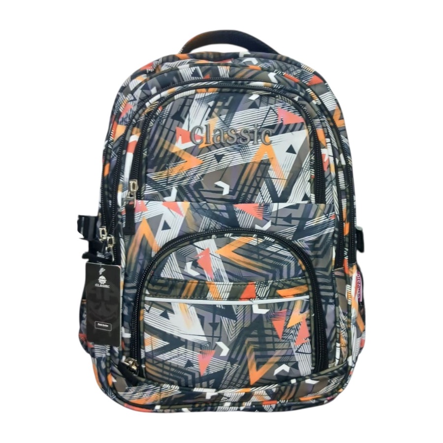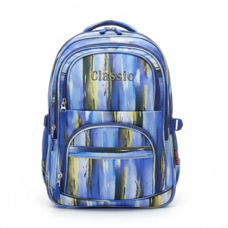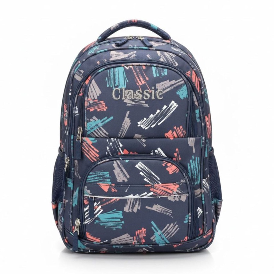 شنطة ظهر عملية شكلها كاجوال، عليها نقشة جرافيك خطوط وفرش ألوان بالتركواز والكورال والرمادي، مع كلمة Classic مطرزة من قدام تناسب ولاد وبنات.