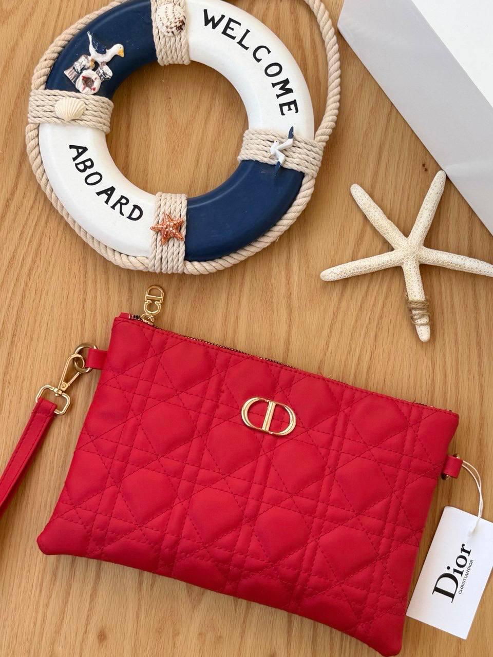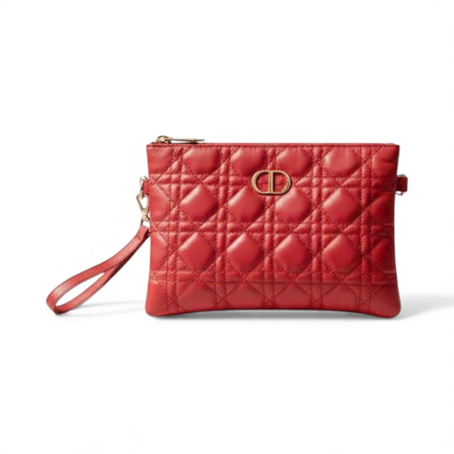 شنطة الكلاتش الحريمي جلد مبطن بتصميم شيك مستوحى من موديلات Dior الكلاسيكية، نقشة الخياطة المربعة وشعار المعدن الصغير في النص يديها شكل براند فخم يكمّل أي لوك سواريه أو كاجوال شيك.