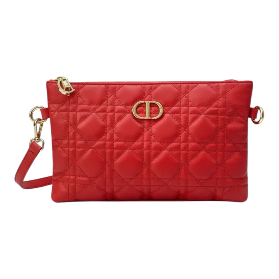 شنطة الكلاتش الحريمي باللون الاحمر جلد مبطن بتصميم شيك مستوحى من موديلات Dior الكلاسيكية، نقشة الخياطة المربعة وشعار المعدن الصغير في النص يديها شكل براند فخم يكمّل أي لوك سواريه أو كاجوال شيك.