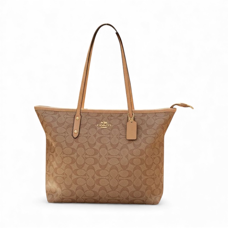 باللون البيج شنطة الكتف Coach مناسبة للبنات والسيدات اللي بيحبوا الشنط البراند وعايزين شنطة واسعة تشيل كل حاجتهم طول اليوم، مساحتها كبيرة تنفع للمحفظة، الموبايل، نوت بوك، تابلت، بوك منظم، علبة ميكب وكذا قطعة زيادة من غير ما تحسي إنها مزنوقة. طبعة شعار Coach الكلاسيكية على الشنطة كلها تديها شكل شيك وراقي يمشي مع لبس الشغل، الجامعة أو الخروجات الكاجوال.