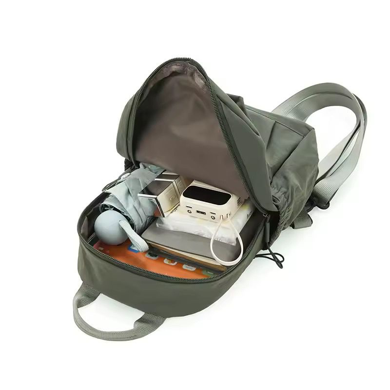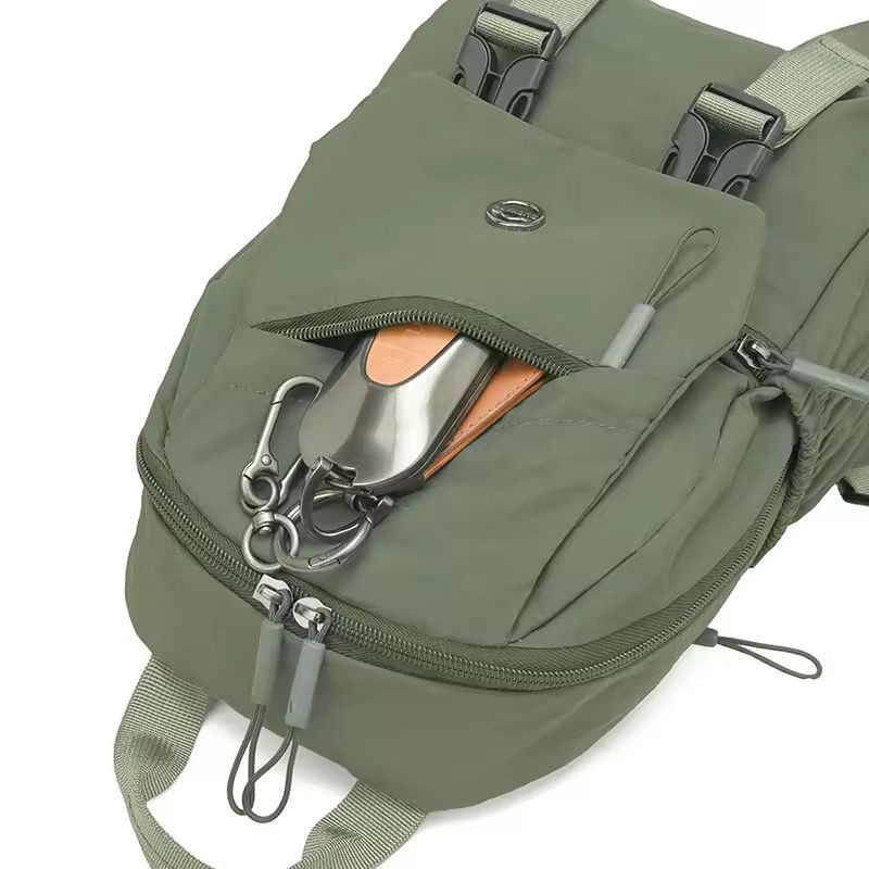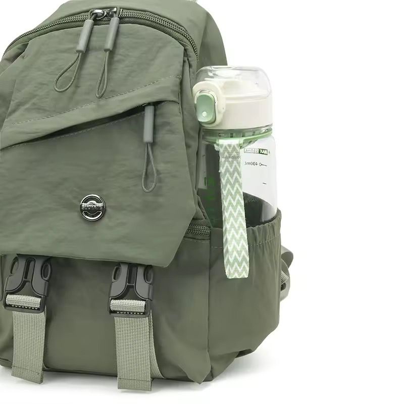 في الجوانب: جيوب مفتوحة تناسب زجاجة المياه أو المظلة الصغيرة.