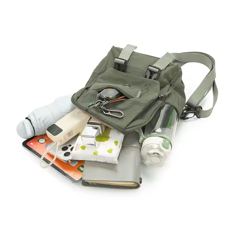 خامة متينة ومقاومة للماء (Waterproof): مصنوعة من نسيج عالي الجودة ومقاوم للماء، مما يحمي مقتنياتك الثمينة (الهاتف، الآيباد، المحفظة) من الأمطار المفاجئة أو الانسكابات، لتكوني مطمئنة في كل مشوار.