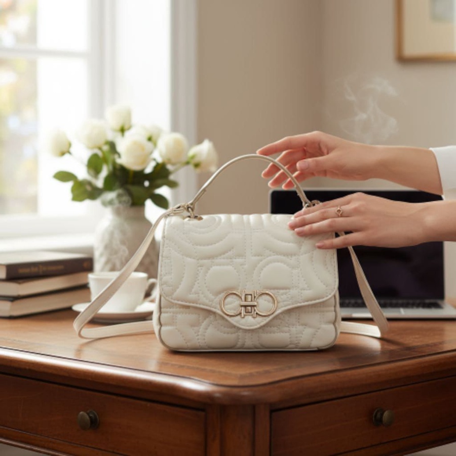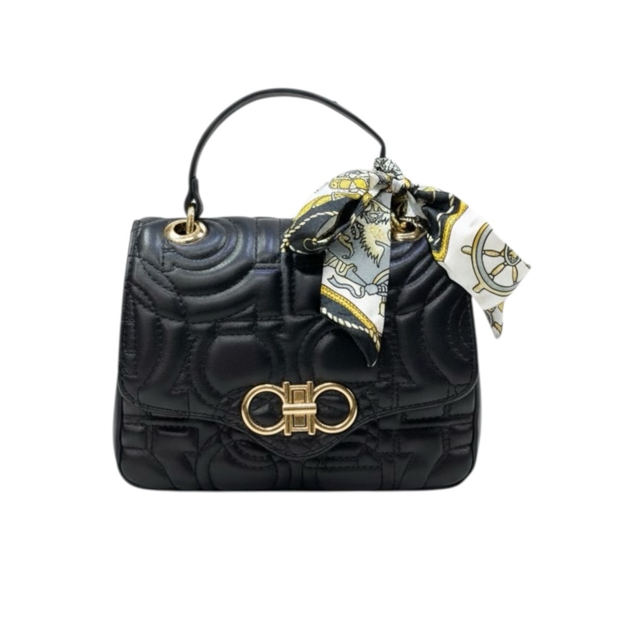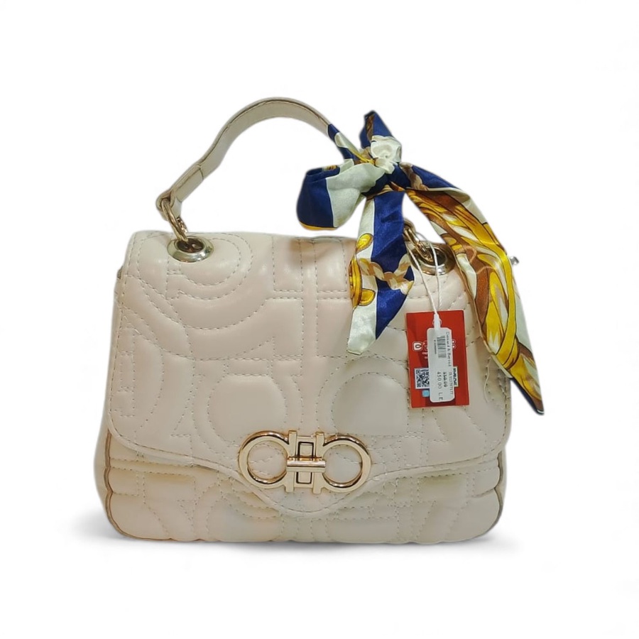 شنطة شكلها كيوت وراقي في نفس الوقت، مبطنة بنقشة ناعمة مع قفل معدني أمامي مميز يديها لمسة فخامة، والسكارف الملون المربوط في اليد يخليها ملفتة جدًا في أي خروجة. حجمها المتوسط يشيل الموبايل، المحفظة، المفاتيح وشنطة ميكب صغيرة أو نضارة من غير ما تبقى تقيلة على الإيد.