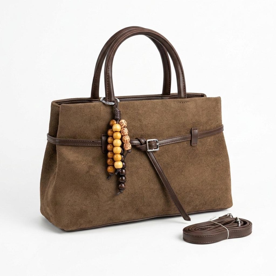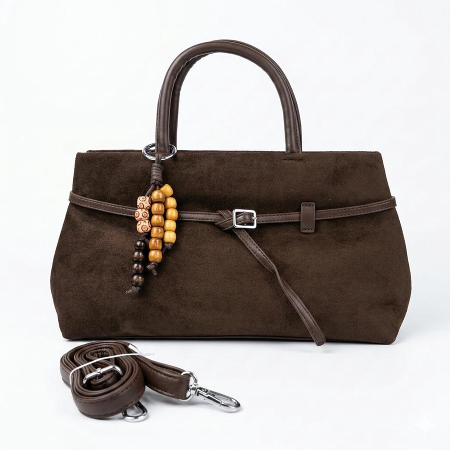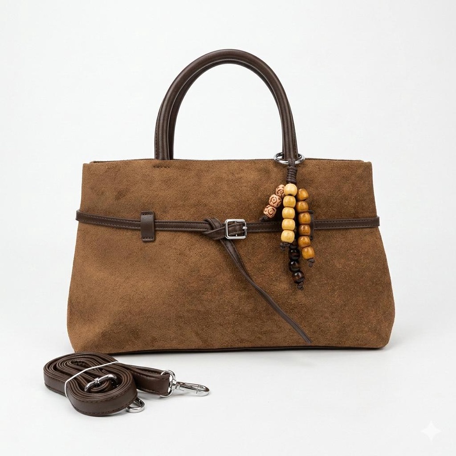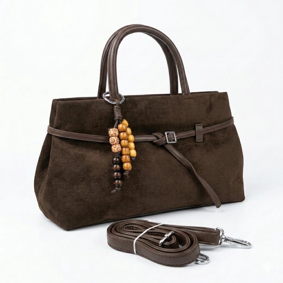 تألقي بالشنطة الشمواه الناعم تصميم يجمع بين الفخامة والعملية، مزين بتفاصيل جلدية بنية وإكسسوار خرز خشبي يمنحها لمسة "بوهو شيك" مميزة.