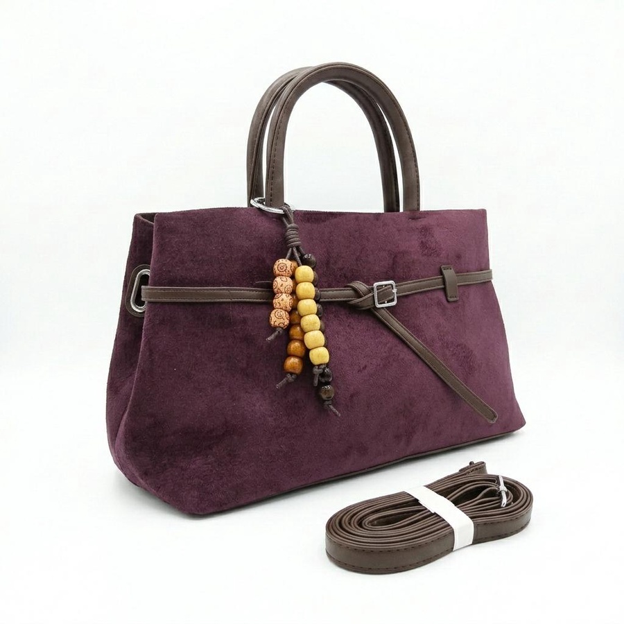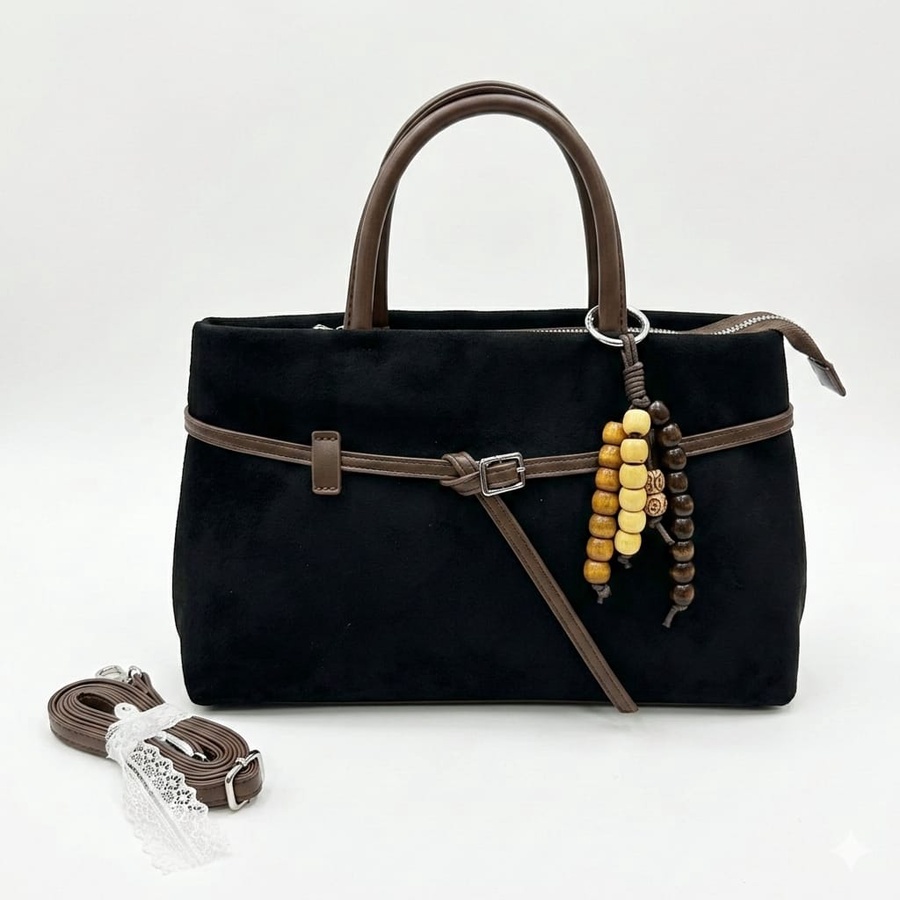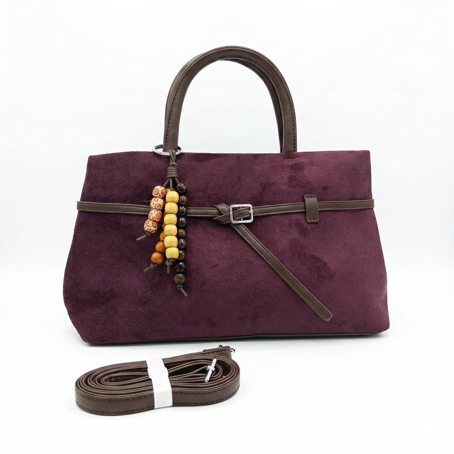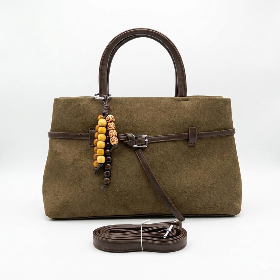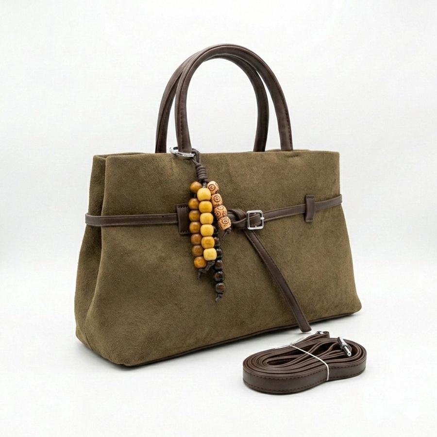 تألقي بالشنطة الشمواه الناعم تصميم يجمع بين الفخامة والعملية، مزين بتفاصيل جلدية بنية وإكسسوار خرز خشبي يمنحها لمسة "بوهو شيك" مميزة.