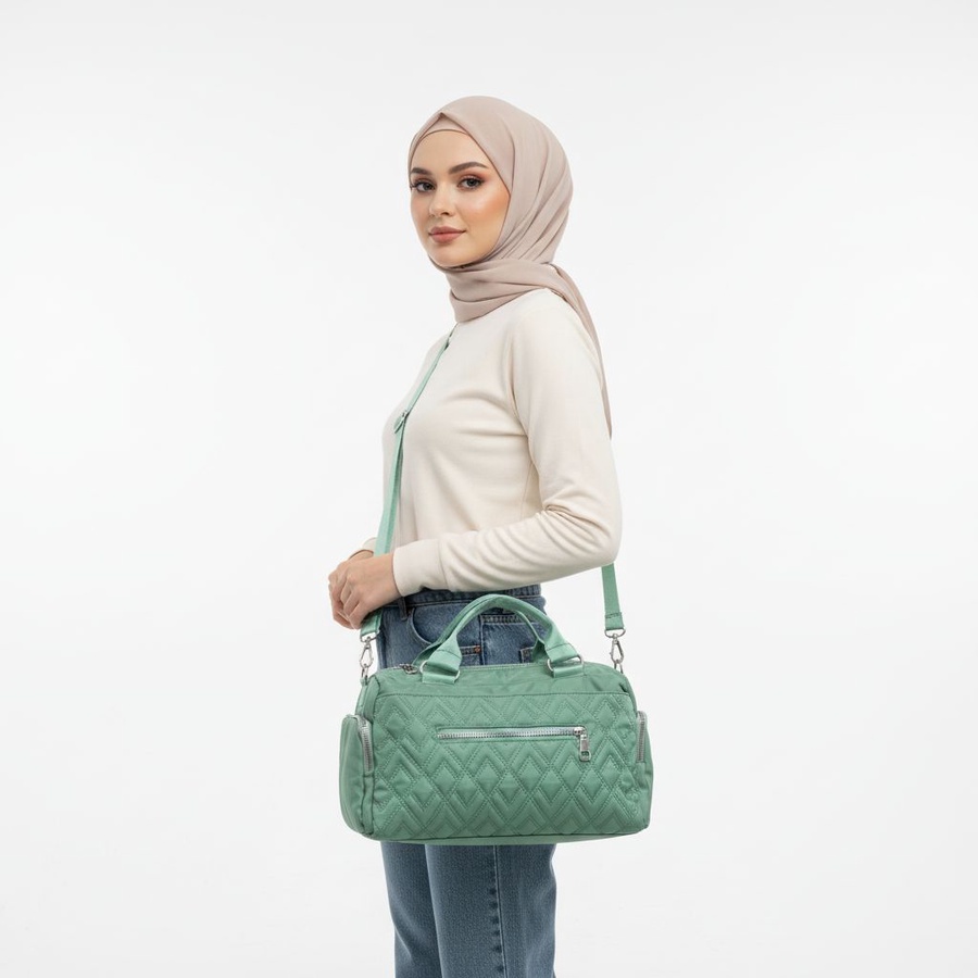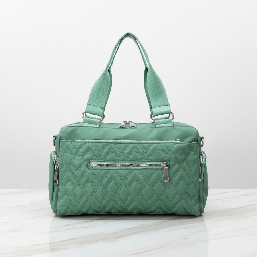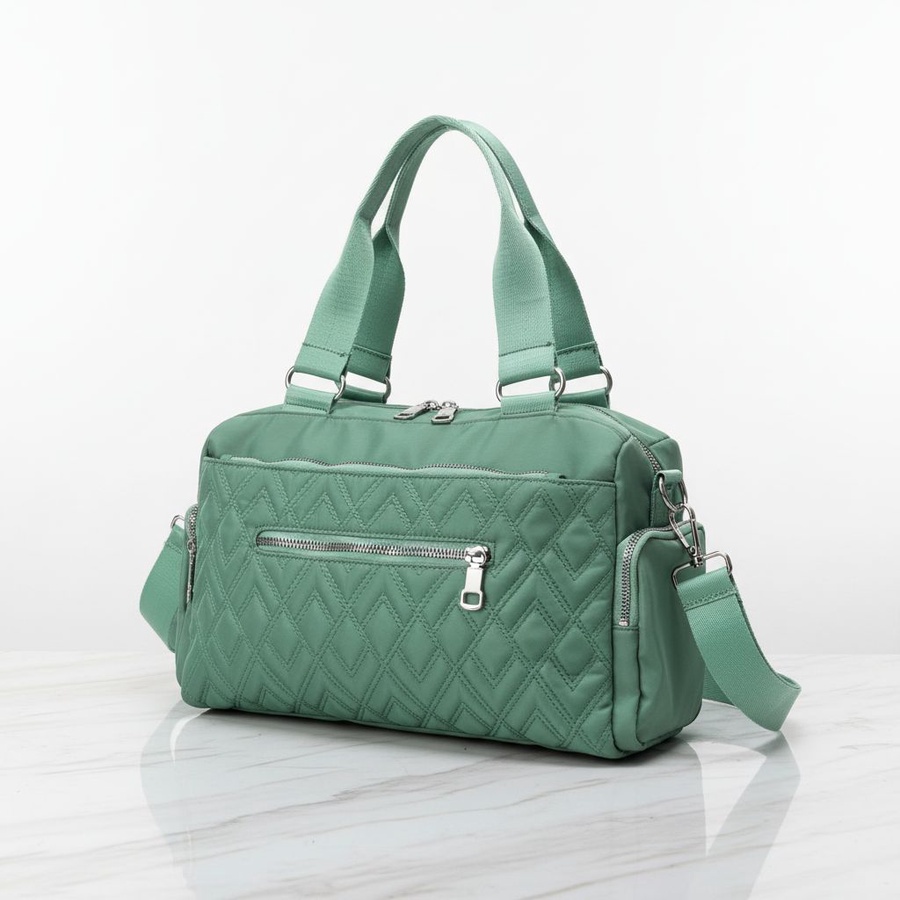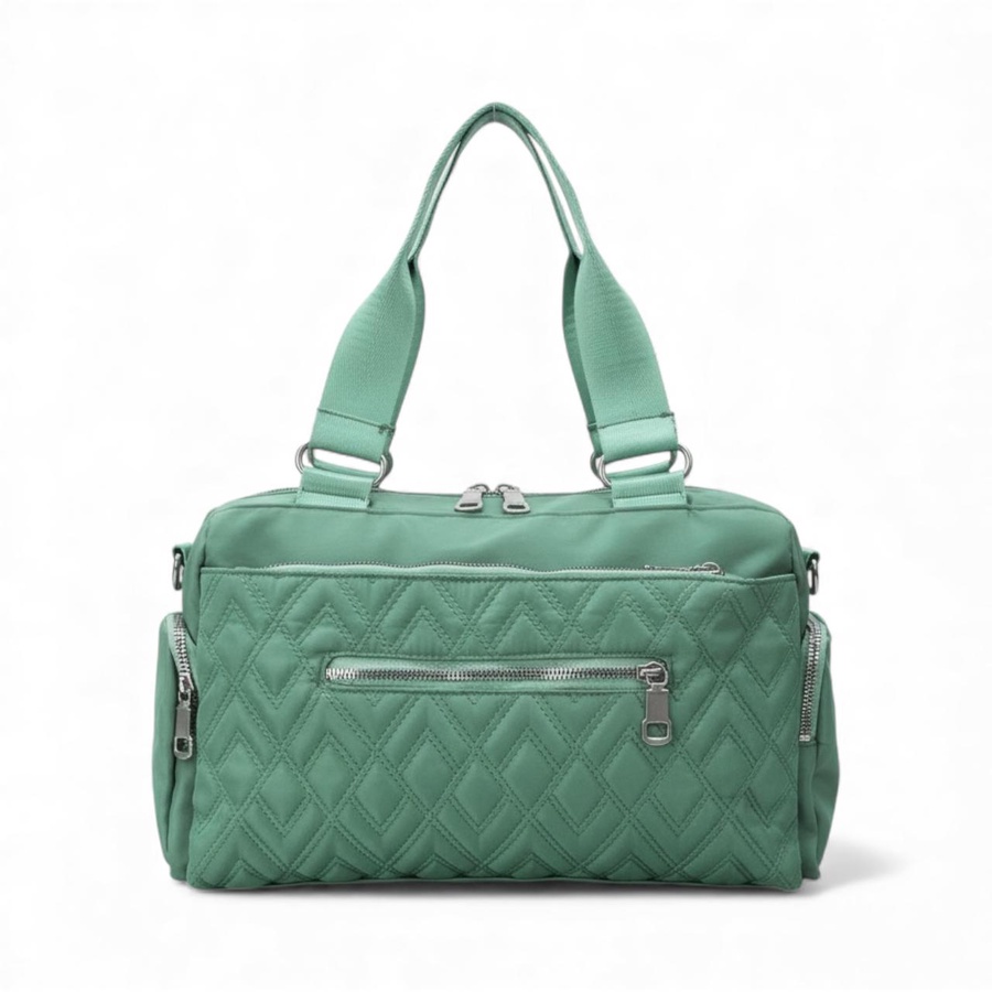 شنطة كروس معمولة للبنات اللي بتحب الشياكة وفي نفس الوقت عايزة شنطة عملية تشيل كل حاجتها، مساحتها تكفي طقم تغيير، فوطة، زجاجة مية، شنطة ميكب صغيرة، ومحفظة وموبايل من غير ما تبقى مزنوقة. الجزء الأمامي المبطّن بنقشة ألماس مع جيب بسوستة يخلي الشنطة شكلها أنثوي منظم، والجيوب الجانبية بسحاب تنفع للمفاتيح، السماعات أو المناديل.