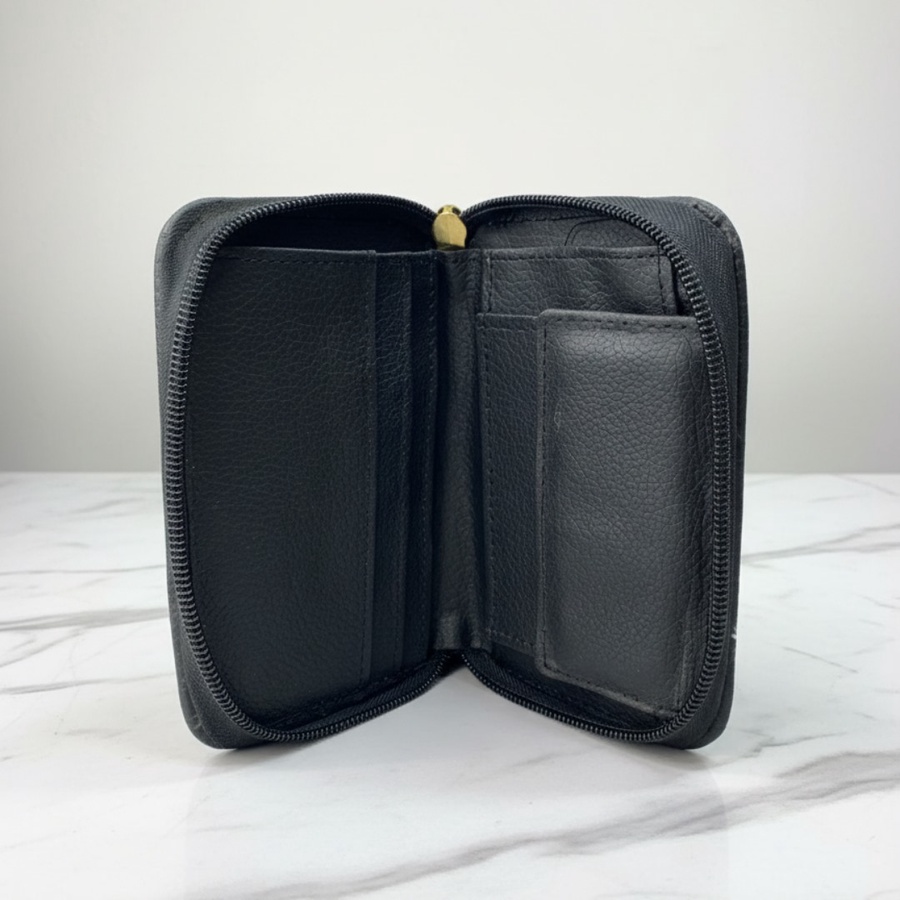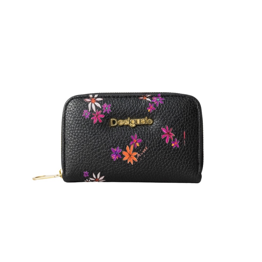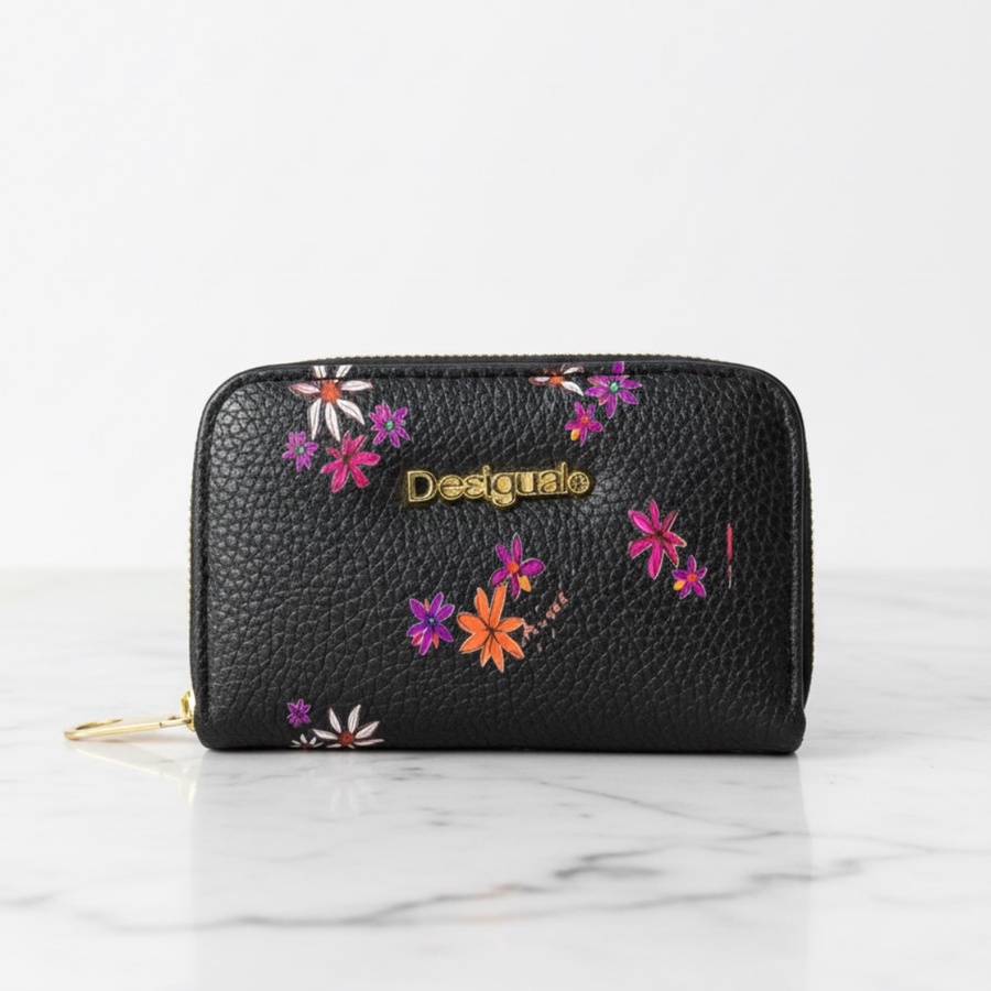محفظة صغيرة من Desigual من جلد محبب، مطبوعة مع لوجو معدني ذهبي وسوستة دائرية، عملية للكروت والكاش.