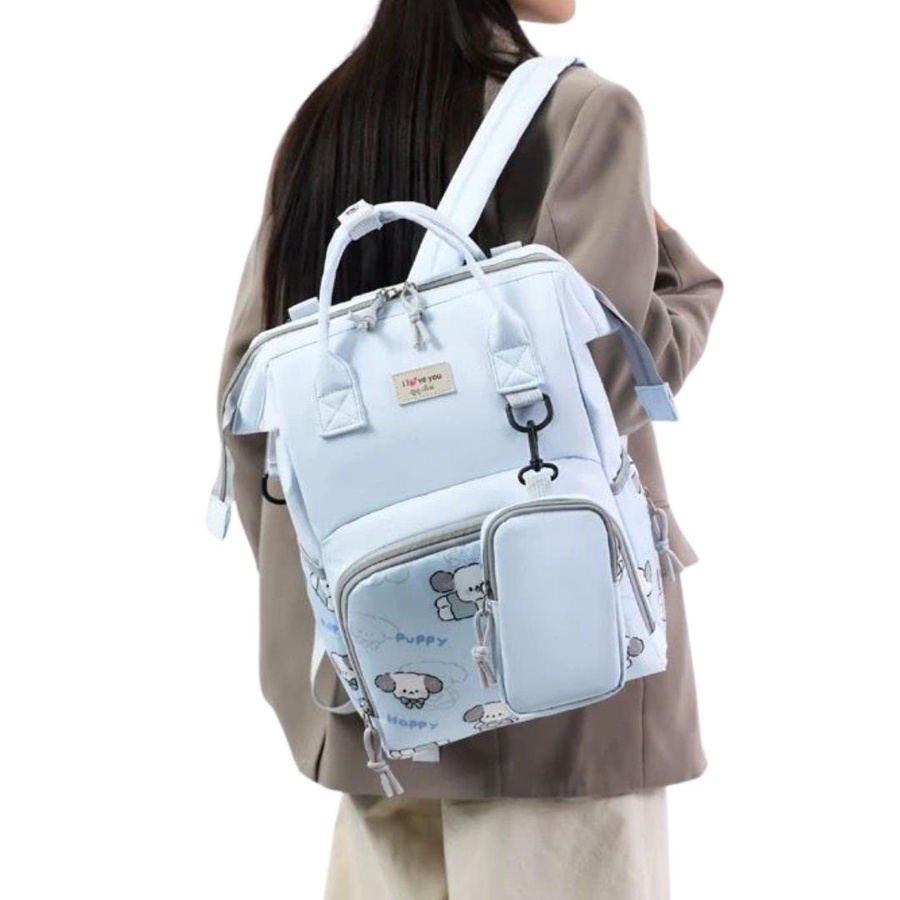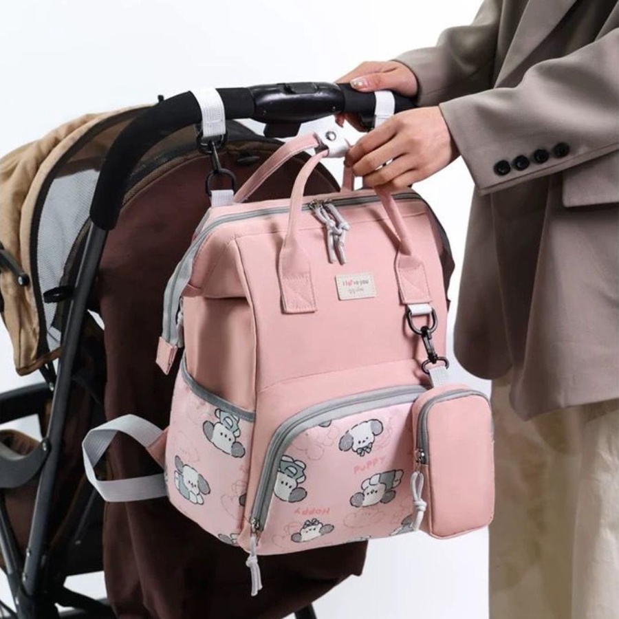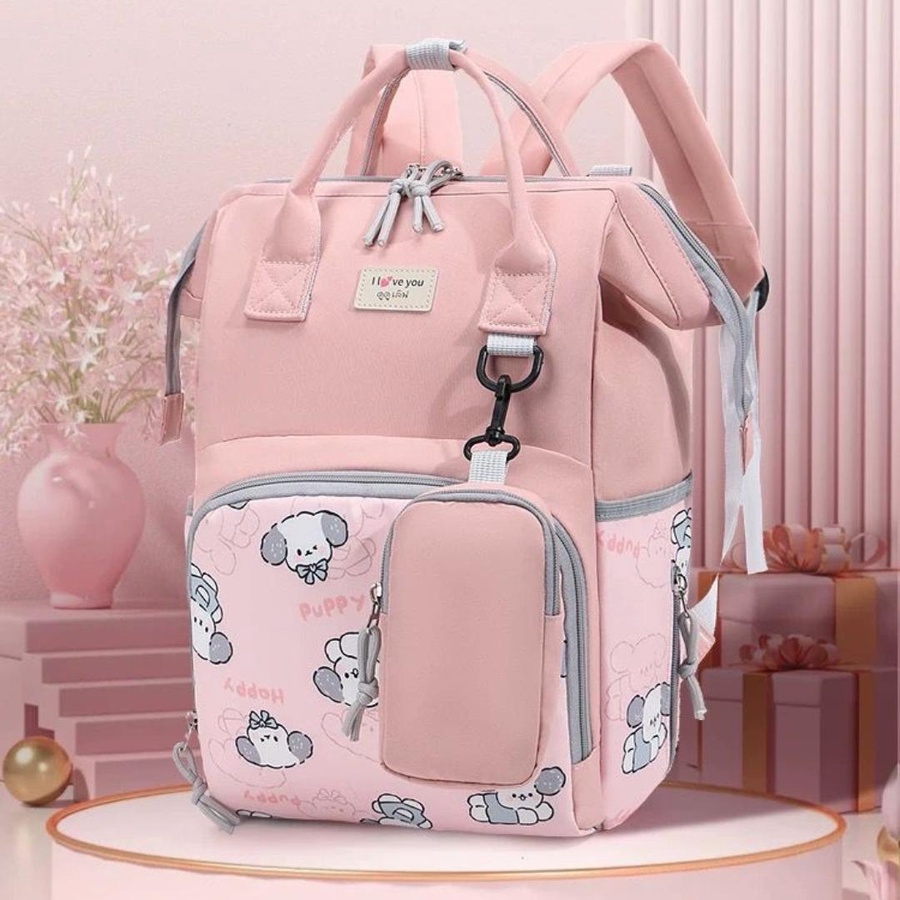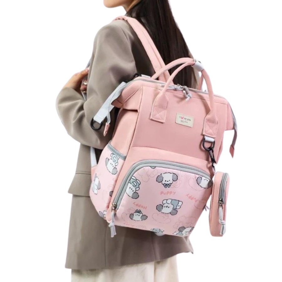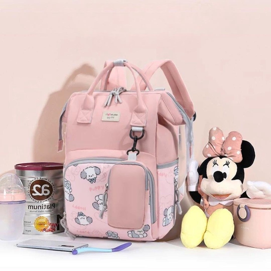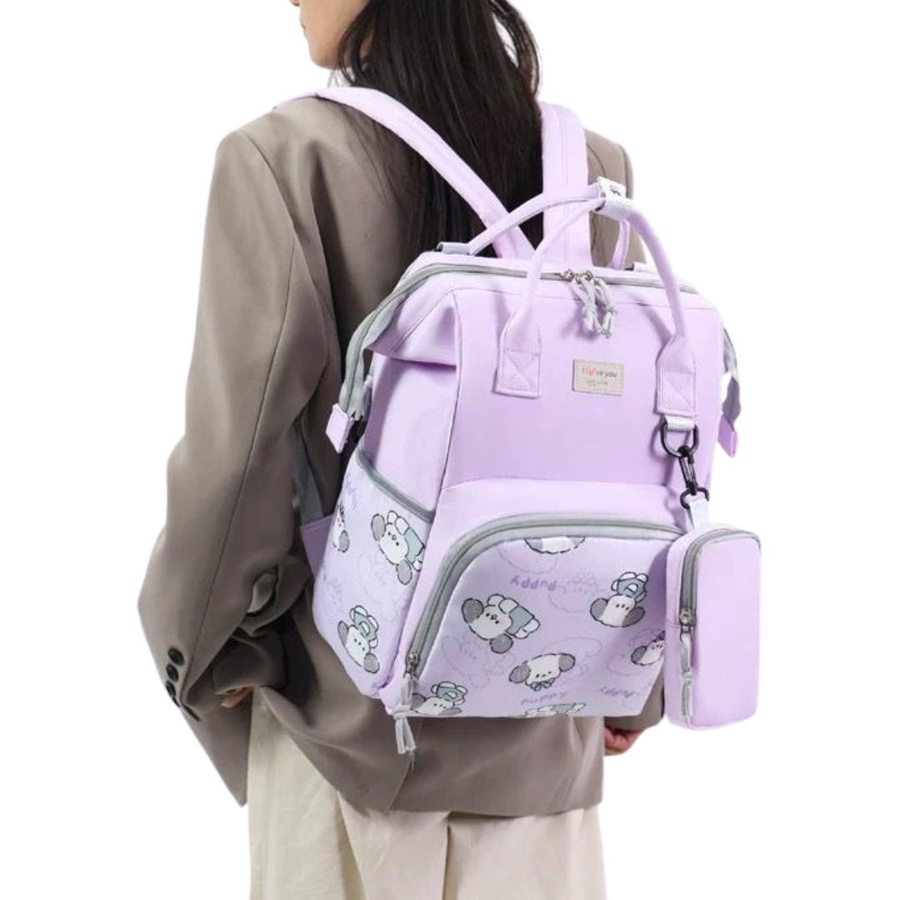 شنطة حفاضات للأمهات بتصميم كرتوني لطيف (Puppy) تجمع بين الشكل الأنيق والتنظيم العملي، علشان تبقى كل مستلزمات البيبي معاك مرتبة وسهل توصلي لها بسرعة. الشنطة مناسبة للاستخدام اليومي، للخروج، للمشاوير الطويلة، وكمان للسفر.