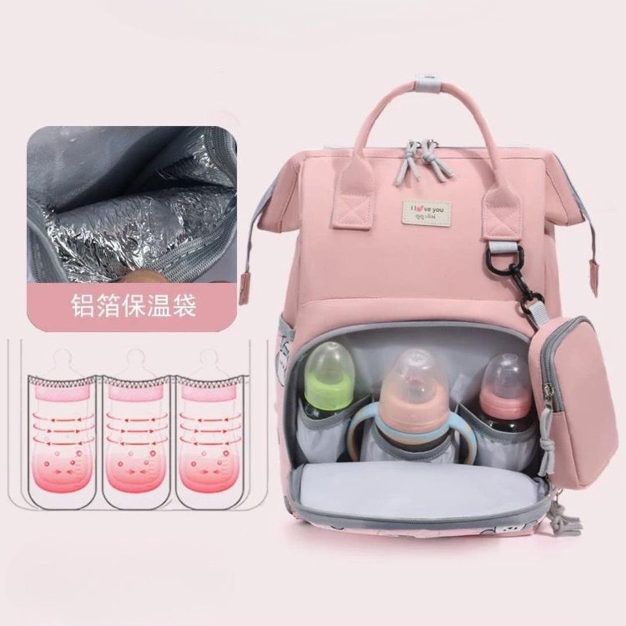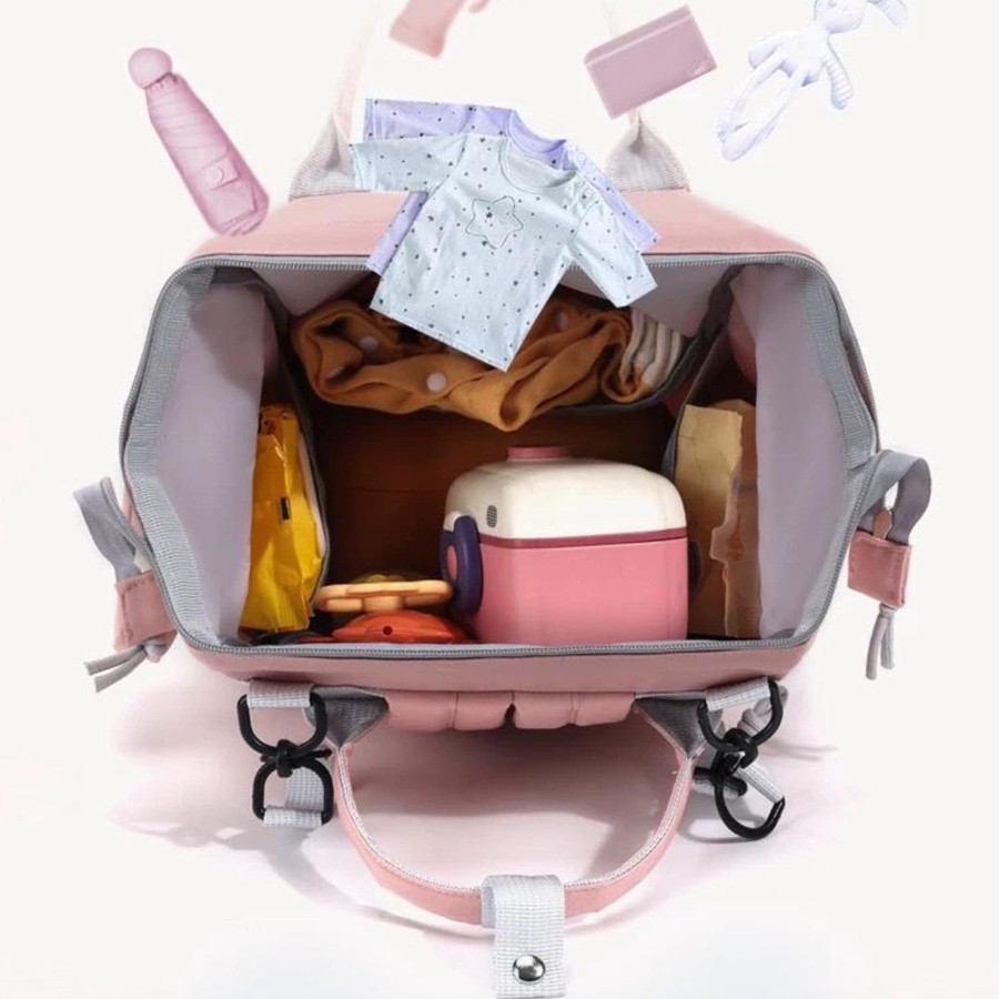 - سعة كبيرة وتنظيم ممتاز: تقسيمات وجيوب متعددة تساعدك ترتبي حفاضات، مناديل، ملابس إضافية، كريمات، ألعاب صغيرة… كل حاجة في مكانها.