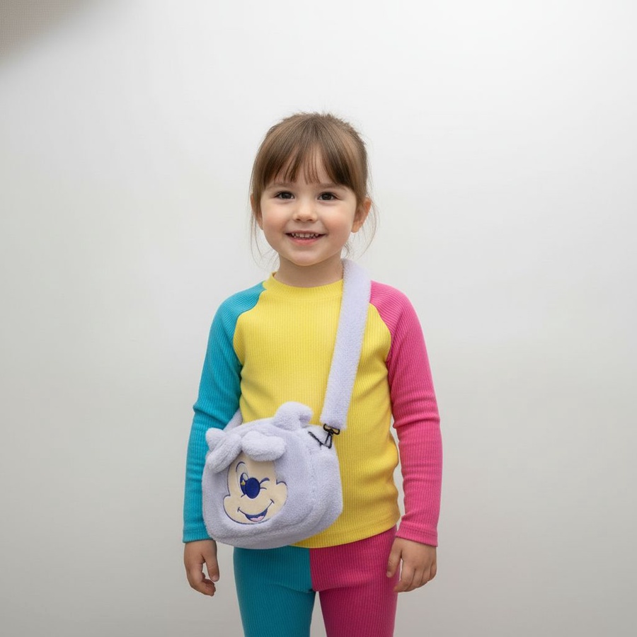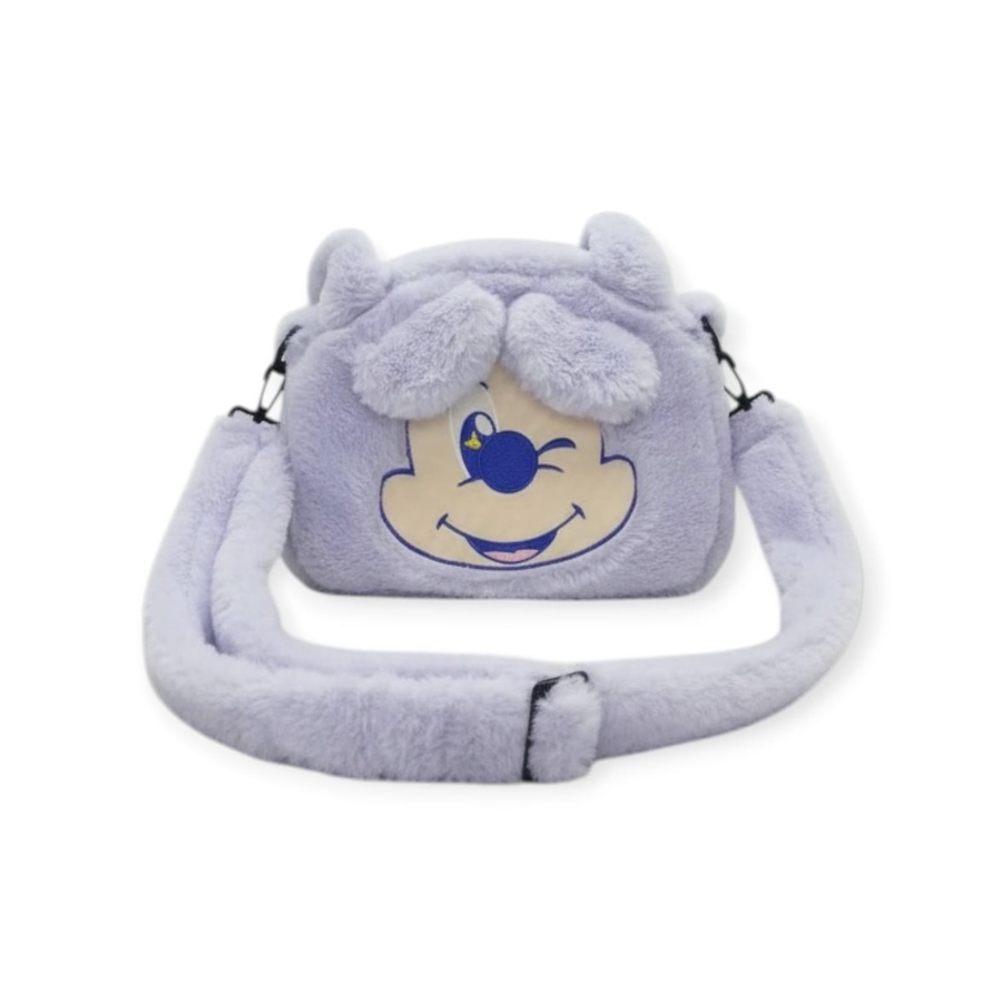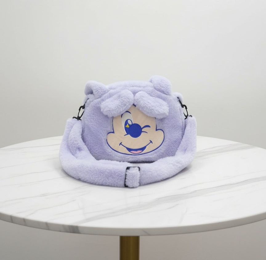 شنطة كروس فرو ناعمة للأطفال بلون بنفسجي فاتح، عليها وجه كرتوني يغمز وخامة سوفت مريحة في اللبس، مثالية كشنطة خروجات وهدايا للأطفال.
