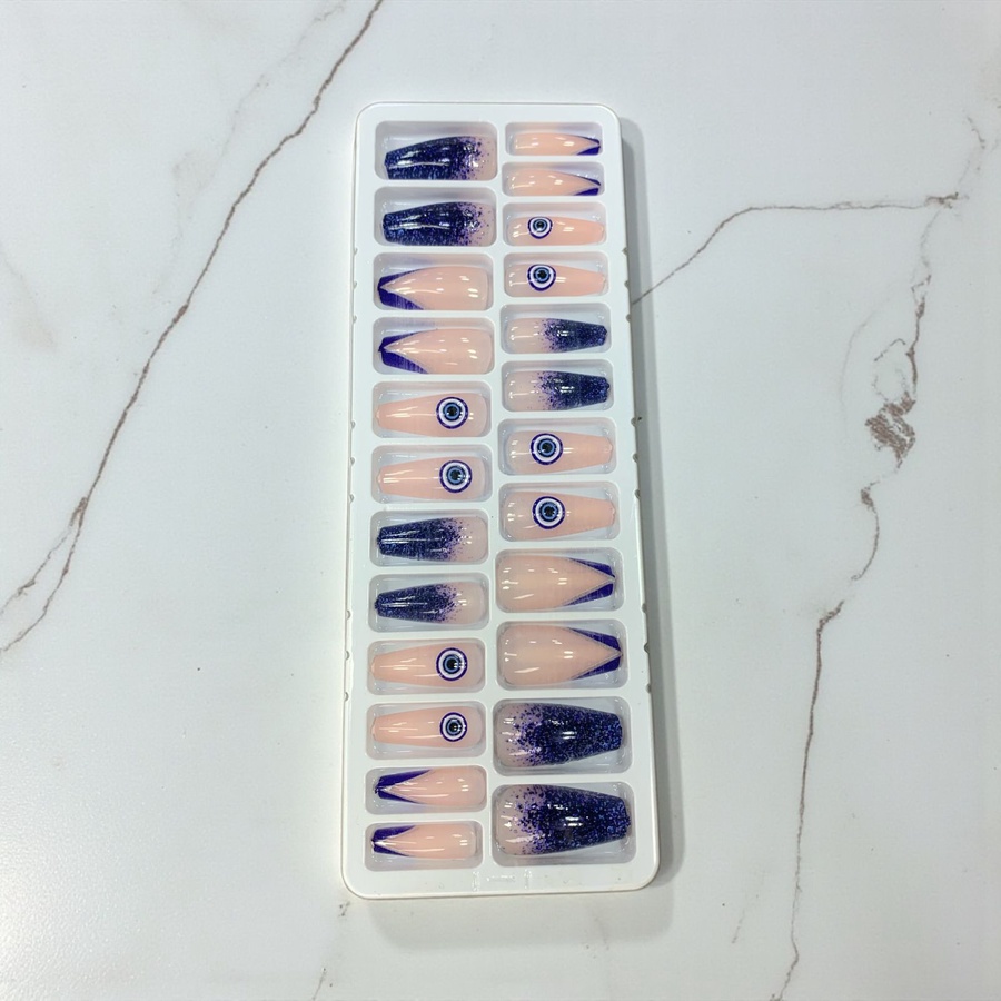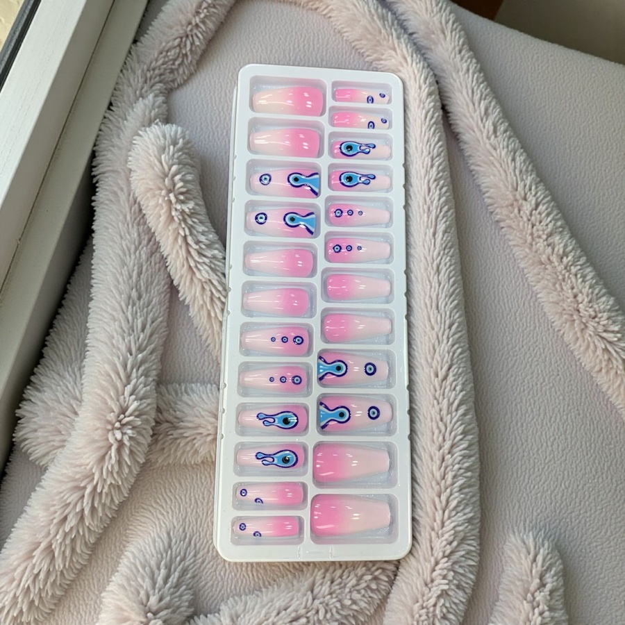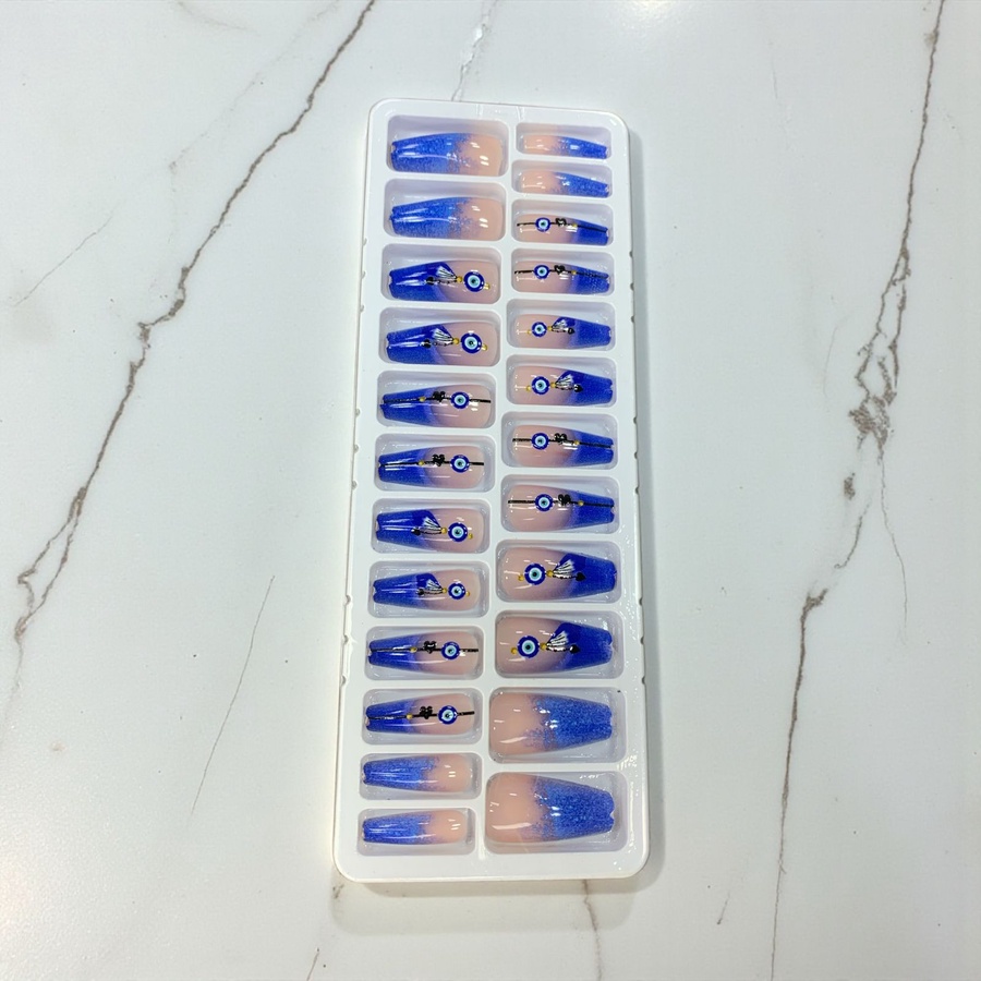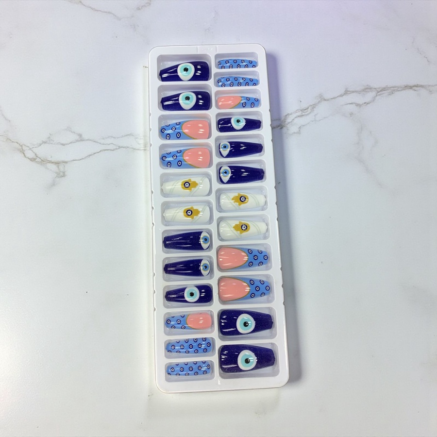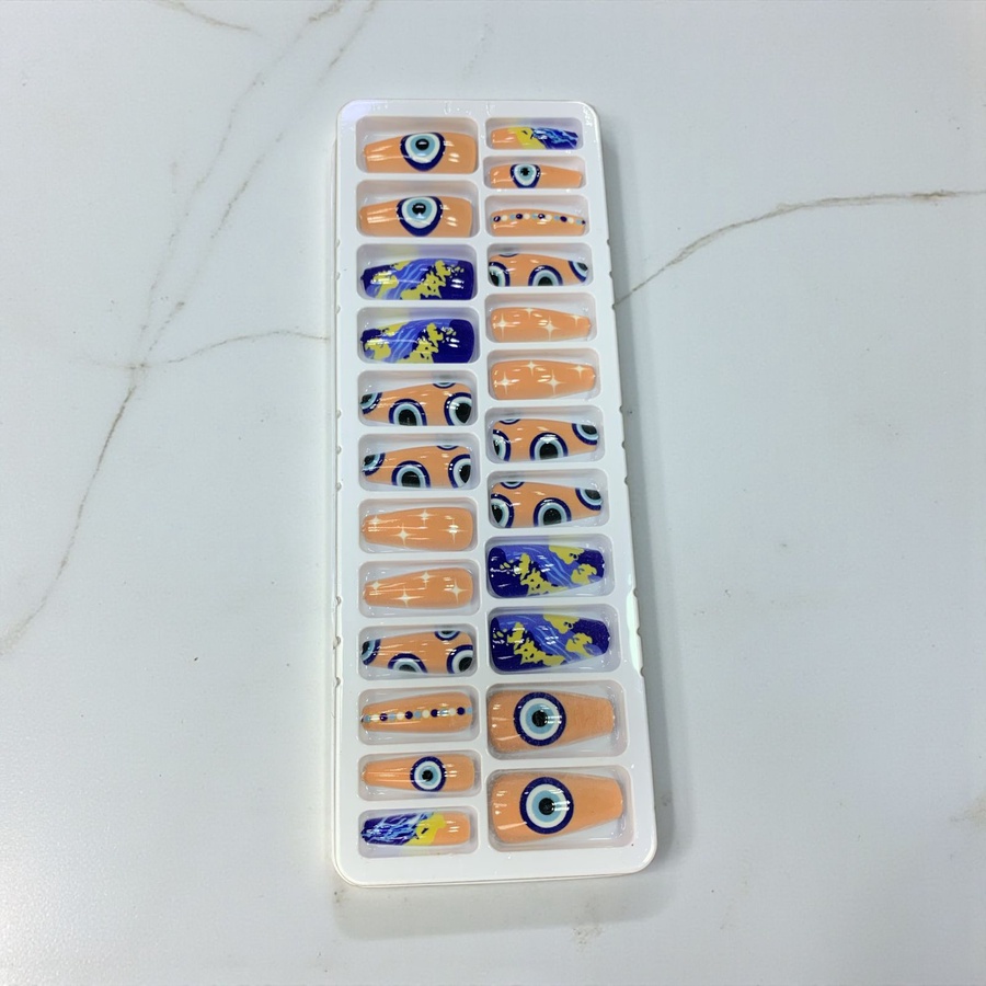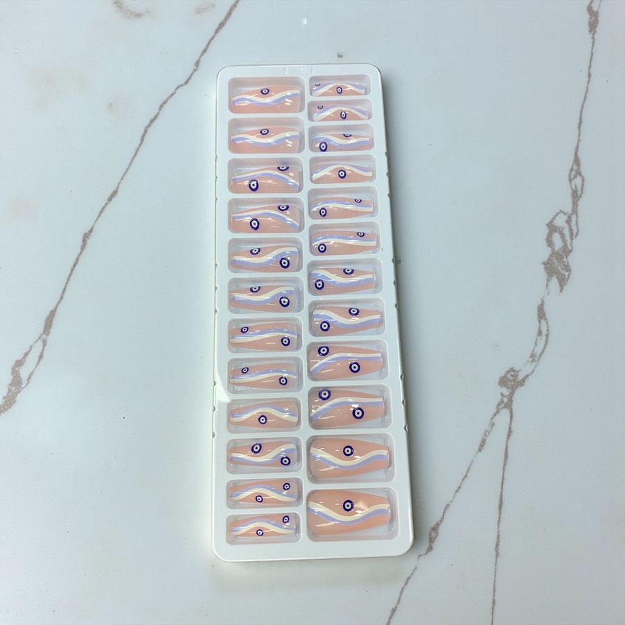 علبة أظافر تركيب شفافة بتصميم عين زرقاء (Evil Eye) مودرن جداً. رسومات تجريدية بألوان البيج والأزرق، ستايل صيفي وشبابي مميز. جودة عالية سهلة التركيب جداً.