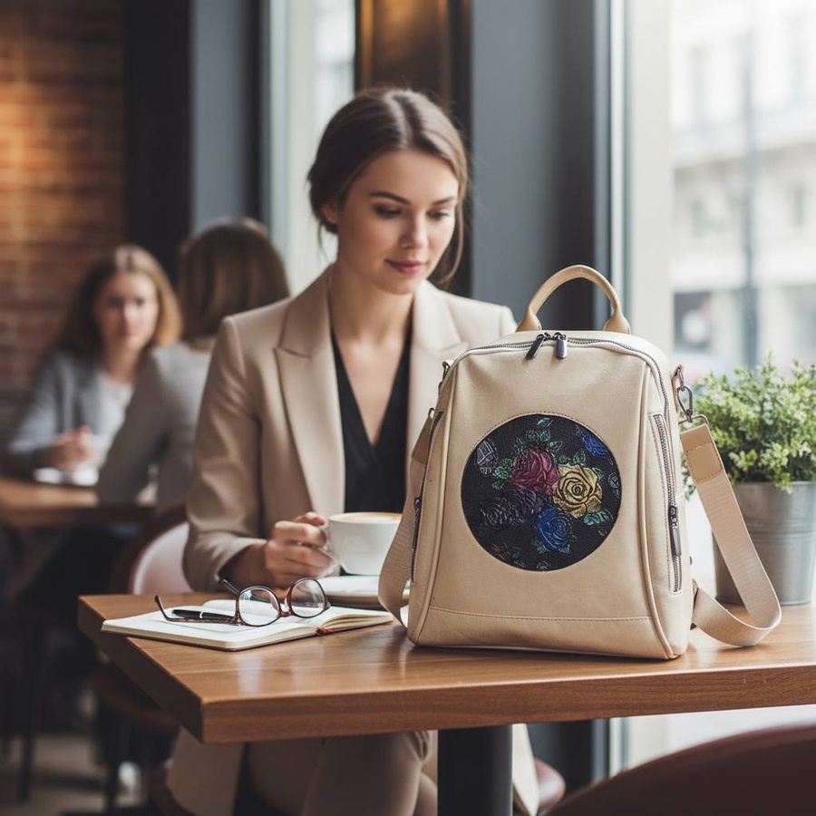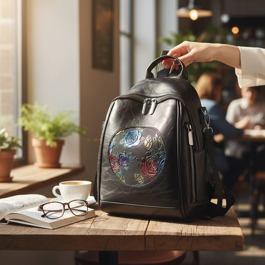 شنطة ظهر جلد (Leather Backpack) وتصميم "فنتيدج" (Vintage) مع نقشة ورد بارزة (Embossed). تتحول لشنطة كتف بحزام واحد، أنيقة جداً وعملية للخروجات والشغل والجامعة