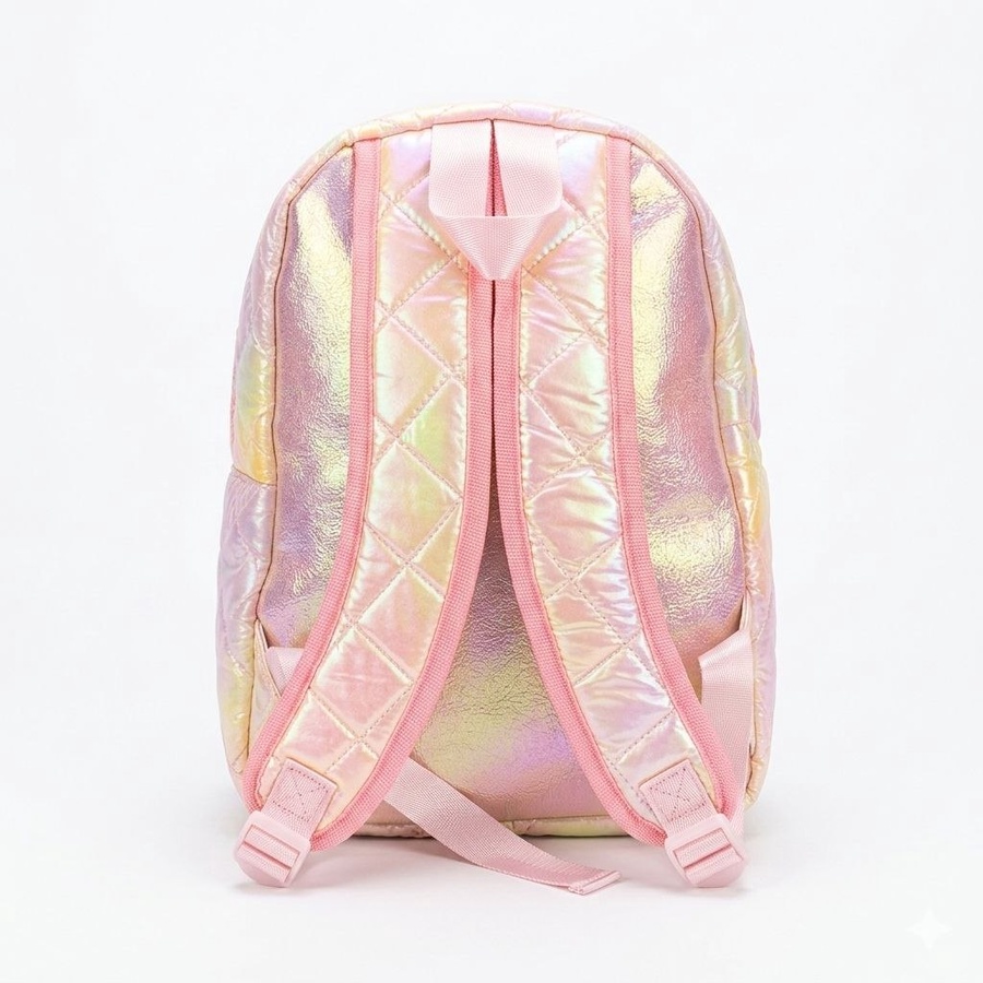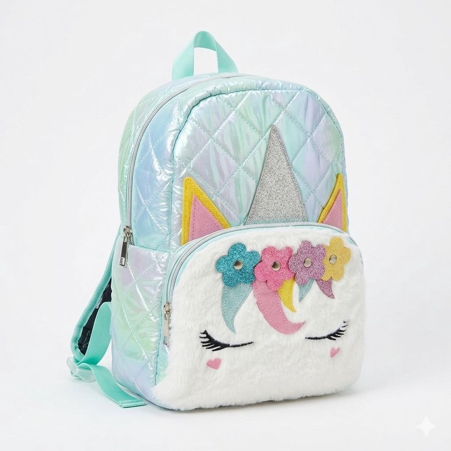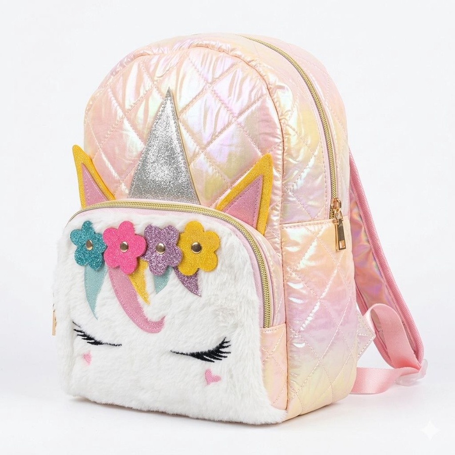 ✔️ جسم هولوجرام مبطن: الشنطة بتعكس ألوان الطيف مع النور، ومتخيطة بغرز مبطنة شكلها شيك وقيم جداً. ✔️ جيب فرو ناعم زي السحاب: الجيب اللي قدام فرو أبيض ناعم جداً عليه رموش اليونيكورن الكيوت. ✔️ تفاصيل 3D تجنن: قرن فضي بيلمع (جليتر)، وودان بارزة، وتاج ورد ألوانه تحفة مدي للشنطة بهجة مش طبيعية! 🌸🦄 ✔️ مساحتها حلوة جداً: للحضانة، النادي، أو خروجات العيد.