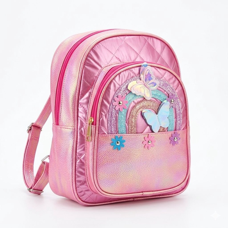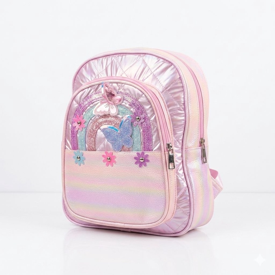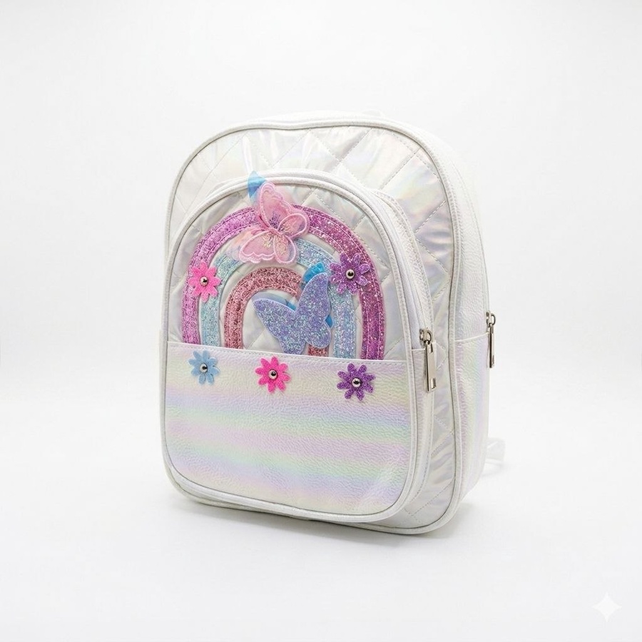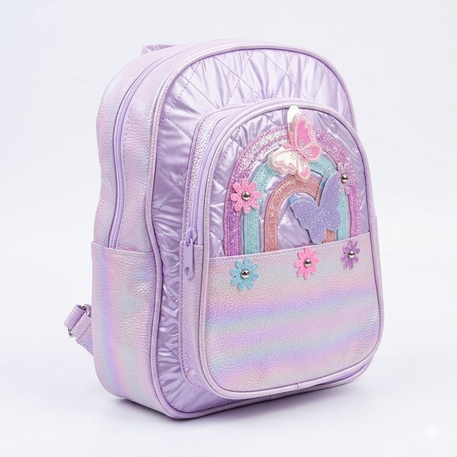 - تصميم خيالي بارز (3D): واجهة الجيب الأمامي مزينة برسمة "قوس قزح" من الجليتر اللامع، وتبرز منها فراشات هولوجرامية مجسمة (3D) مع لمسات من الزهور الصغيرة الملونة.