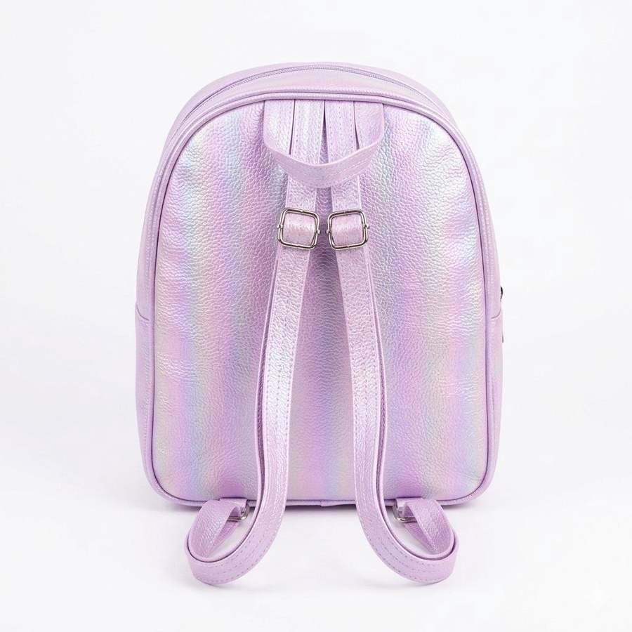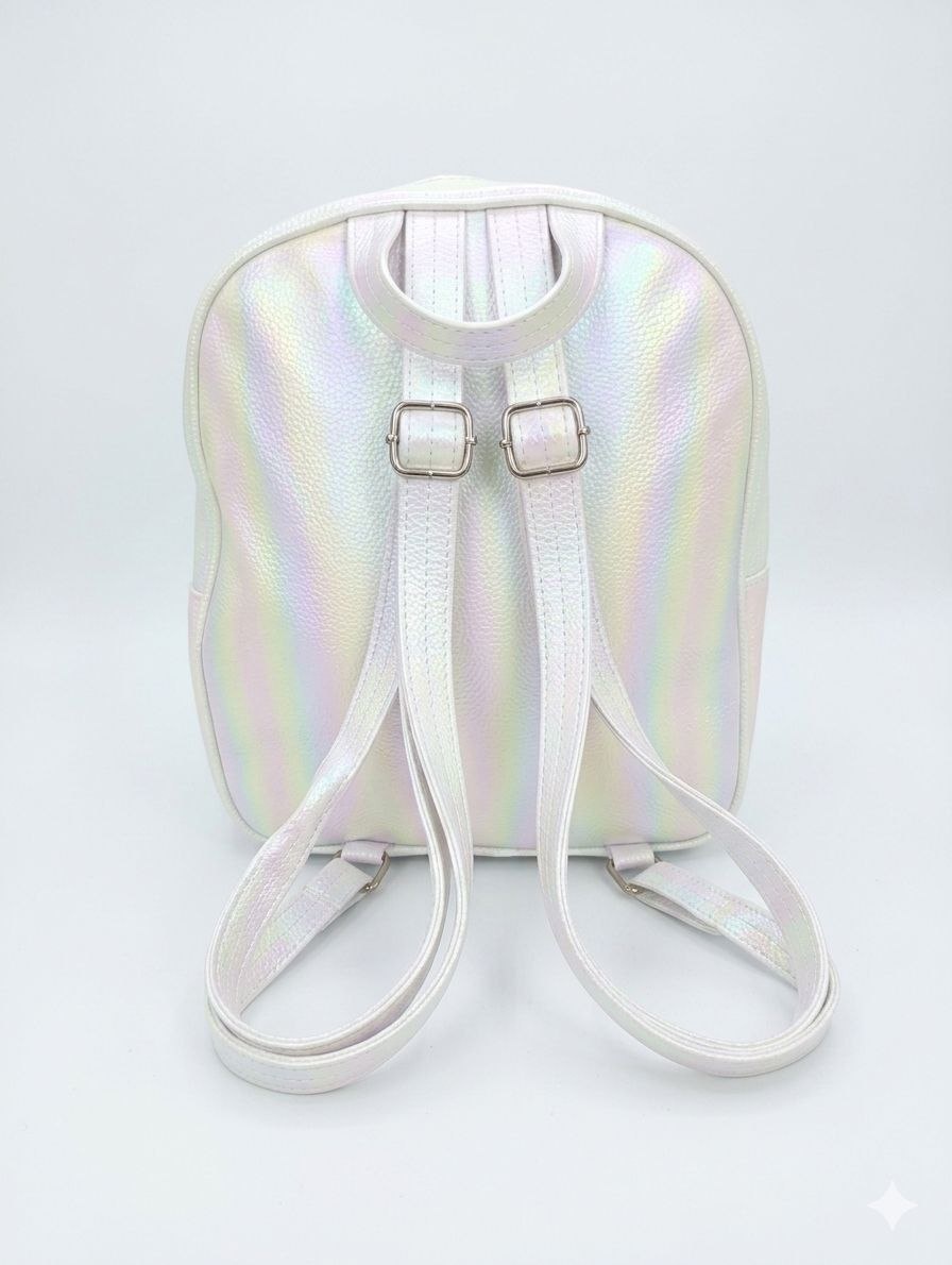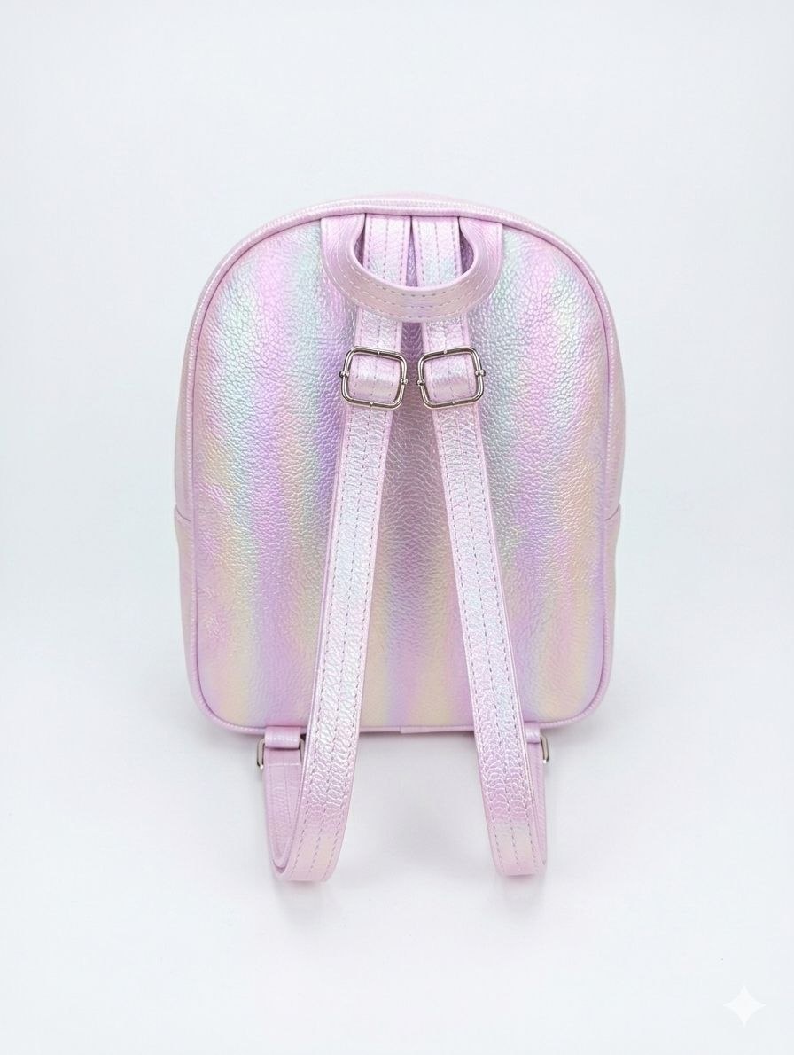 - تصميم خيالي بارز (3D): واجهة الجيب الأمامي مزينة برسمة "قوس قزح" من الجليتر اللامع، وتبرز منها فراشات هولوجرامية مجسمة (3D) مع لمسات من الزهور الصغيرة الملونة.