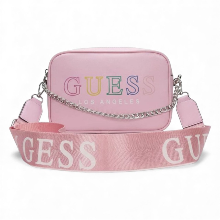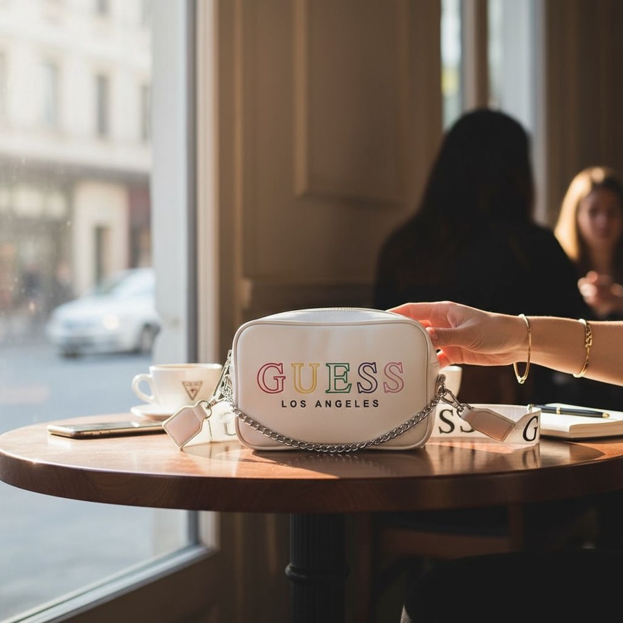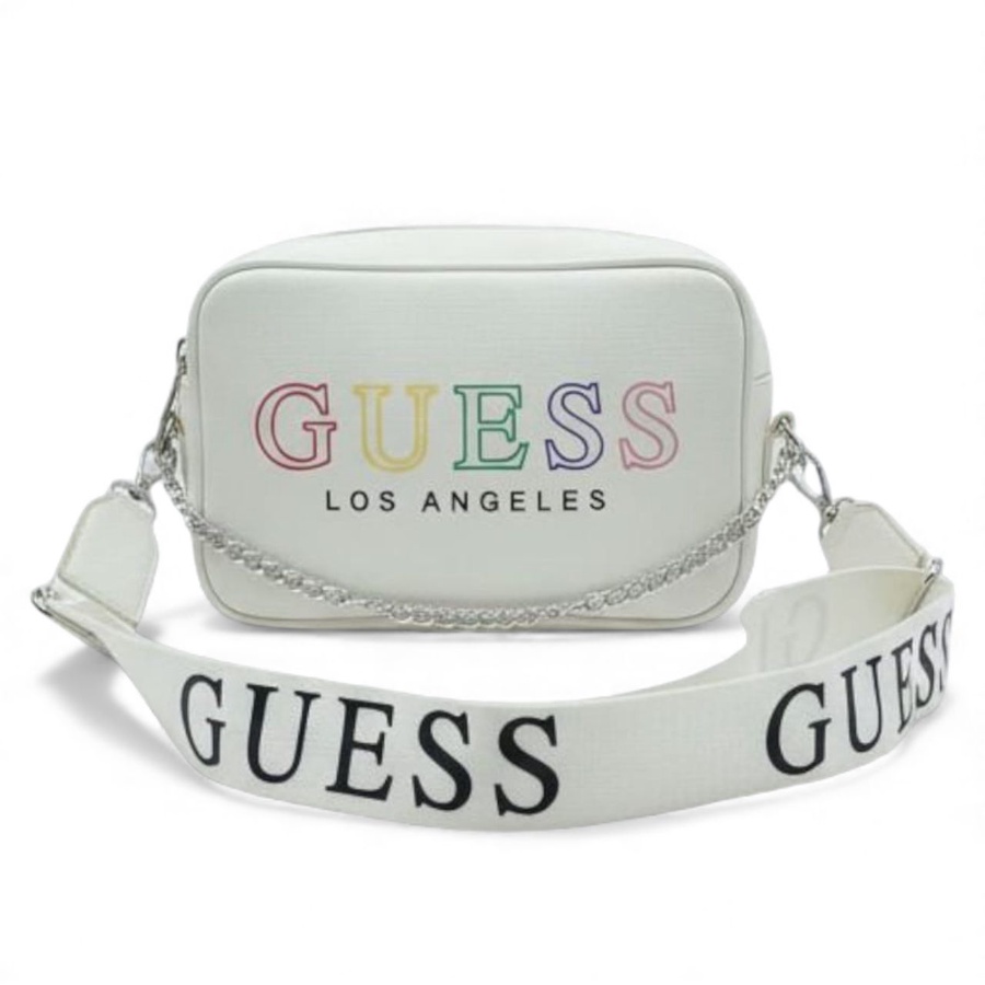 شنطة الكروس الحريمي Guess مناسبة للبنات اللي بتحب الستايل البراند اللطيف، حجمها الصغير يشيل الموبايل، المحفظة الصغيرة، المفاتيح وكام قطعة ميكب أساسية من غير ما تحسي إنها تقيلة. اللوجو الكبير على الوش مع السلسلة المعدنية الديكور وحزام الكتف العريض المكتوب عليه Guess يدي الشنطة شكل شبابي شيك يمشي مع الجينز، الفساتين الكاجوال أو أي طقم خروج بسيط.