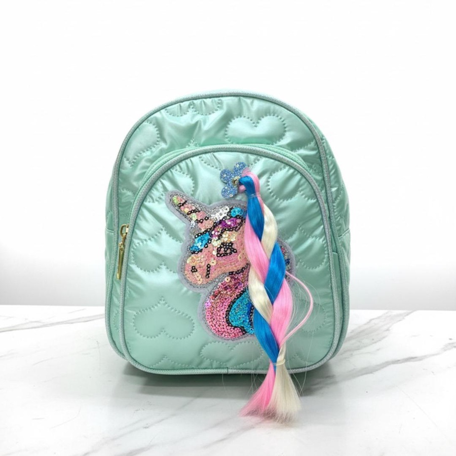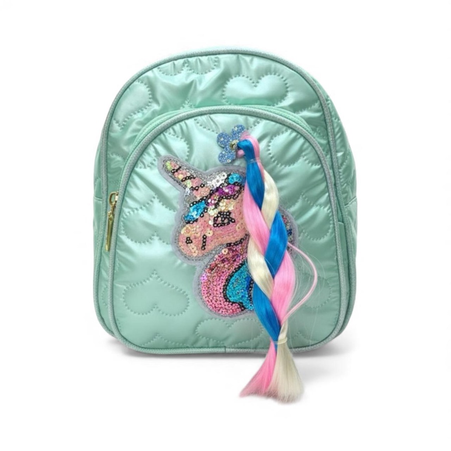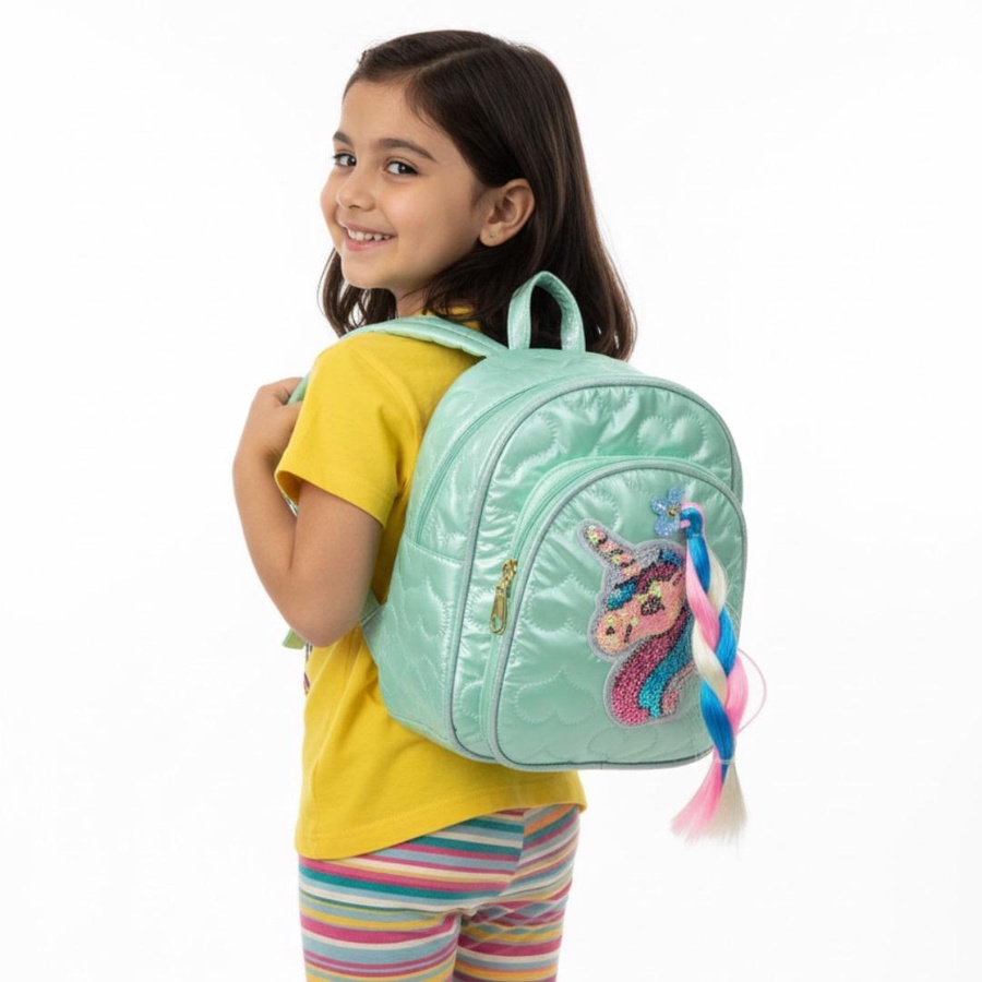 شنطة ظهر بناتي بشكل يونيكورن مع ضفيرة شعر ملونة، خامة مبطنة وخفيفة، مثالية للحضانة والمدرسة والخروجات.