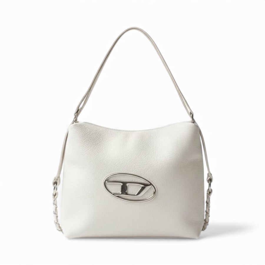 شنطة كتف حريمي من الجلد بتصميم بسيط وراقي، مزودة كتف علوي وسلسلة جانبية وشعار معدني في الأمام، سعة عملية تناسب الشغل والخروجات اليومية للسيدات