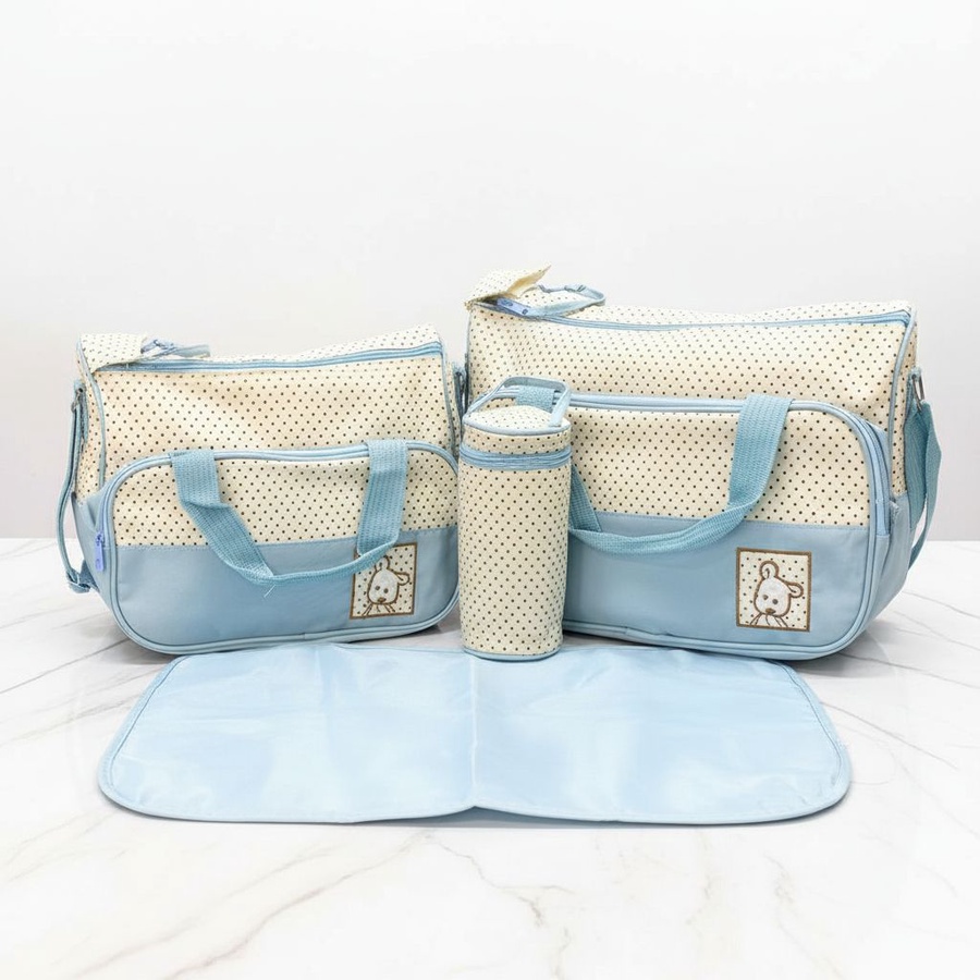 مجموعة شنط بيبي عملية تتضمن حقيبتين بأحجام مختلفة وحافظة رضّاعة وحصيرة تغيير مضادة للماء. مثالية للخروج مع طفلك وتوفر لكِ كل ما تحتاجينه بسهولة وتنظيم.