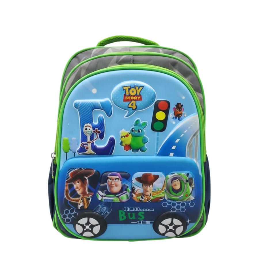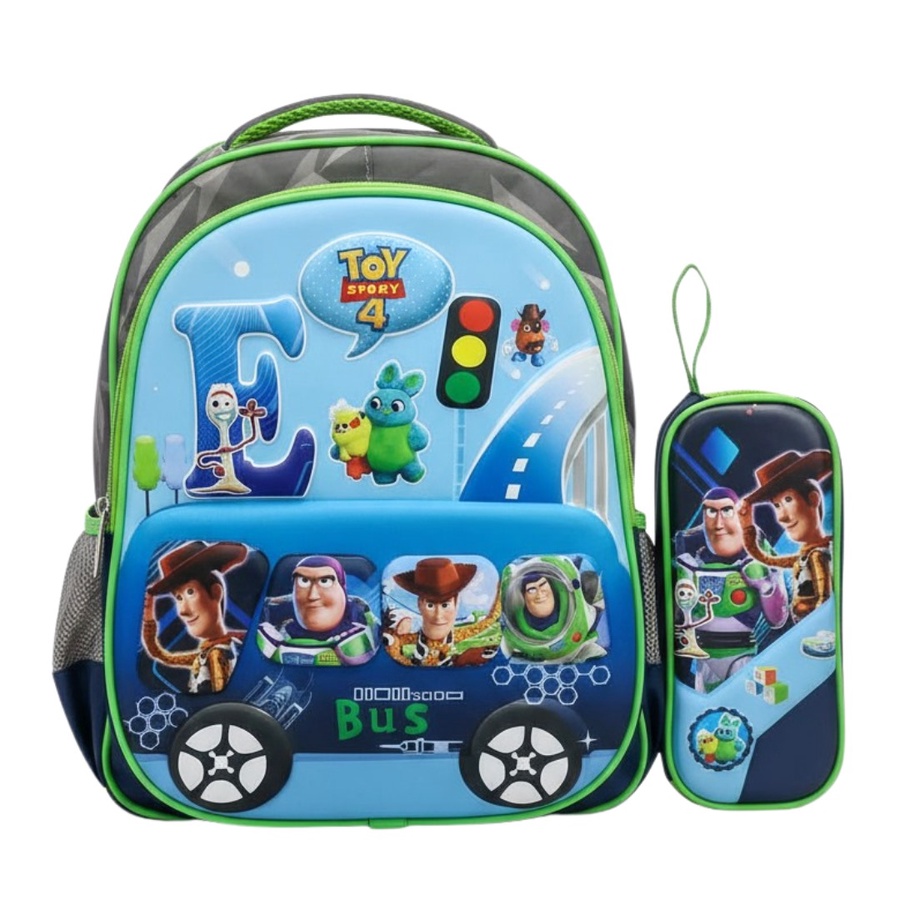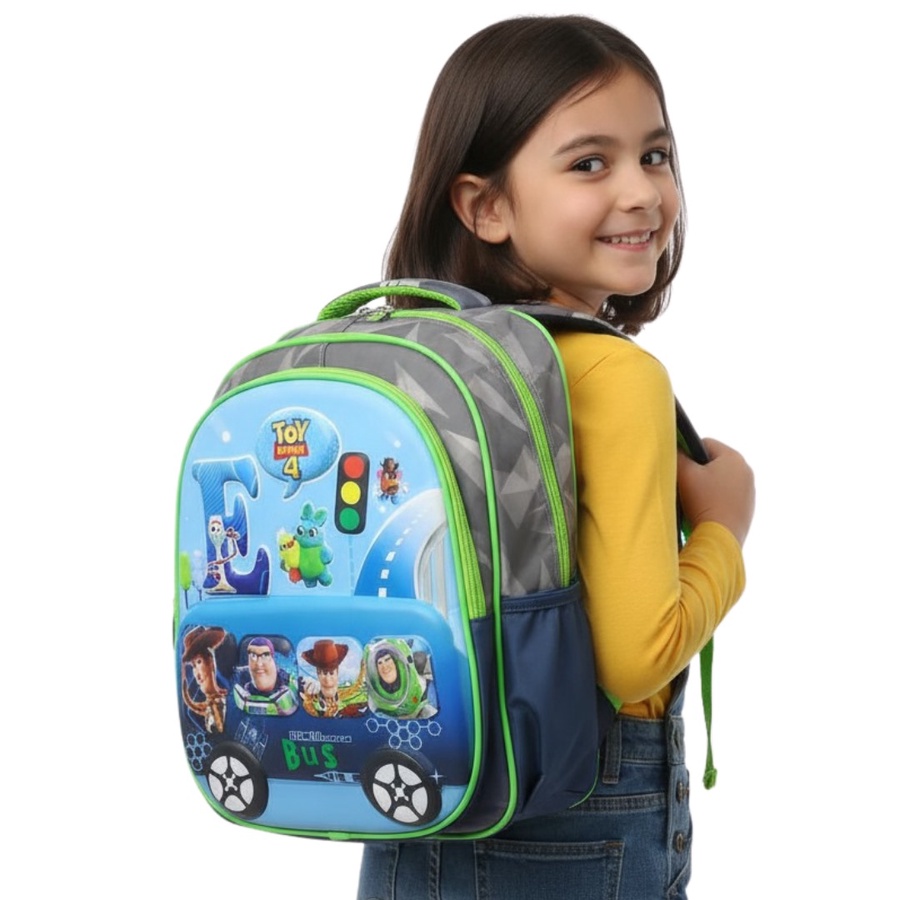 شنطة ظهر للأولاد بخلفية سماوي ورمادي وجوانب نيون جرين، مطبوعة عليها شخصيات Toy Story 4 الشهيرة مع شكل طريق وإشارة مرور، وجيب أمامي معمول على شكل أتوبيس فيه صور الأبطال في الشبابيك وكلمة Bus من تحت.