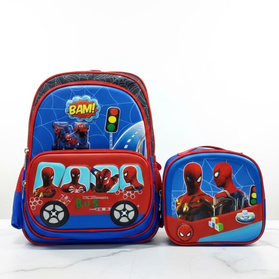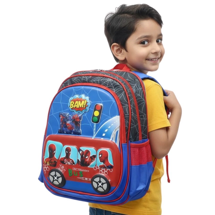 الشنطة بتيجي مع مقلمة جانبية بنفس رسمة الشخصيات، فيها جيب رئيسي واسع للكتب وزمزميات، وجيب أمامي بسوستة، وجيوب جانبية شبك، مع ظهر مبطن وحمالات كتف قابلة للتعديل علشان تبقى مريحة في الاستخدام اليومي للمدرسة أو الروضة.