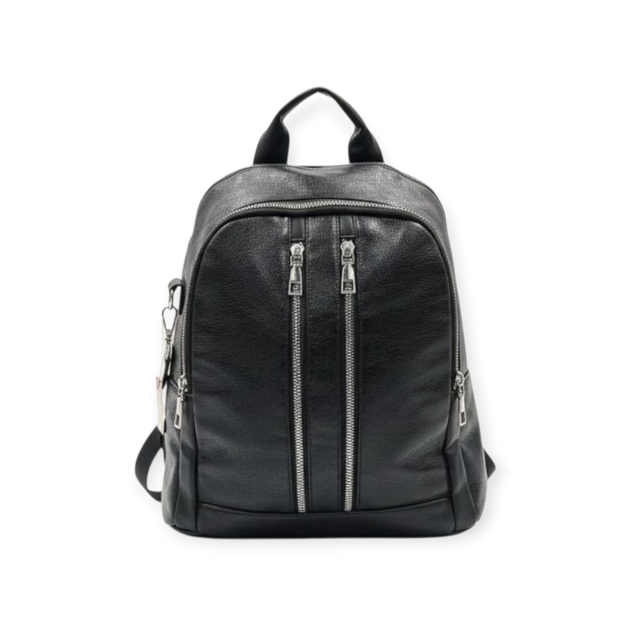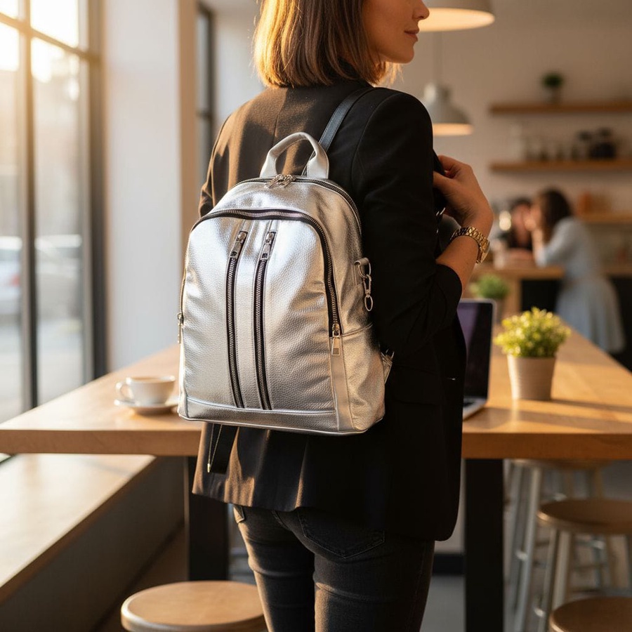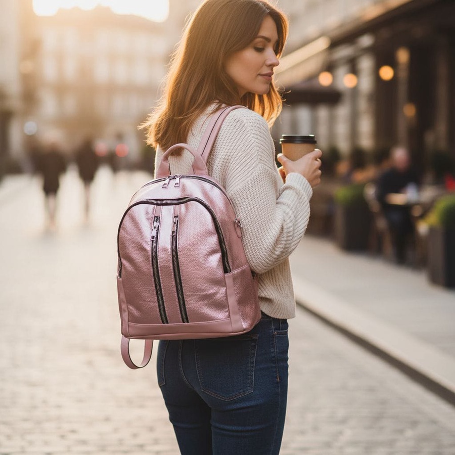 شنطة ظهر حريمي جلد (Faux Leather) بتصميم مميز من الأمام. متوفرة بألوان ميتاليك (فضي، ذهبي، روز) وألوان أساسية (أسود). عملية وشيك للجامعة والخروجات.