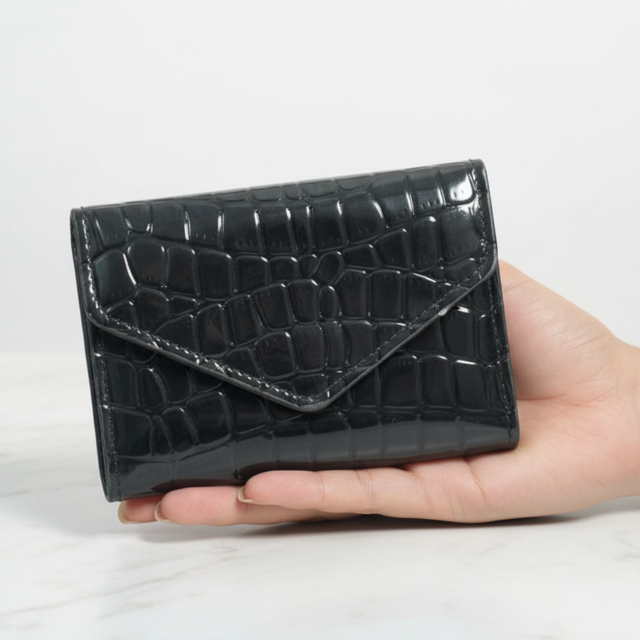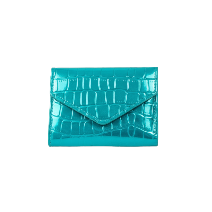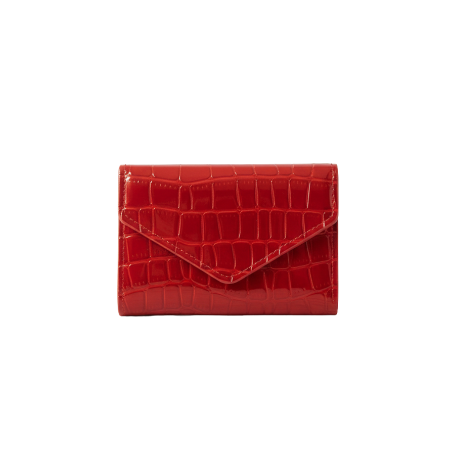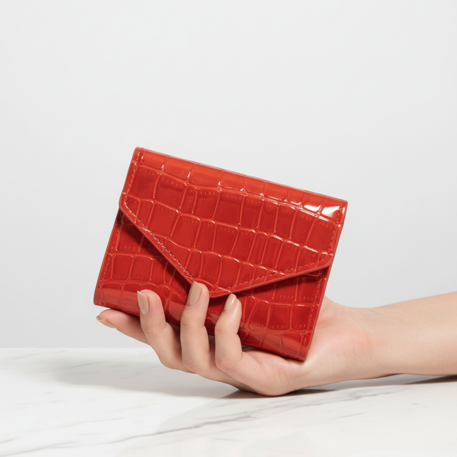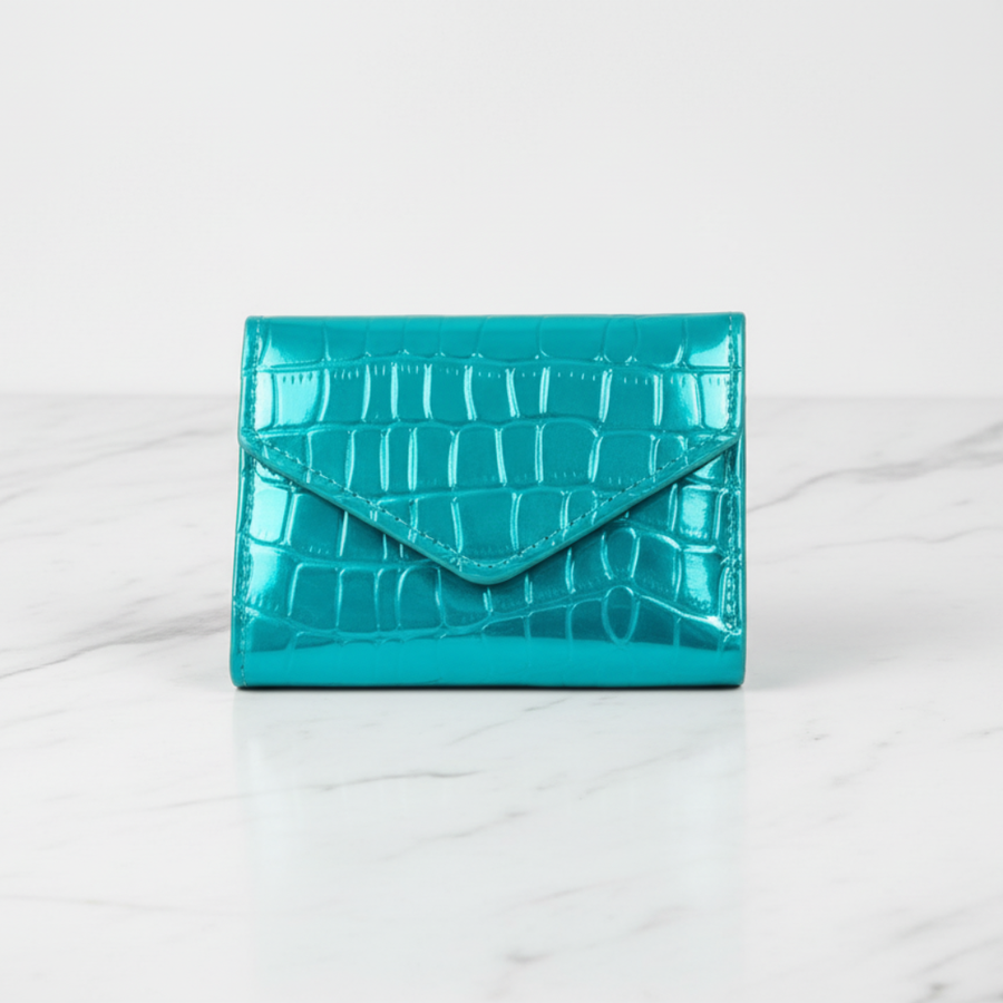 محفظة حريمي صغيرة ستايل ظرف، جلد لامع بنقشة مُجَعَّدة شيك، متاحة بألوان جريئة زي الأحمر، الفيروزي، الذهبي، الأسود والموف علشان تختاري على مزاجك.