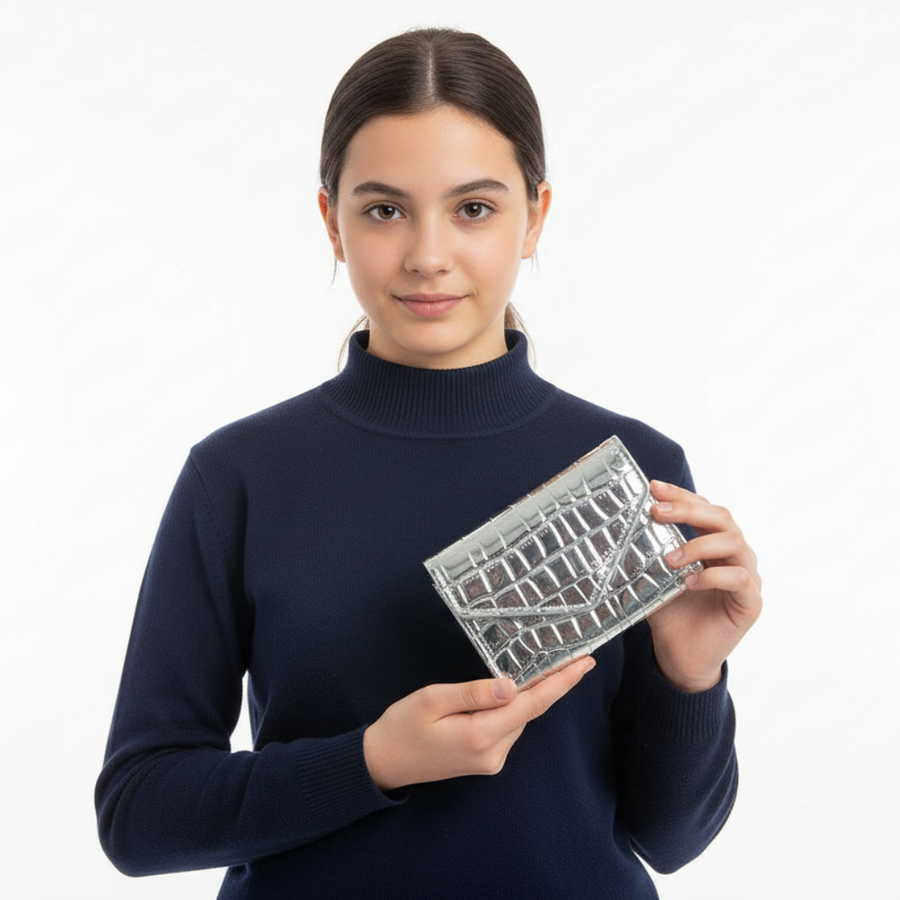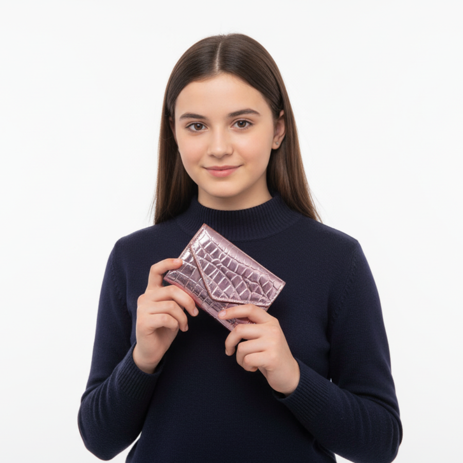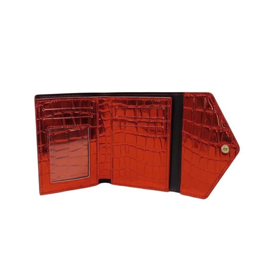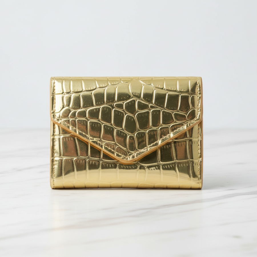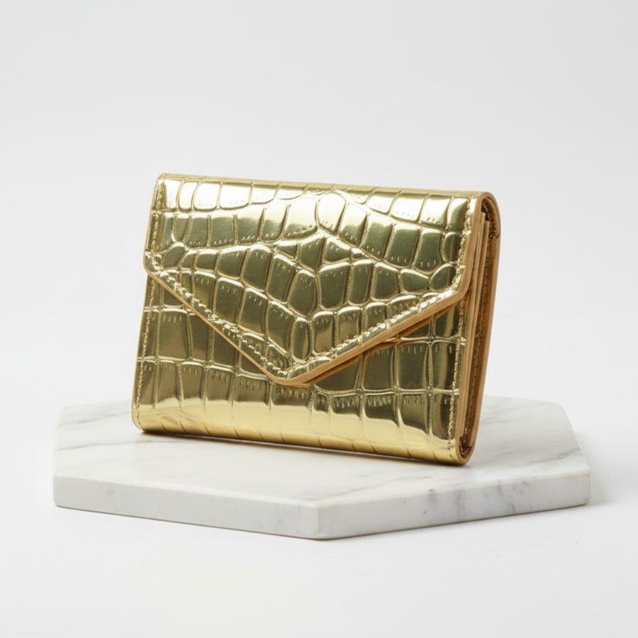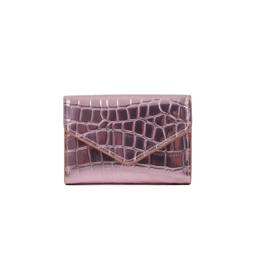 محفظة حريمي صغيرة ستايل ظرف، جلد لامع بنقشة مُجَعَّدة شيك، متاحة بألوان جريئة زي الأحمر، الفيروزي، الذهبي، الأسود والموف علشان تختاري على مزاجك.