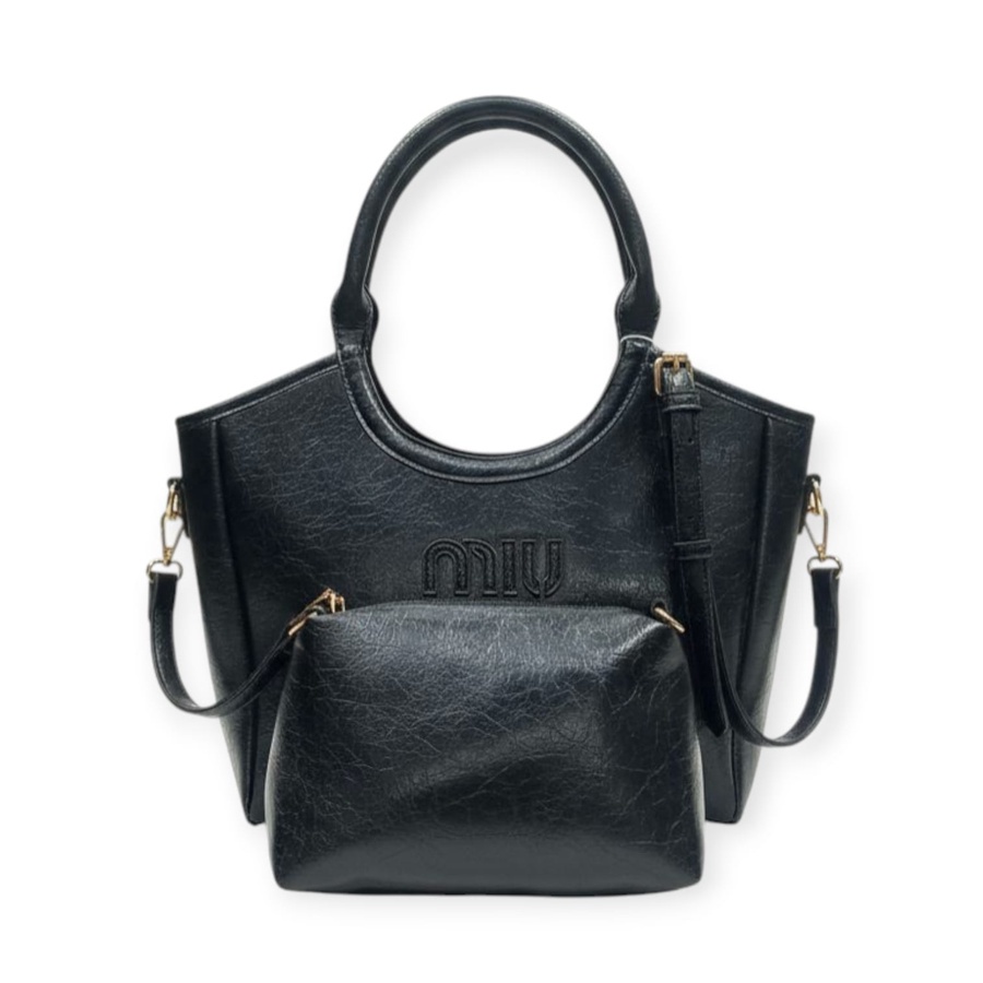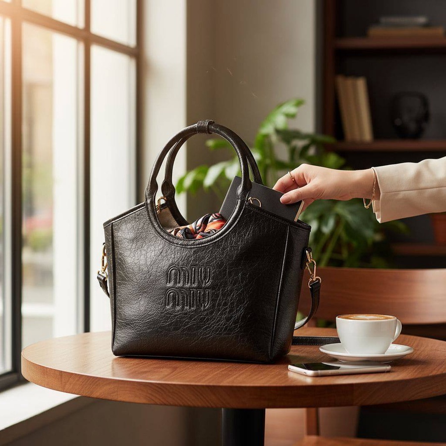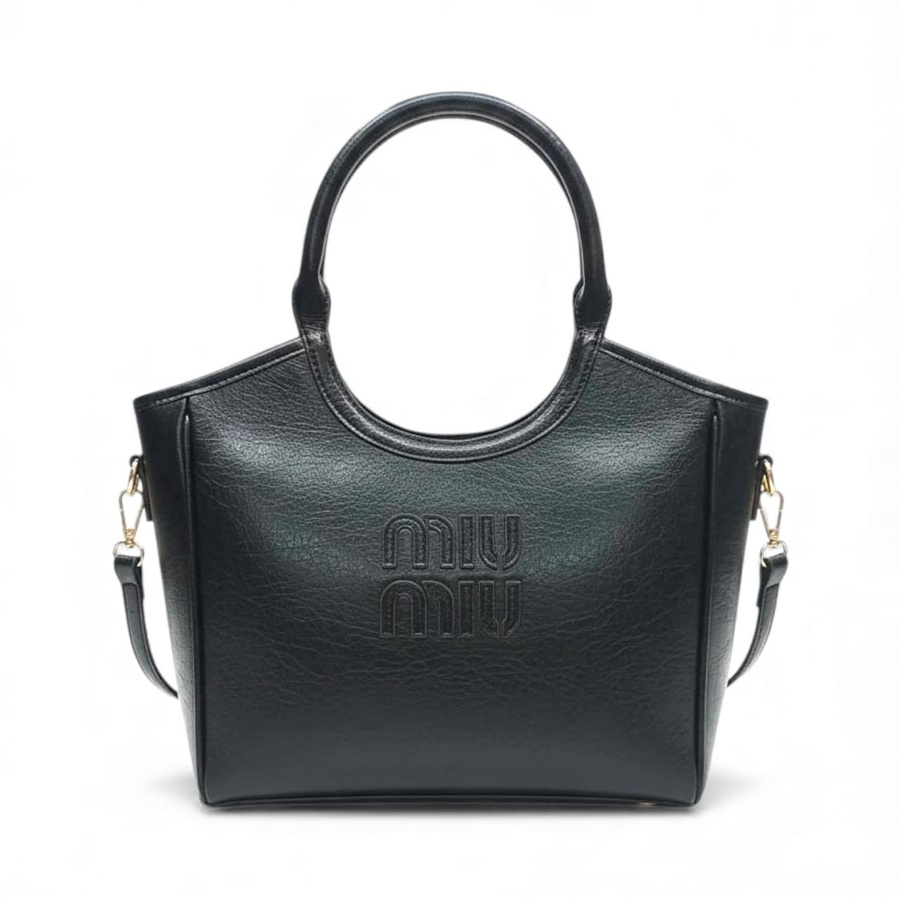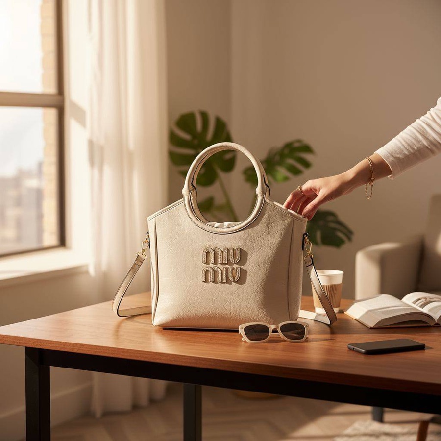 شنطة يد ستايل Miu Miu شكلها شيك وفخم ينفعك في الشغل والجامعة والخروجات الكاجوال، تصميم المسكة الدائرية بيخليها مختلفة وملفتة عن الشنط العادية. تقدر تشيليها من الإيد كقطعة كلاسيك أنيقة أو تركبي حزام الكروس القابل للفك لو حابة تبقى عملية أكتر في الحركة طول اليوم.