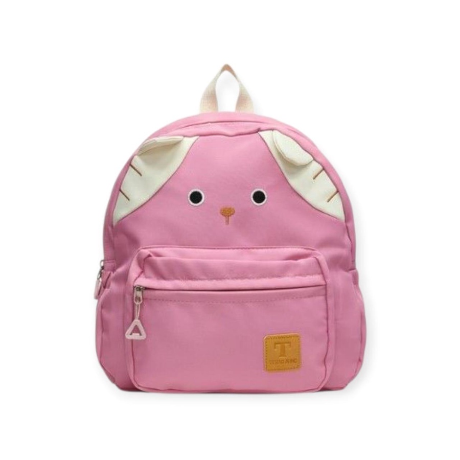 شنطة ظهر أطفال خفيفة برسمة وجه قطة وأذن بارزة، مثالية للحضانة والخروجات، فيها جيب أمامي بسوستة لحفظ السناك أو الأدوات الصغيرة.