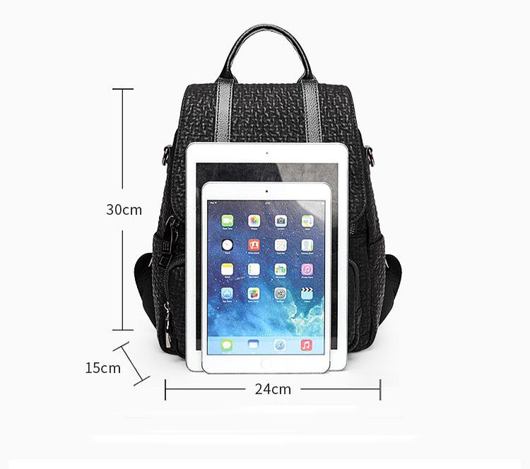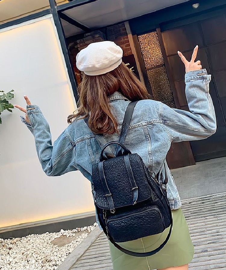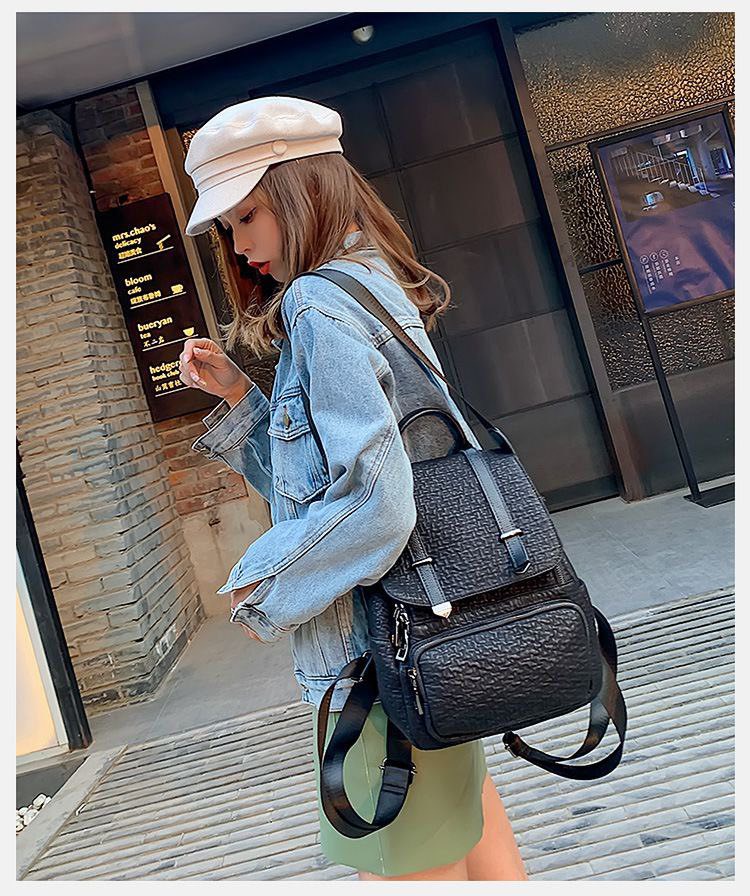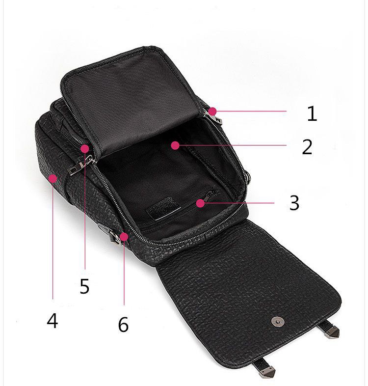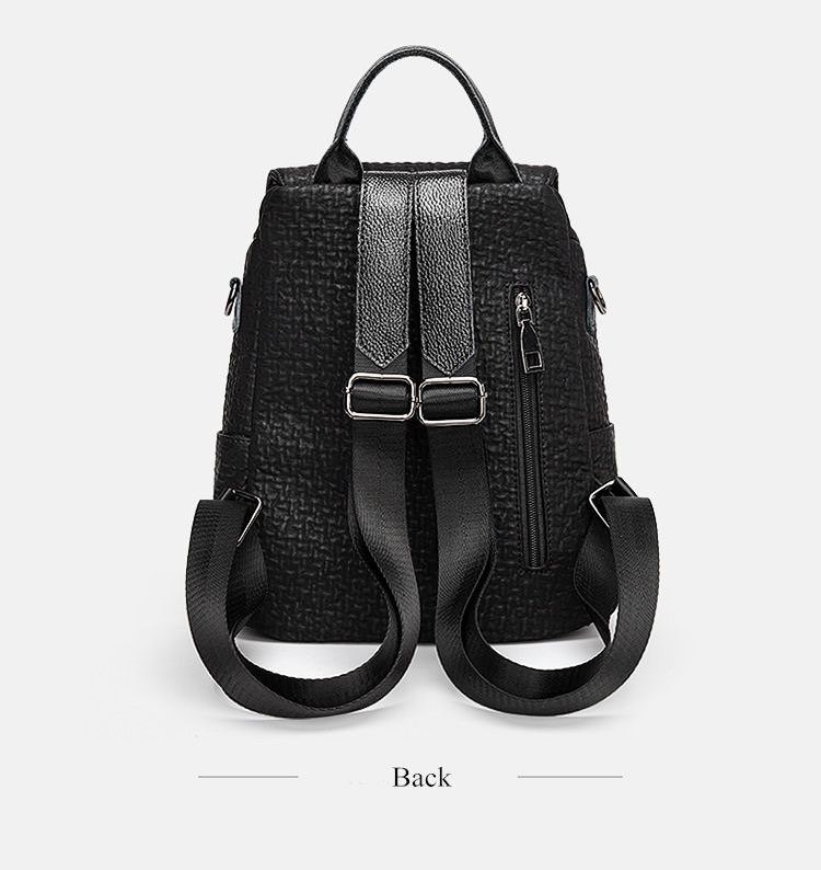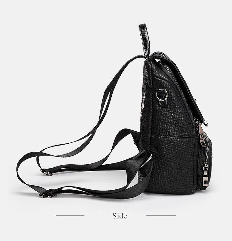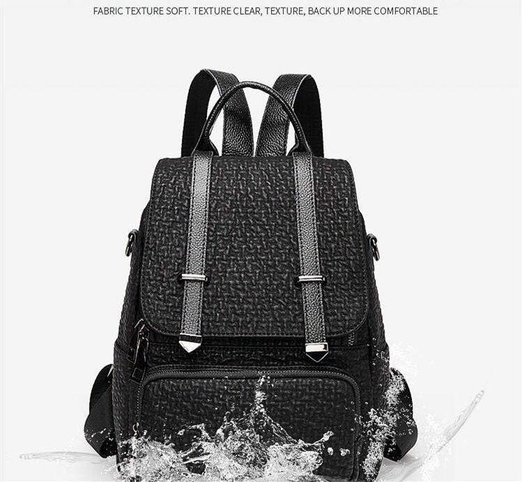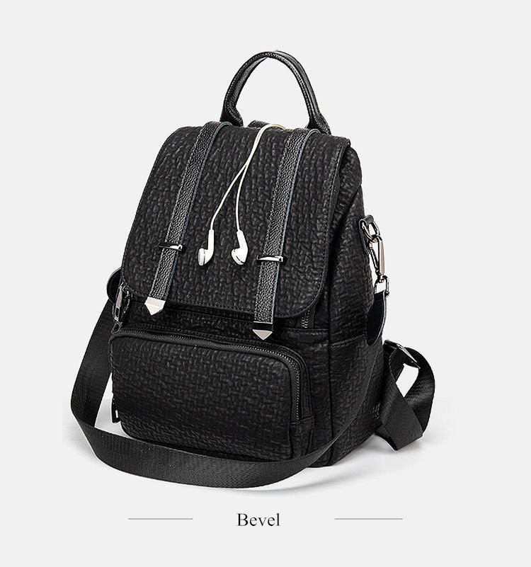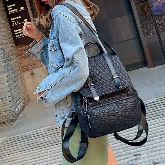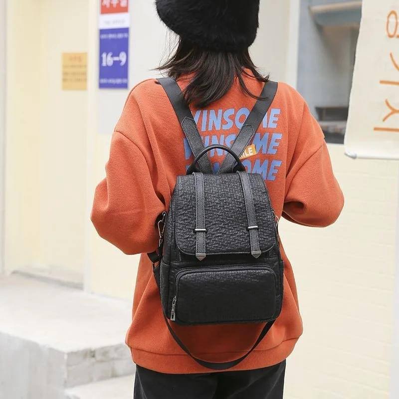 شنطة ظهر حريمى جلد أسود بتصميم فلاب علوى وأحزمة ديكورية، مزودة بجيب أمامى بسحاب وحزام كروس، مناسبة للجامعة، الشغل والخروجات اليومية.
